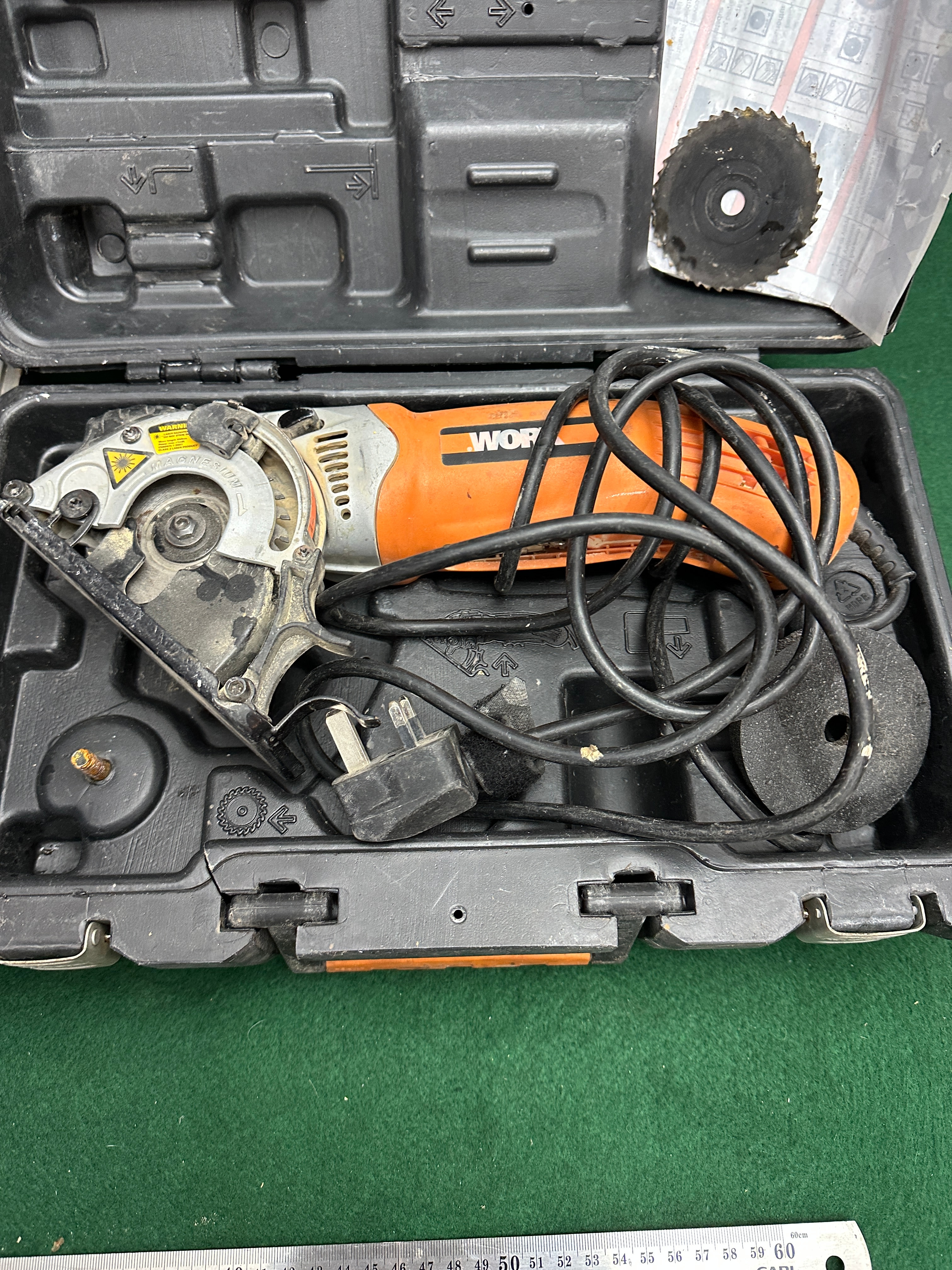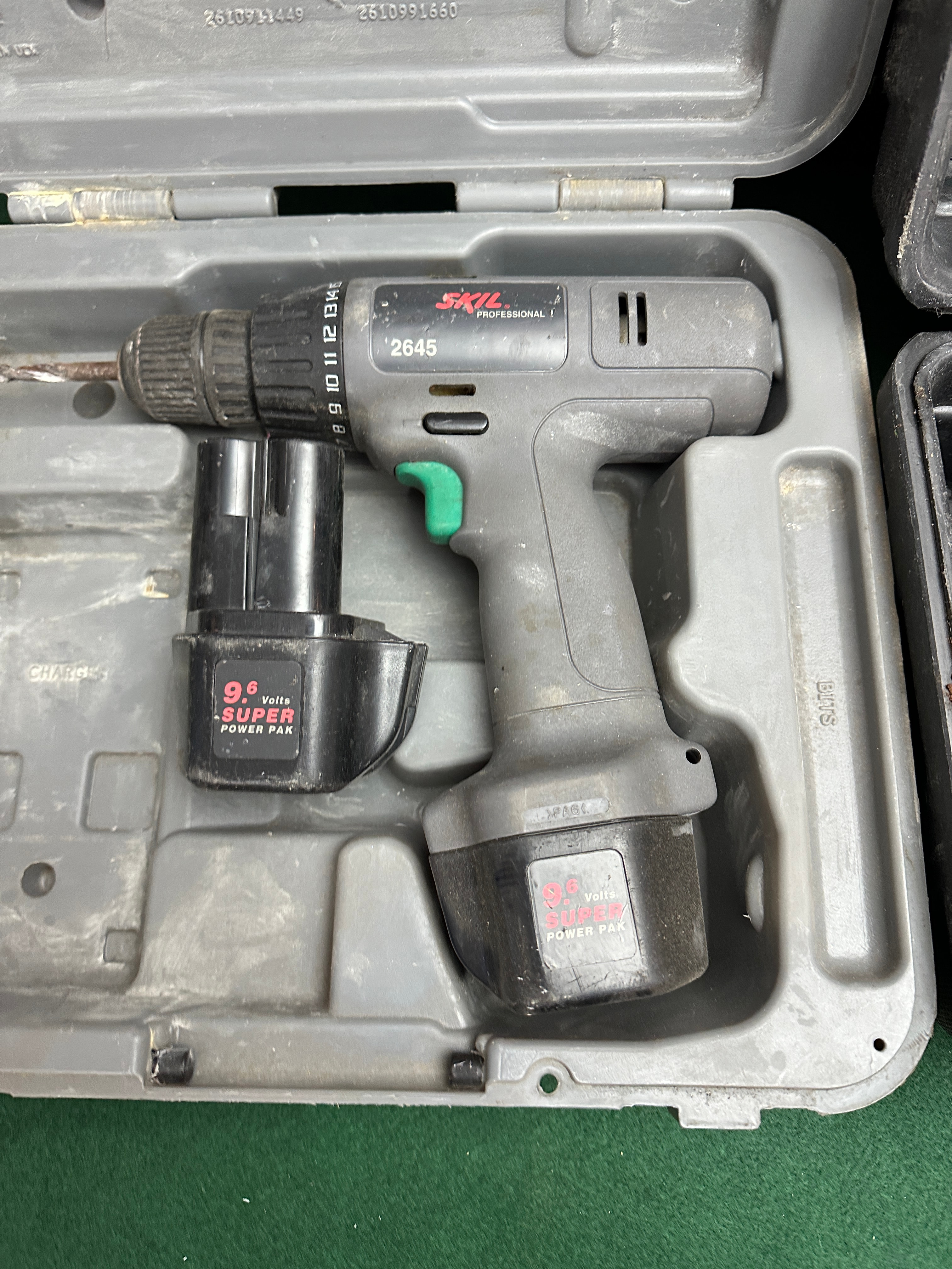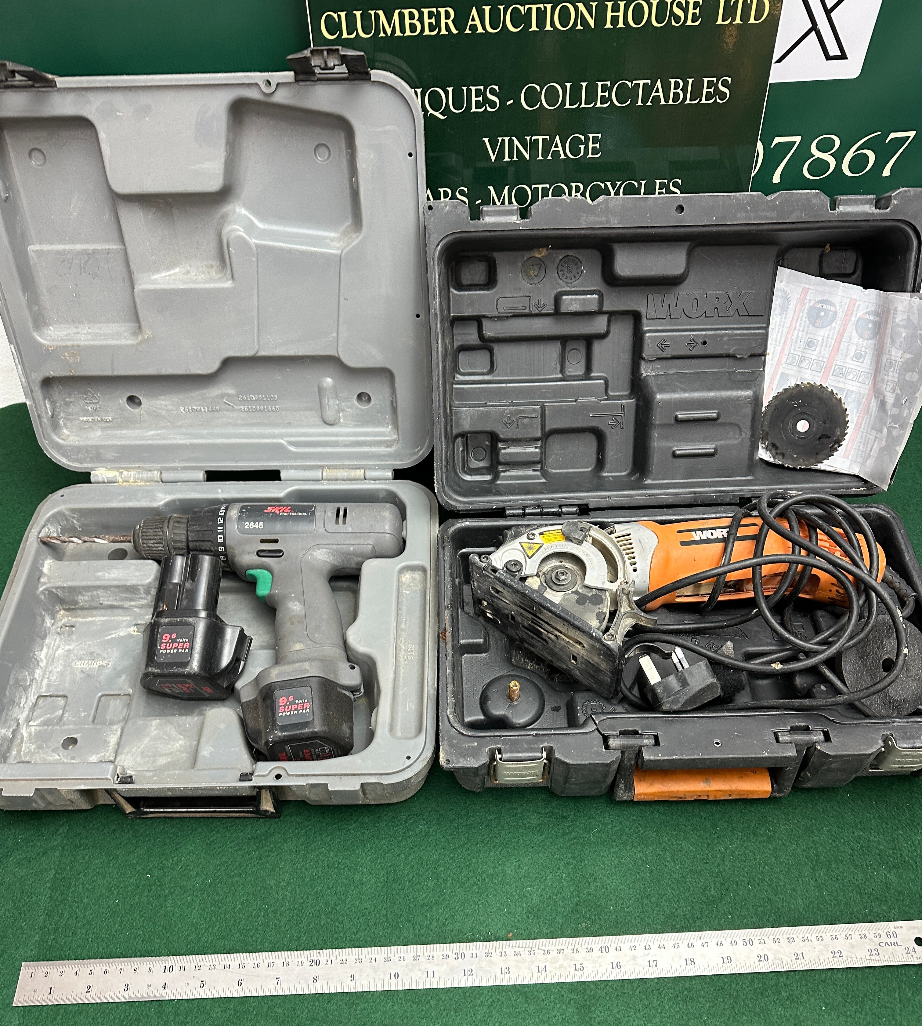 A lot comprising two power tools, each housed in its respective hard plastic carrying case. The first is a grey SKIL PROFESSIONAL! model 2645 cordless drill, featuring a green trigger and marked “9.6 Volts SUPER POWER PAK” on its attached battery. An additional spare battery is also present within its case. The second item is an orange and black compact WORX circular saw, bearing partially visible model numbers such as “WX42X” or “WX4XX”. It is equipped with a power cord terminating in a UK 3-pin plug and is accompanied by a spare blade and some paperwork within its case.