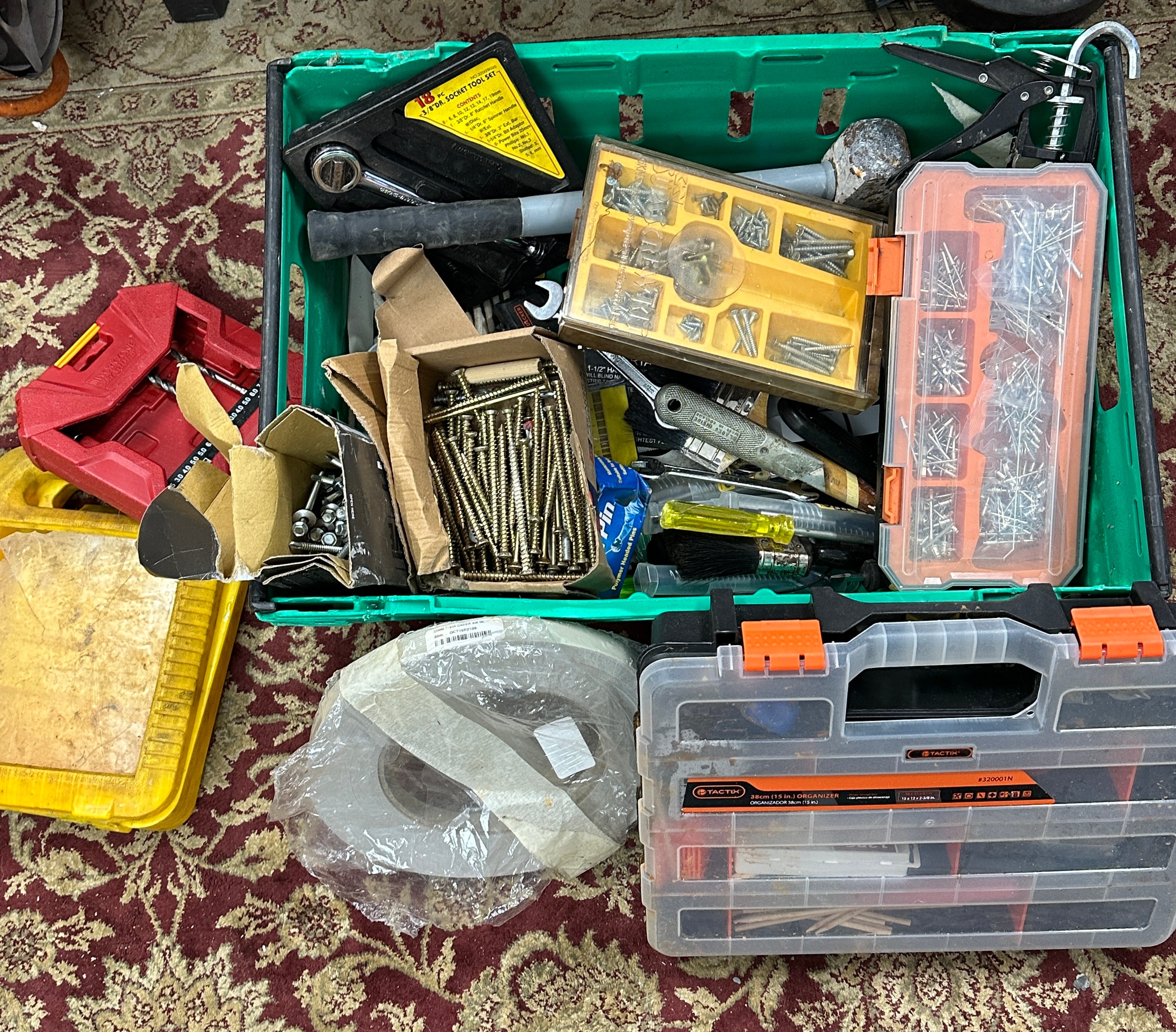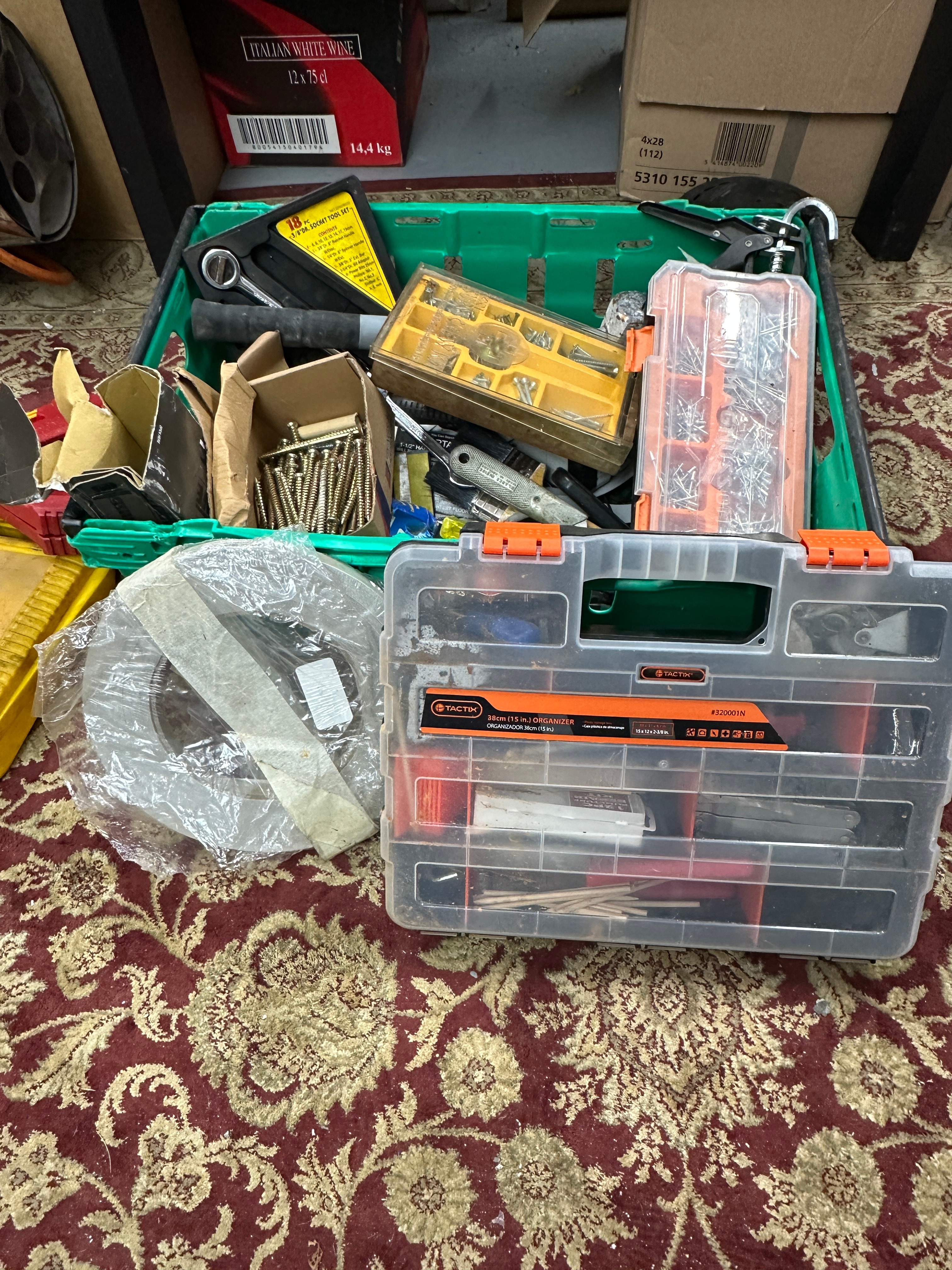 This lot comprises a collection of assorted hand tools and hardware, notably featuring a Tactix 13-Inch 30-Compartment Organizer (Model 322001N). The clear plastic TACTIX organizer features multiple internal dividers containing smaller components such as matches or toothpicks and additional fasteners. The collection also includes various metal hand tools, such as a wrench, hammer, and pliers, stored within a green plastic utility crate. Numerous screws and nails are present, housed in smaller yellow and orange plastic cases and cardboard boxes, with one item labeled “5-in-1 Power Set.” A red plastic tool case and a large roll of what appears to be adhesive tape are also part of the lot. The items are utilitarian in style and contemporary in period, constructed primarily from plastic and metal.
