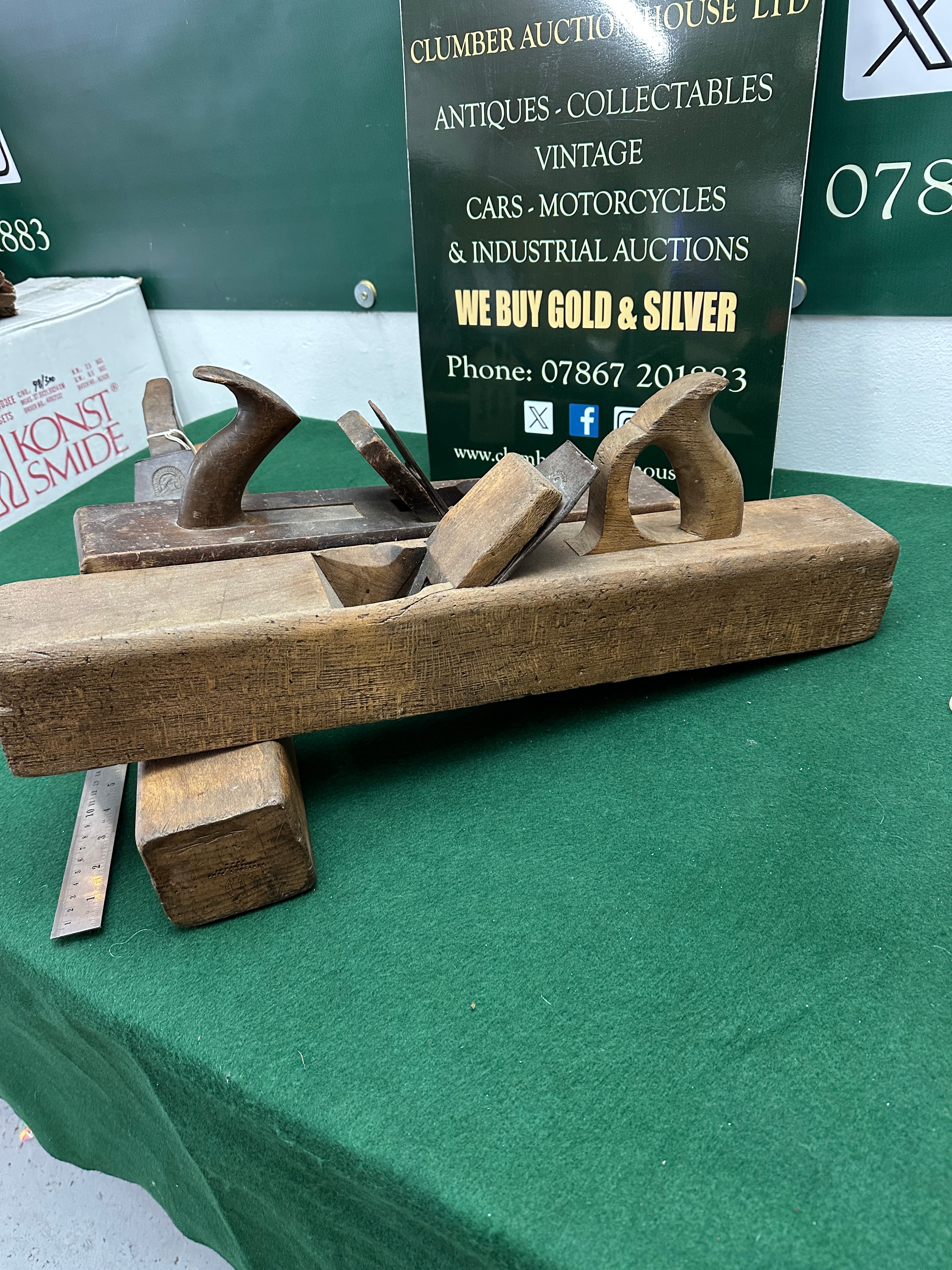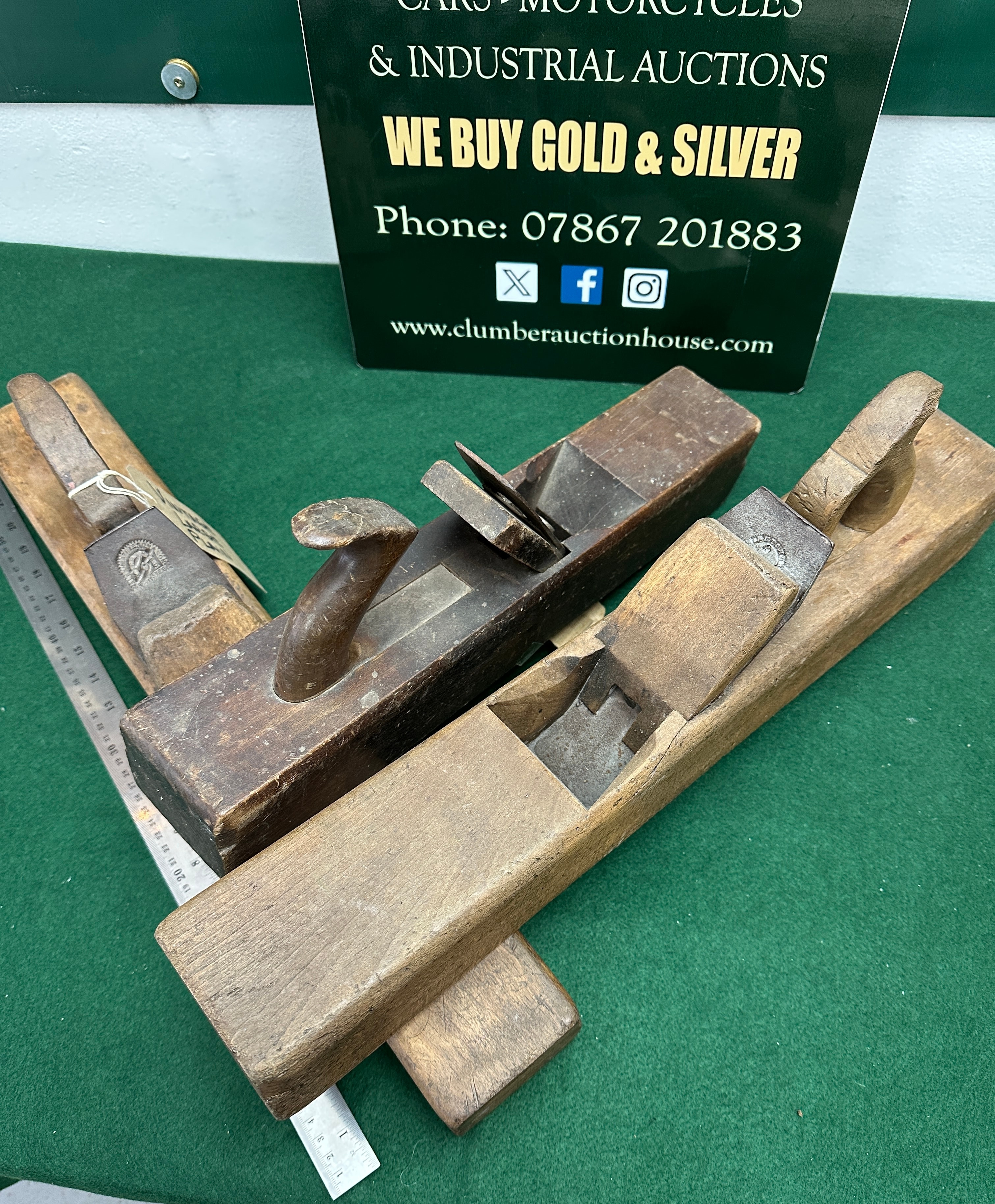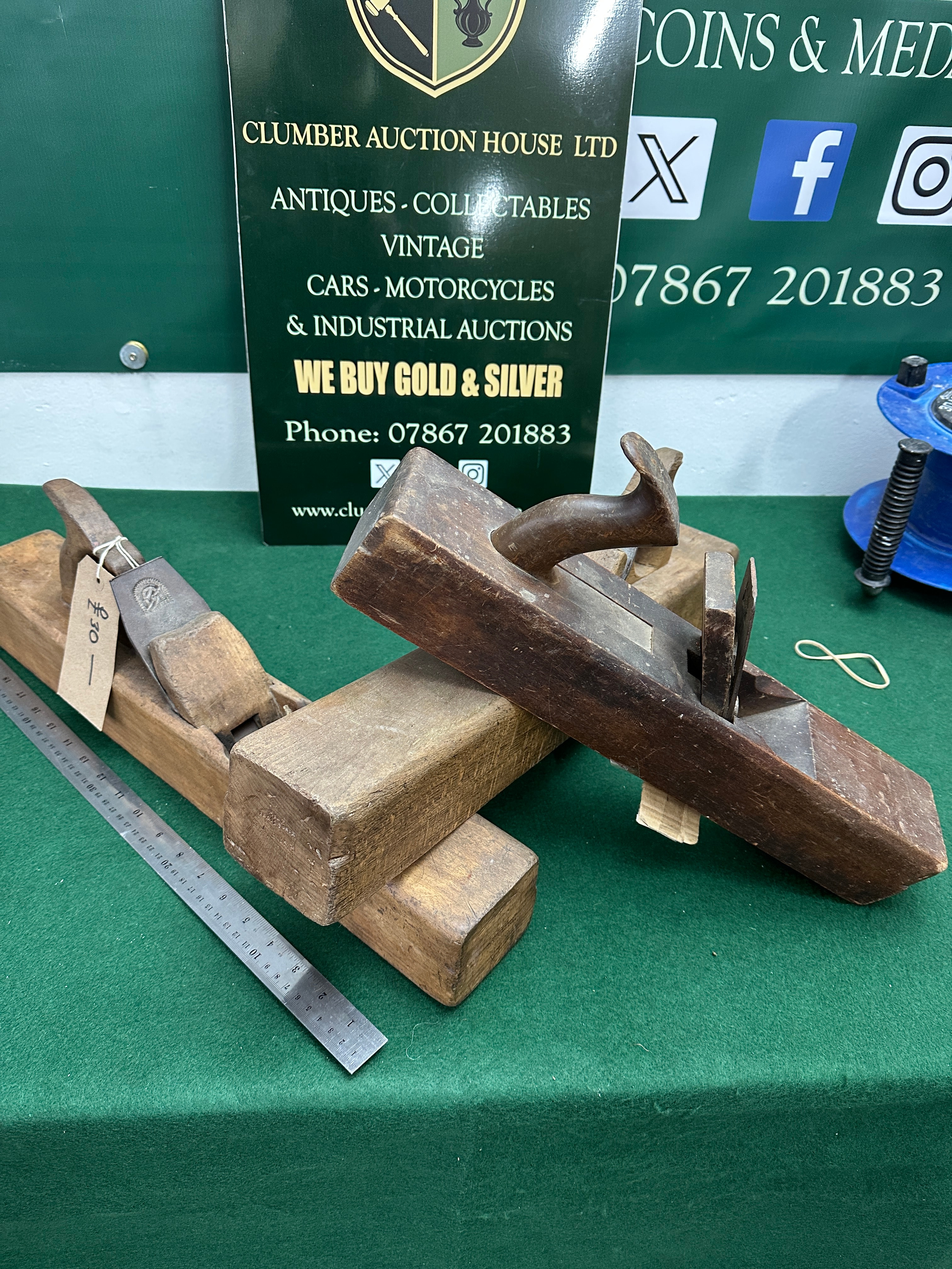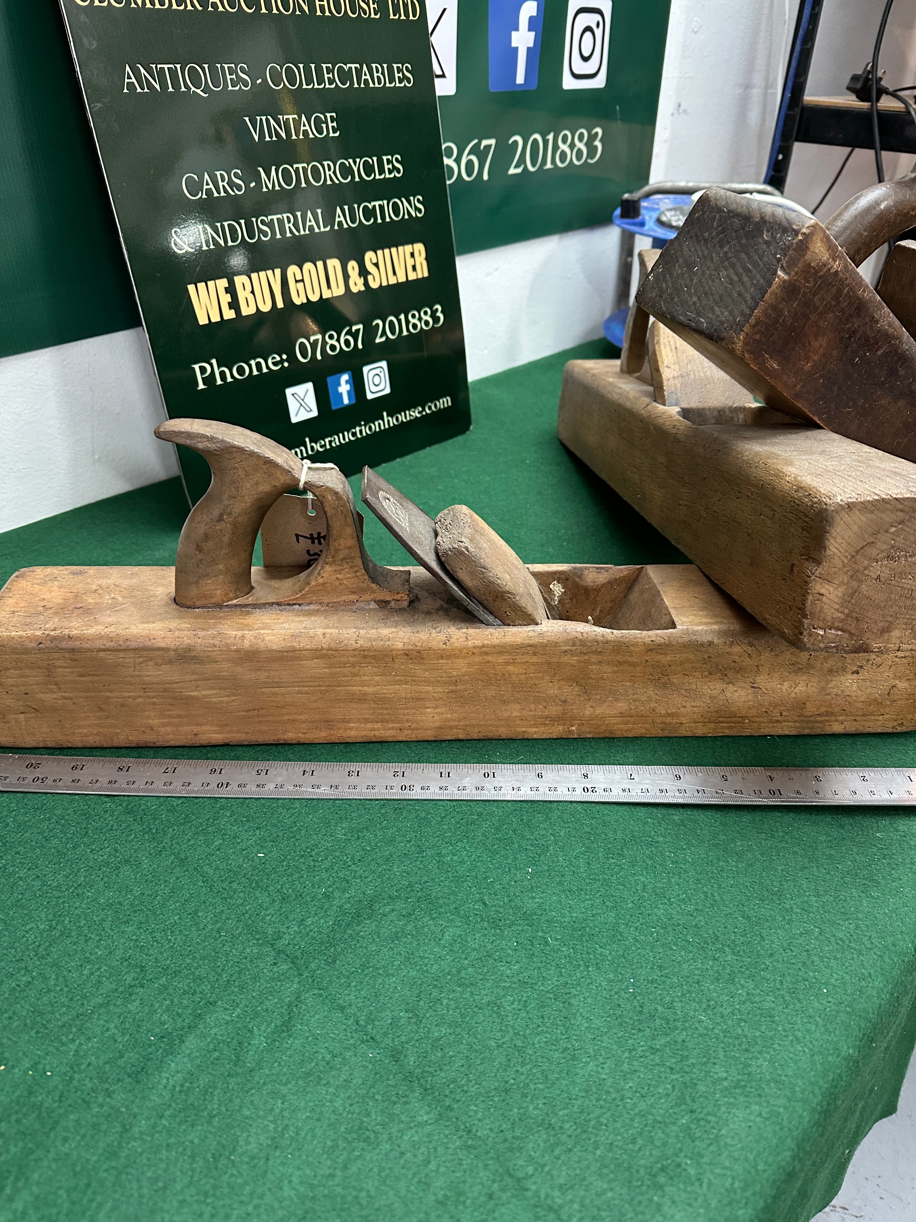This lot comprises three traditional wooden hand planes, likely dating from the late 19th or early 20th century. Each plane is constructed from a dark, aged hardwood, featuring visible grain and retaining its metal blade/iron, secured by wooden wedges. One smaller plane exhibits a faint, circular, illegible maker’s mark or stamp on its top surface, and a handwritten “£10” price tag is attached.