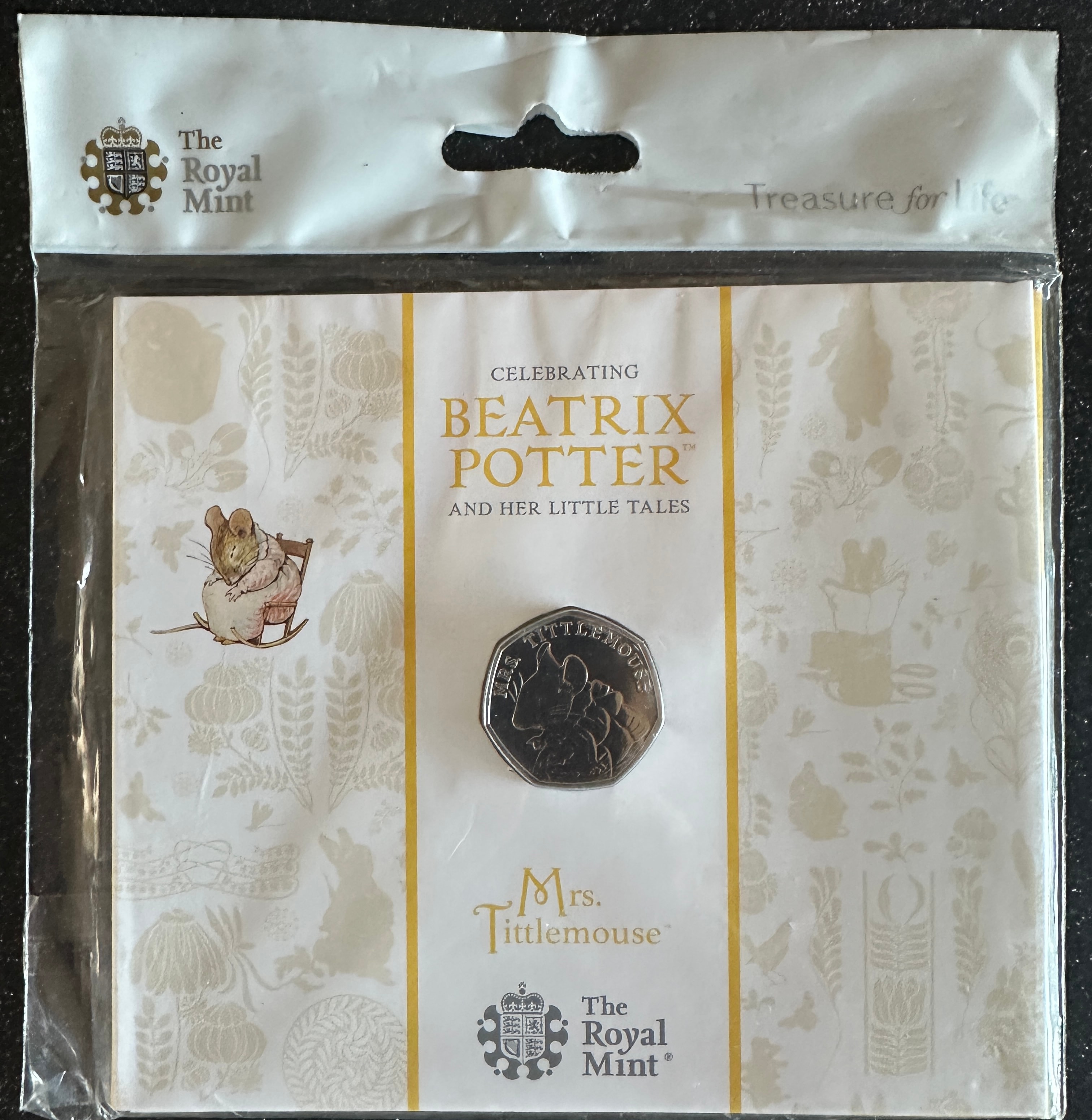 A Royal Mint 2018 Beatrix Potter ‘Mrs. Tittlemouse’ 50p Brilliant Uncirculated commemorative coin set. The silver-toned, heptagonal metallic coin features an illustration of Mrs. Tittlemouse alongside her name. It is presented sealed within a clear plastic pouch, which also contains a decorative paper card. The card, predominantly cream and white with yellow accents, displays a colored illustration of Mrs. Tittlemouse, subtle background imagery of flora and fauna, and the prominent text “CELEBRATING BEATRIX POTTER™ AND HER LITTLE TALES” and “Mrs. Tittlemouse™”. Both the card and the outer packaging bear “The Royal Mint” branding and logo, with additional text “Treasure for life.” visible on the plastic packaging.
