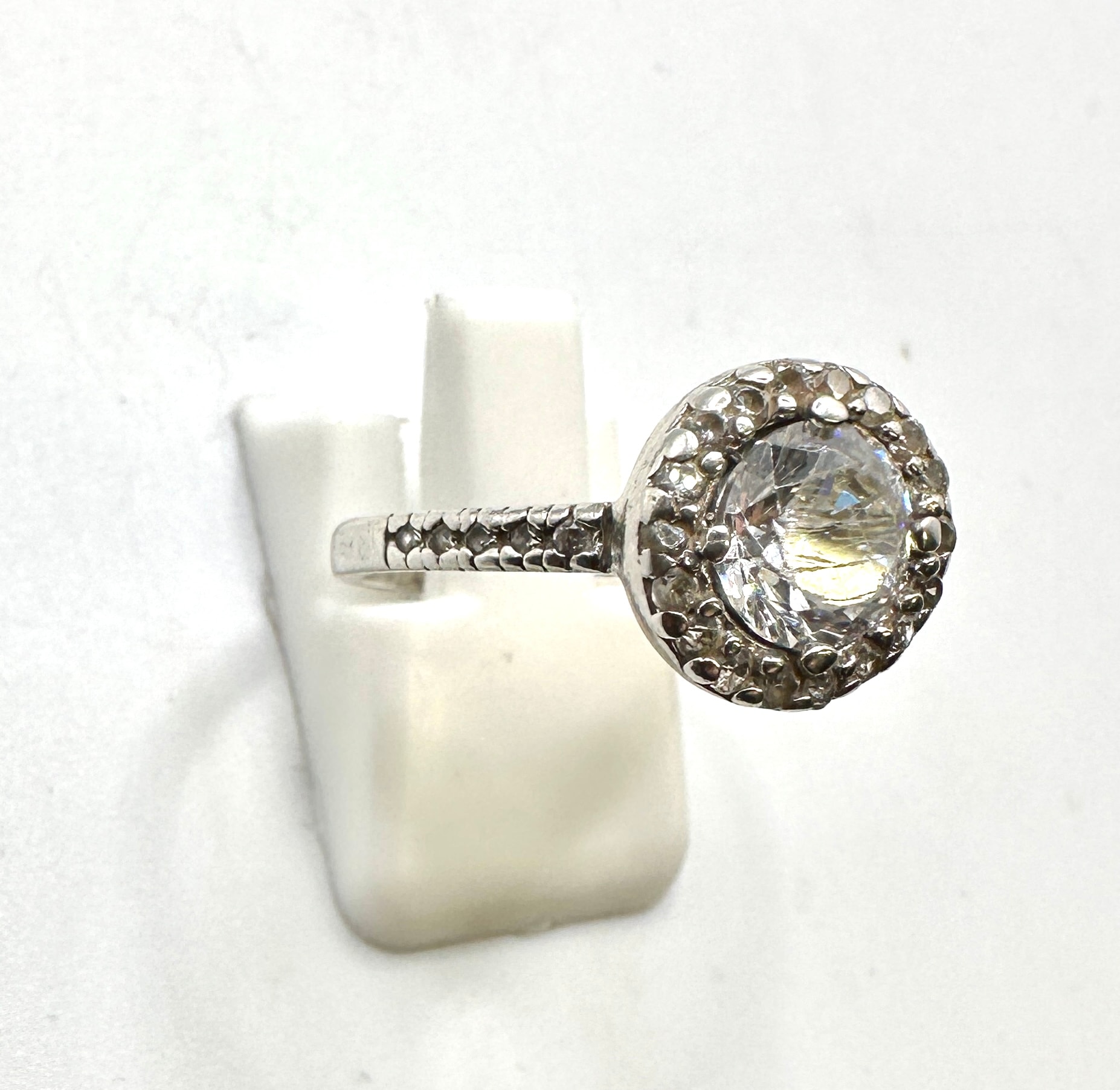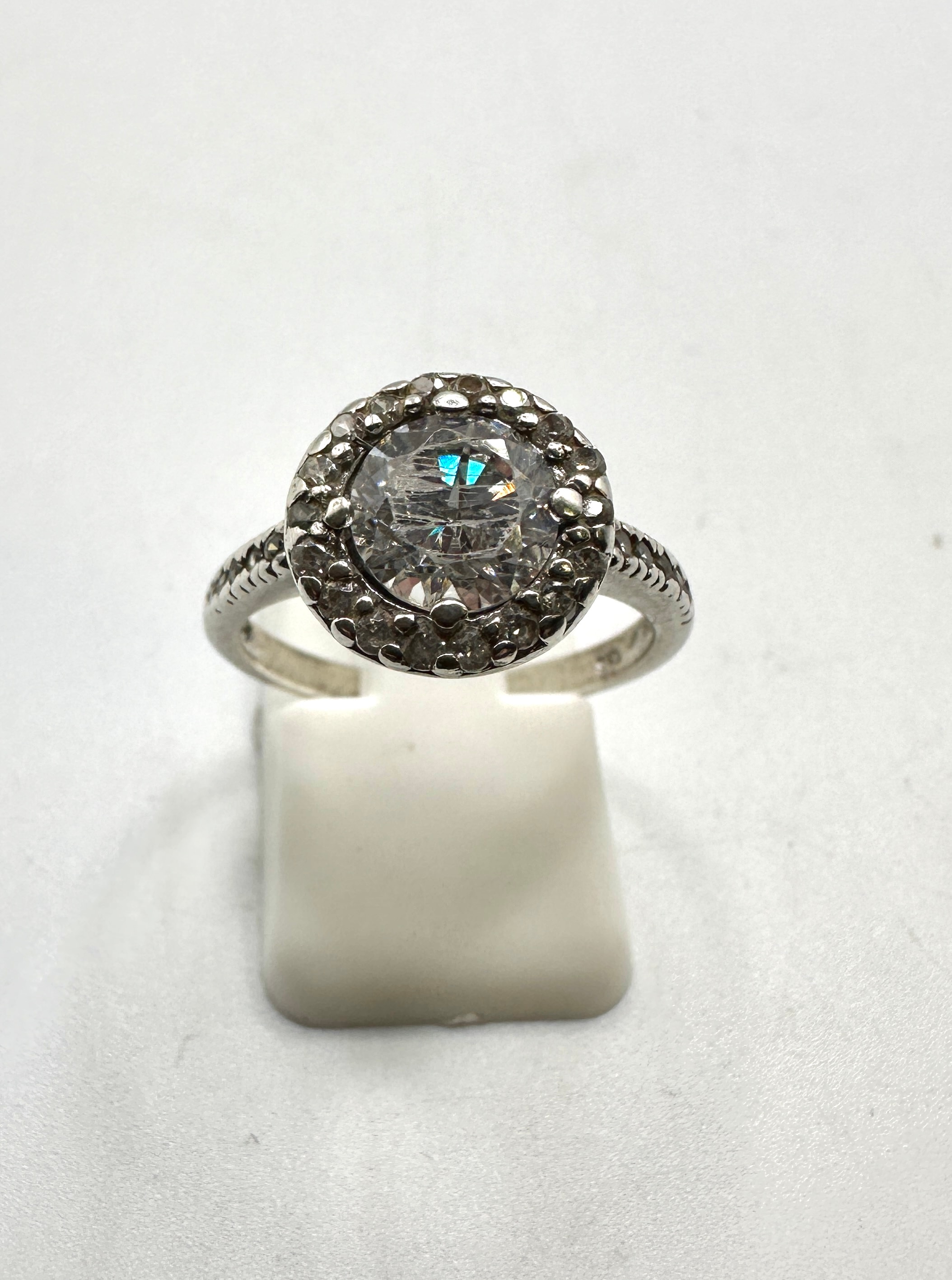 A contemporary 925 silver ring featuring a prominent central round brilliant-cut colorless stone surrounded by a halo of smaller pavé-set round stones. Further small stones decorate the shoulders of the band, while the remainder of the shank is polished. The overall design is consistent with a modern halo ring.