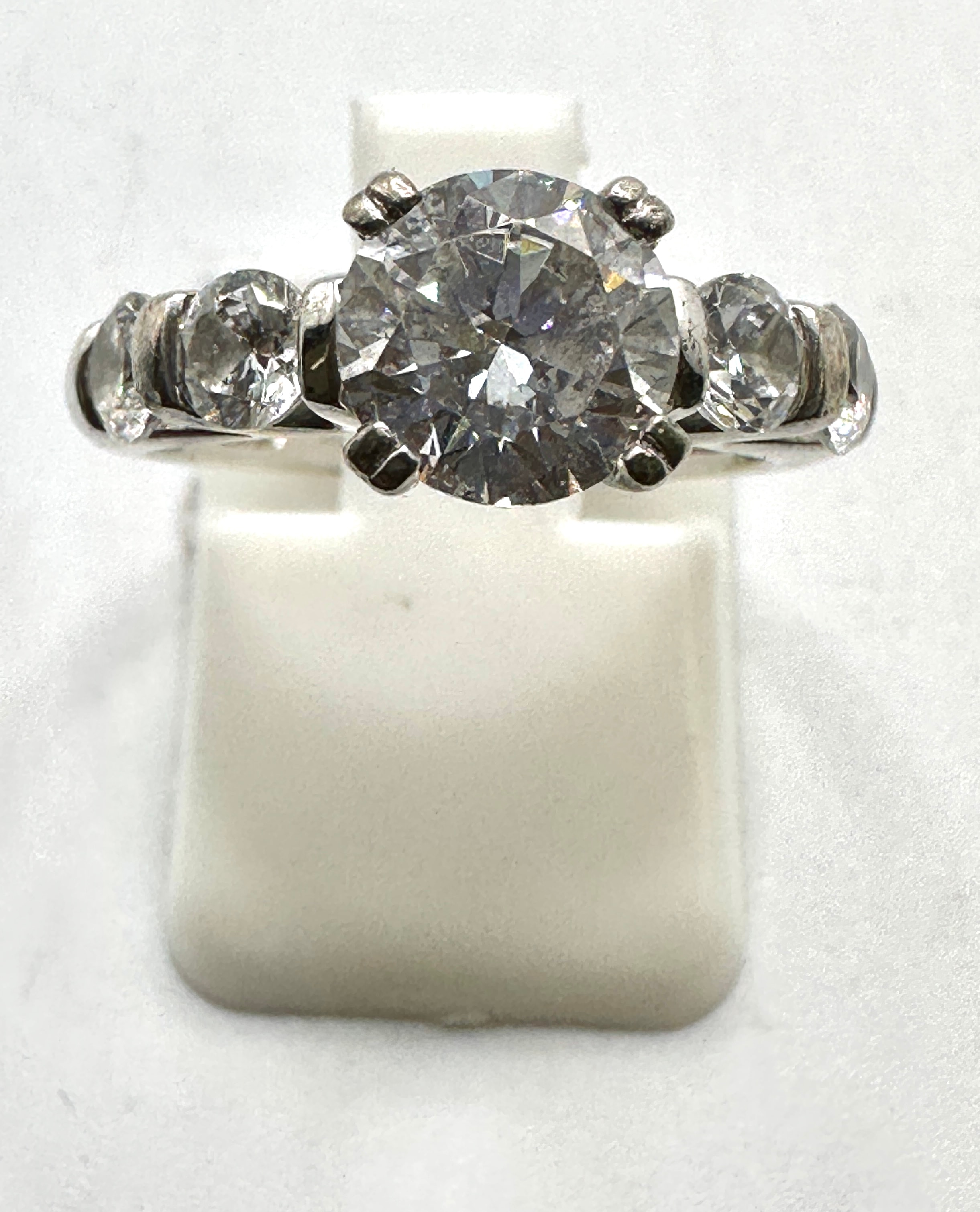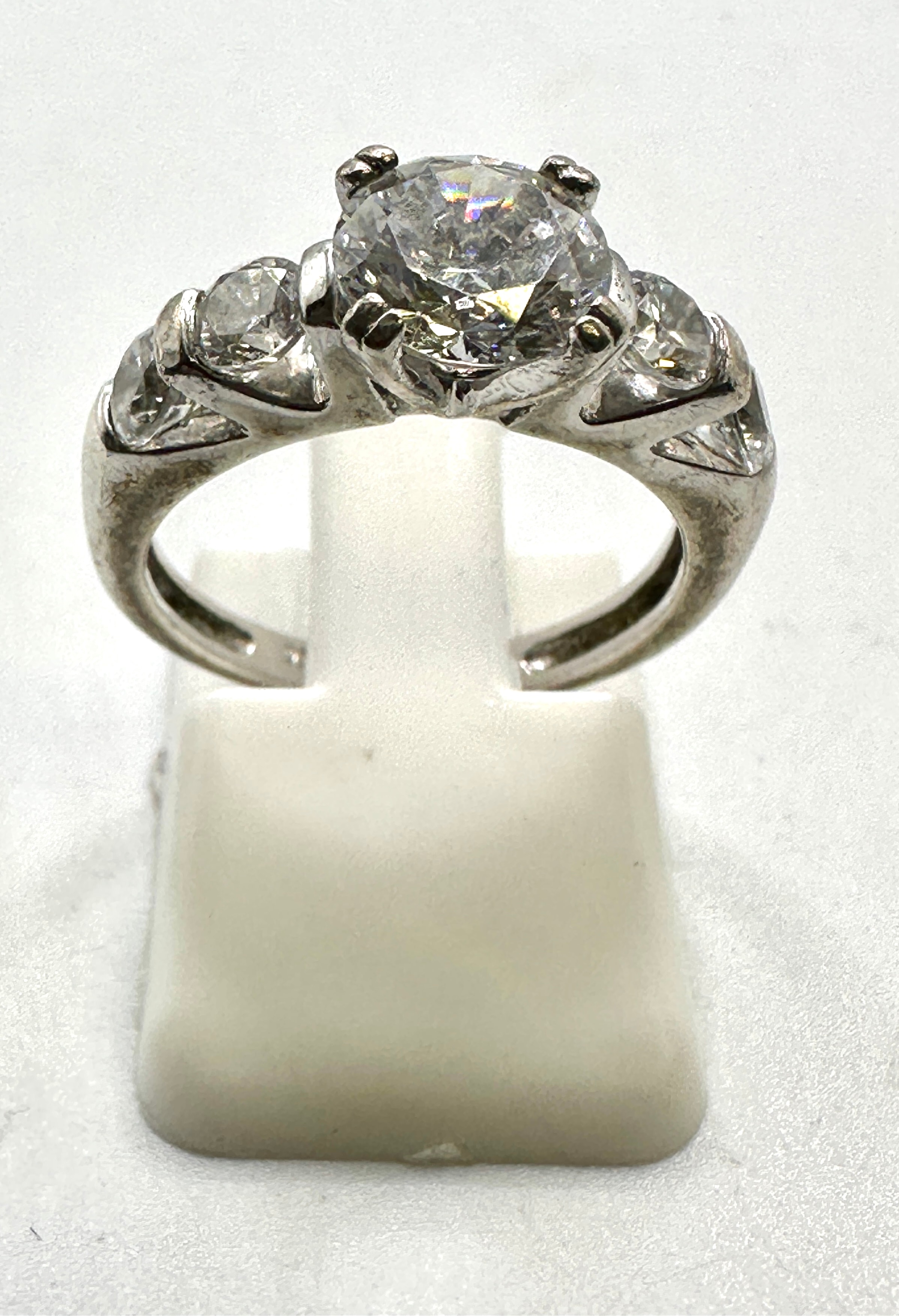 A five-stone ring crafted from 925 silver, featuring a prominent round brilliant-cut central stone secured by four prongs. It is flanked on each side by two smaller round brilliant-cut stones set into the band. The band exhibits subtle decorative openwork elements near the shoulders. The clear, brilliant-cut stones display strong light reflection.
