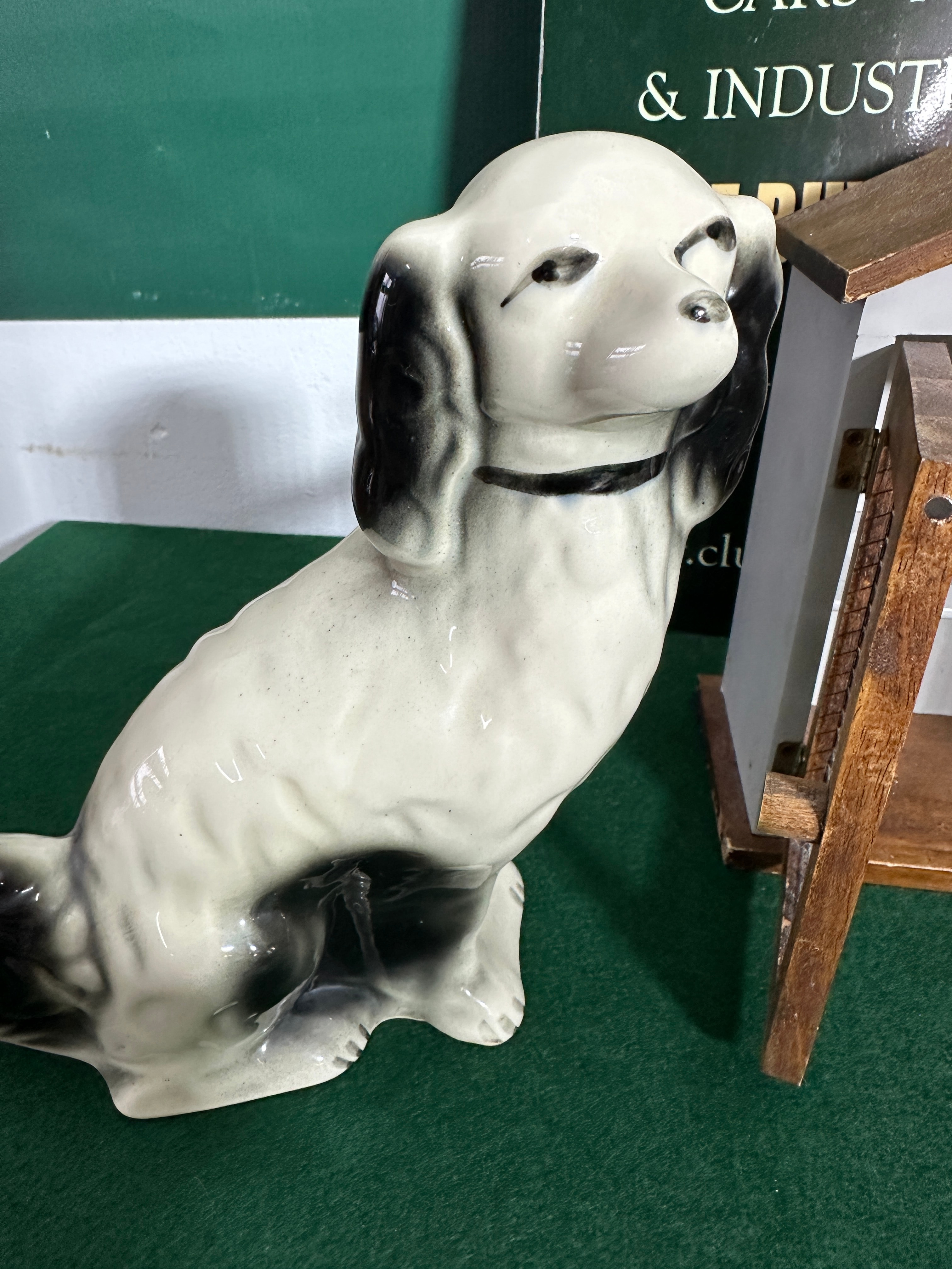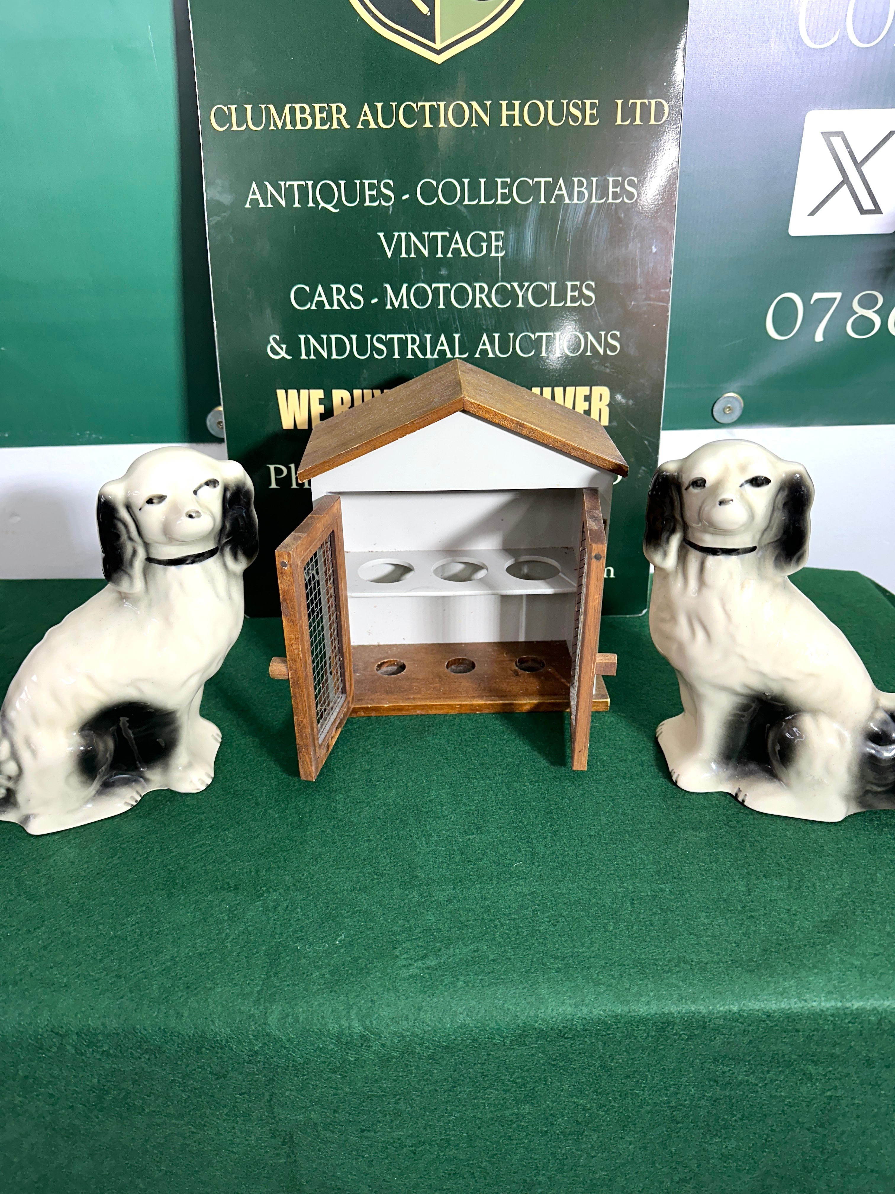 A wooden egg storage house, flanked by a pair of glazed ceramic seated dog figurines. The house features a gabled roof and two hinged wooden doors with metal mesh inserts. The interior is fitted with two shelves; the upper, white-painted shelf displays three prominent circular cut-outs, while the lower, natural wood shelf has three smaller circular depressions, consistent with egg storage. The accompanying ceramic dog figurines are depicted seated, with black and white coloration reminiscent of spaniels. No visible manufacturer’s marks or text are present on any of the items.