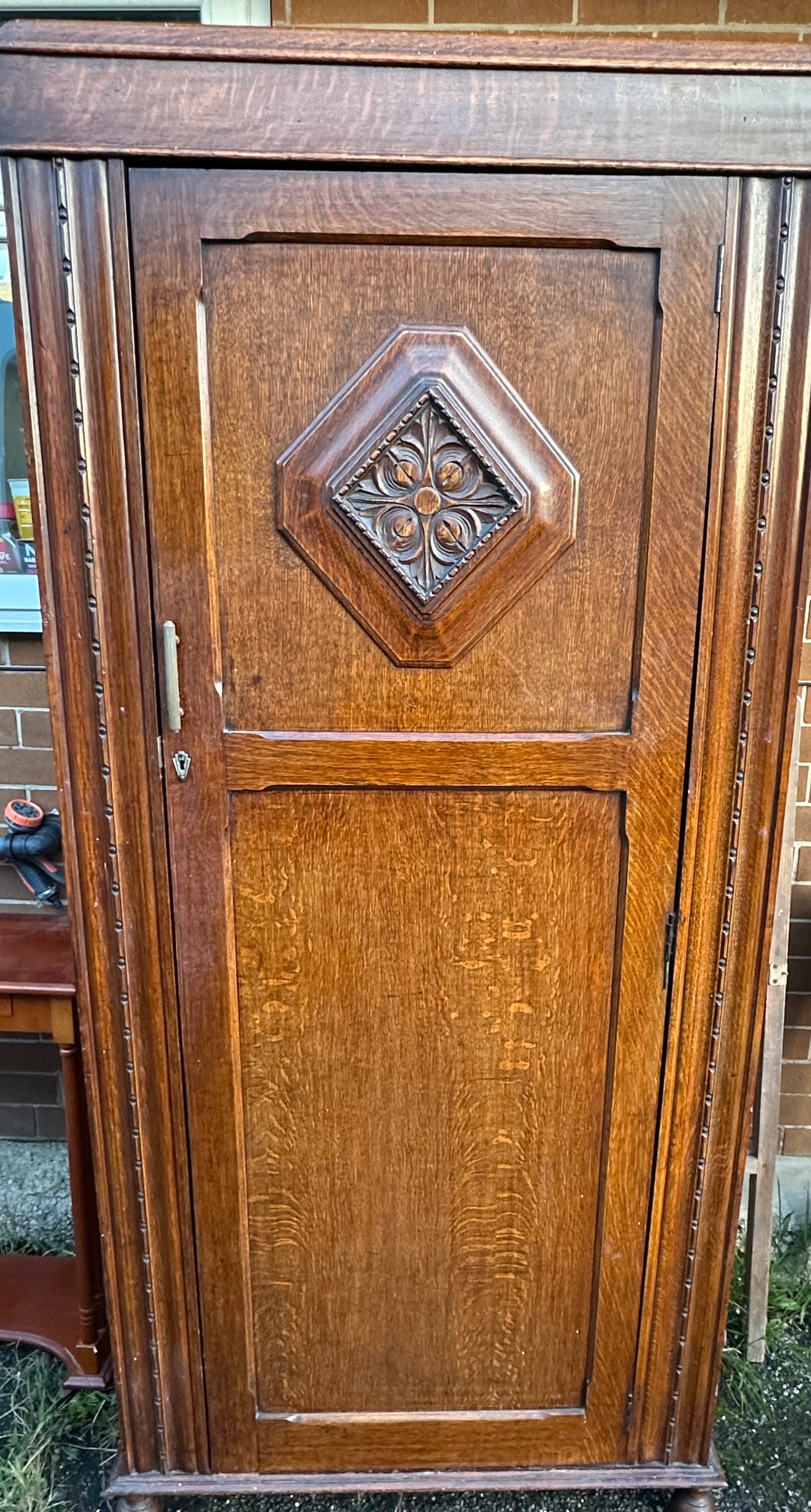 An Arts and Crafts / Mission Revival oak hall wardrobe or cupboard, dating to the early 20th century. Constructed from quarter-sawn oak, exhibiting a warm, dark brown finish and prominent ray fleck in the grain. The robust, paneled construction features a single door with an upper recessed panel containing a raised, diamond-shaped insert with a deeply carved central rosette or floral motif. Vertical stiles flanking the door are reeded and adorned with evenly spaced small, round bosses. A simple, elongated metal handle and keyhole escutcheon are present on the left side of the door. The piece is finished with a molded top cornice and rests on visible turned feet.