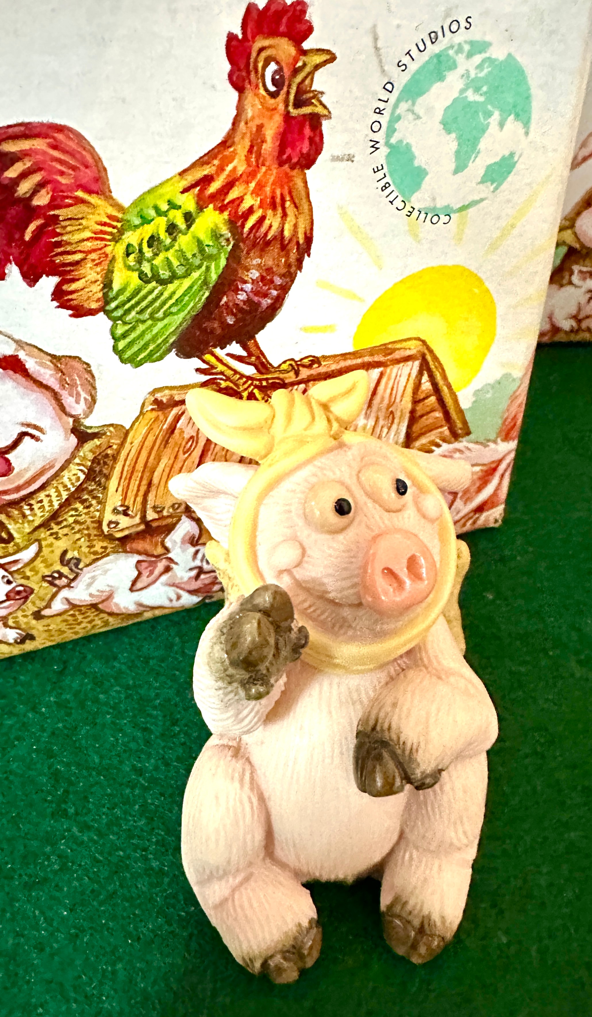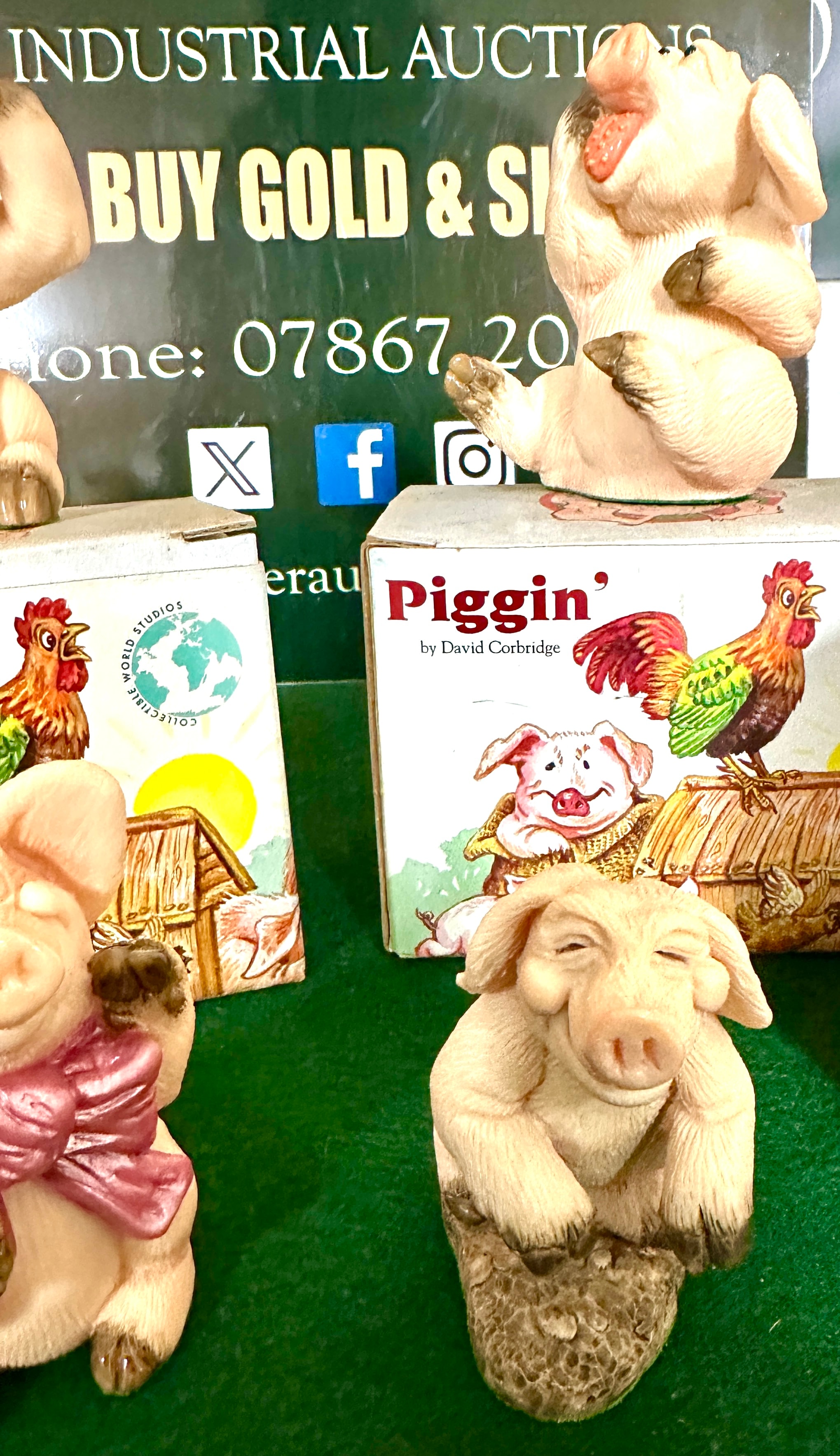 A group of six ‘Piggin” figurines by David Corbridge, produced by Collectible World Studios. Each figurine is crafted from resin or a similar composite material, depicting a pig in various playful poses with light pink details on snouts and hooves. Some figurines feature additional elements like bows or bonnets. Four of the figurines are accompanied by their original cardboard boxes, prominently branded “Piggin'” and marked “by David Corbridge” and “COLLECTIBLE WORLD STUDIOS” with a globe logo. The boxes display coordinating cartoon illustrations of pigs and a rooster in a farm setting. The overall style suggests modern collectible items.