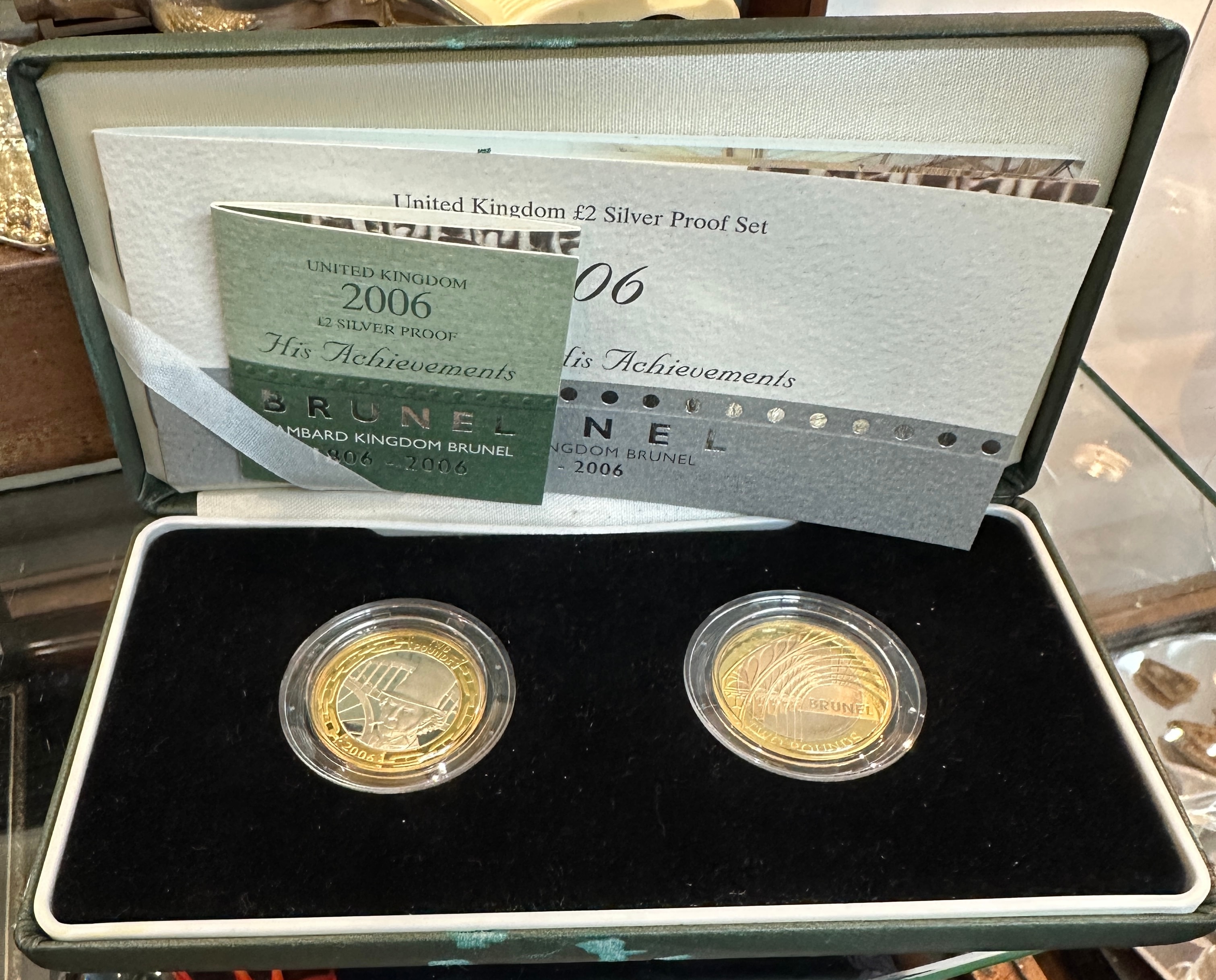A Royal Mint 2006 United Kingdom £2 Silver Proof Set, commemorating Isambard Kingdom Brunel. The set comprises two encapsulated bi-metallic £2 coins, each dated 2006 and bearing the inscription ‘BRUNEL’ and ‘TWO POUNDS’. The coins feature distinct commemorative designs related to Isambard Kingdom Brunel’s achievements. It is presented in its original dark green presentation case with a black velvet-lined interior and accompanying informational cards. The documentation confirms the set as a ‘United Kingdom £2 Silver Proof Set’ from ‘2006’, highlighting ‘His Achievements’ and ‘Isambard Kingdom Brunel’ as the theme.