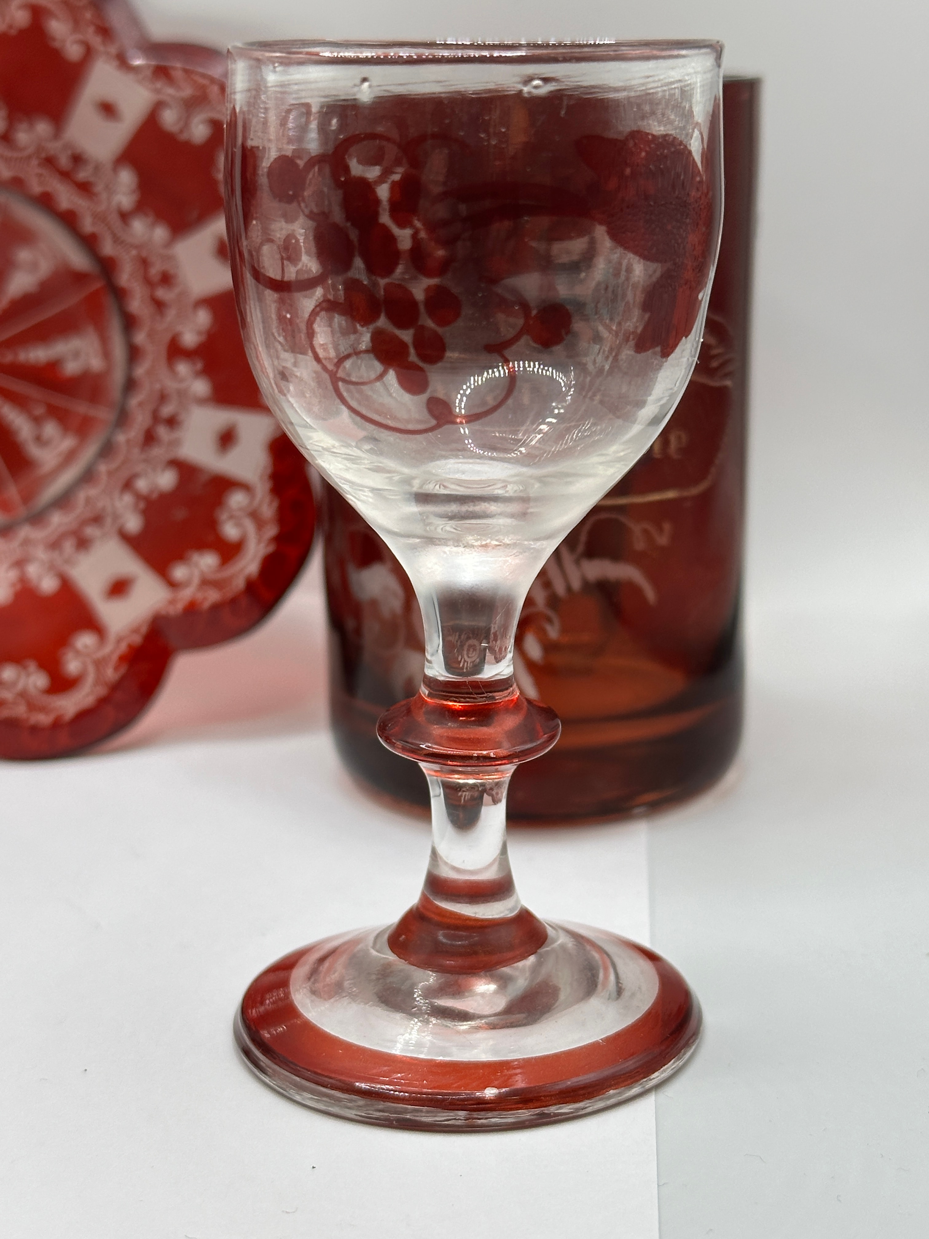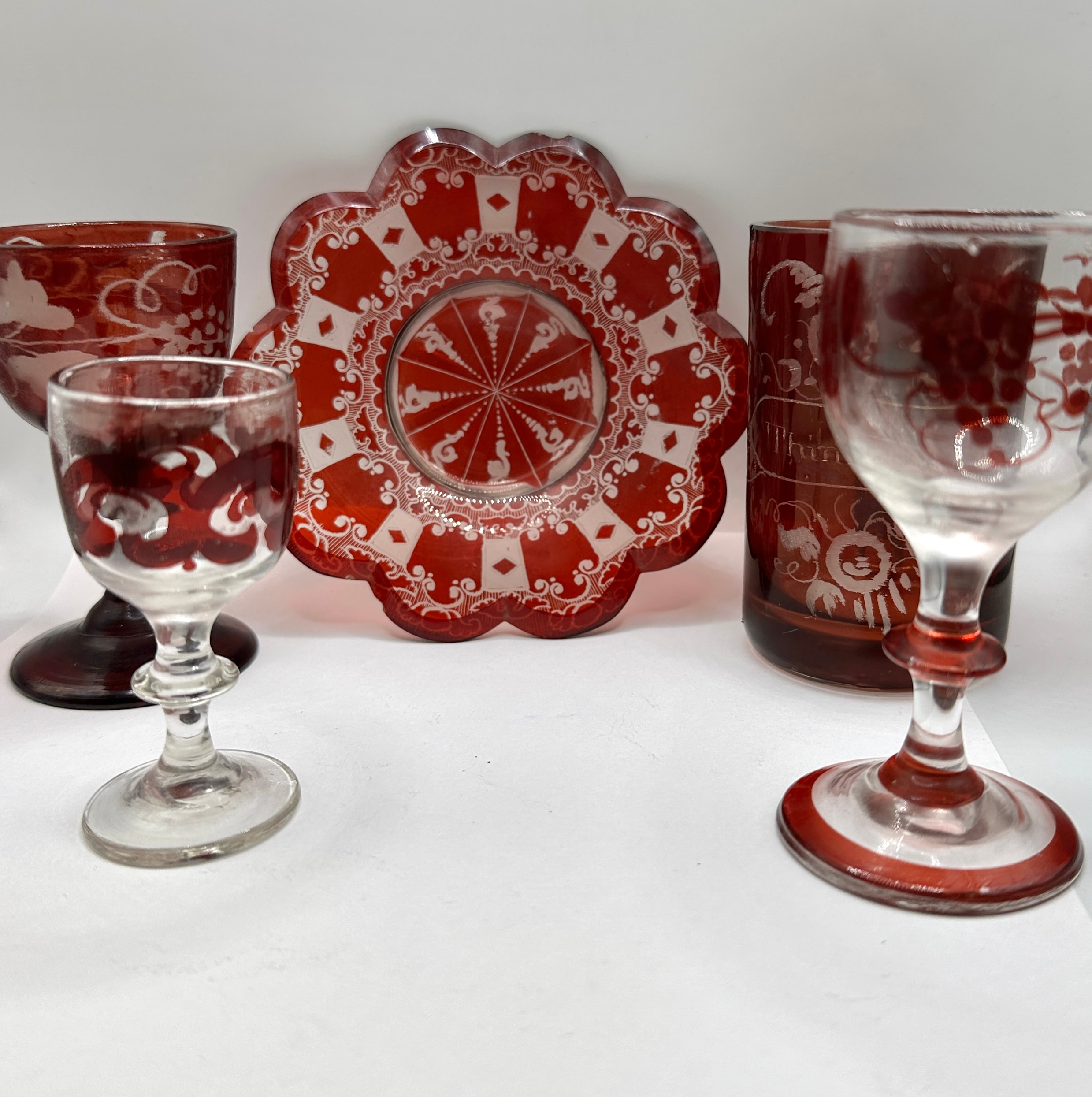 A collection of five pieces of Bohemian ruby etched to clear glass, featuring intricate clear cut-back or etched designs. The set includes three stemmed glasses of varying sizes and patterns (one largely clear with a red stem and cut design, one mostly red with clear etched foliage, and one primarily red with clear etched grapes), one cylindrical tumbler also decorated with clear etched designs, and a scalloped decorative plate. The plate displays a central starburst motif surrounded by extensive scrollwork, lattice patterns, and diamond shapes. No discernible maker’s marks or text are visible.