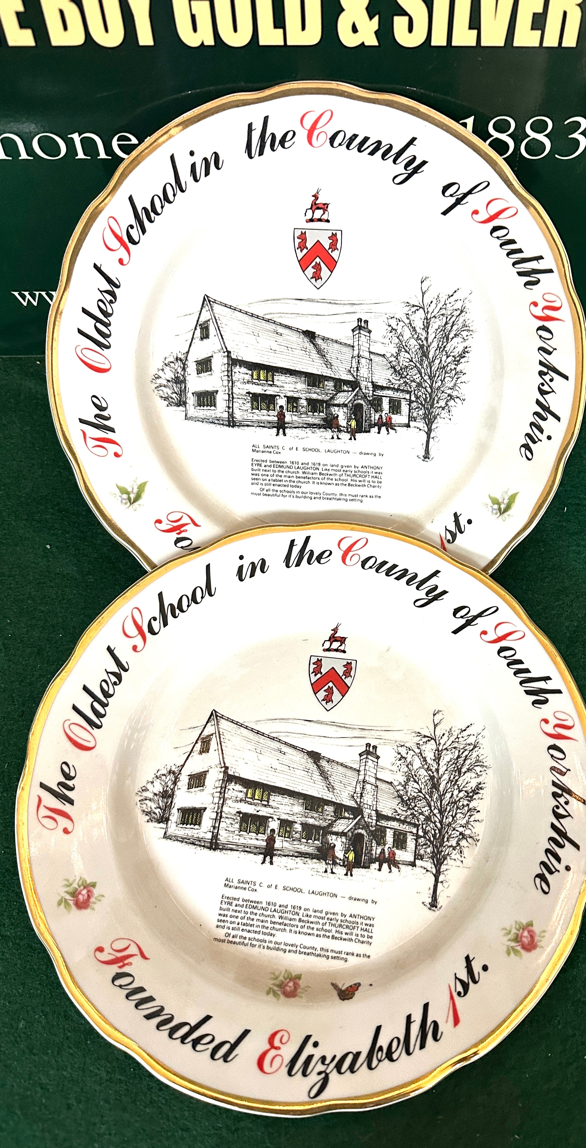 A pair of commemorative ceramic plates by Pear Tree Pottery, depicting All Saints C. of E. School, Laughton. Each plate features a central monochrome illustration of the stone building identified as “ALL SAINTS C. of E. SCHOOL, LAUGHTON,” drawn by Marianne Cox, with children visible outside. Above the illustration is a coat of arms displaying a red chevron with three animal heads, surmounted by a deer. The upper rim of both plates reads “The Oldest School in the County of South Yorkshire.” The lower plate also bears the inscription “Founded Elizabeth 1st.” and is adorned with small floral motifs, while the upper plate shows a partial “To” at the bottom. Both plates have decorative gilt scalloped rims. An informational text block beneath the illustration details the school’s founding between 1610 and 1619 by Anthony Eyre and Edmund Laughton, mentioning William Beckwith as a benefactor and its identity as the Beckwith Charity today.