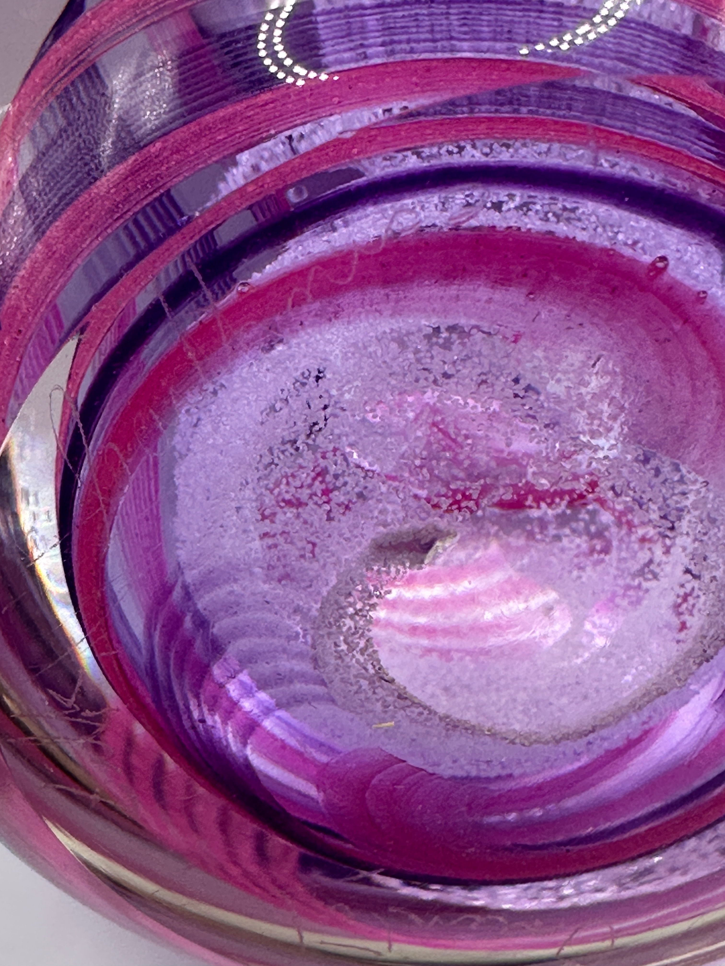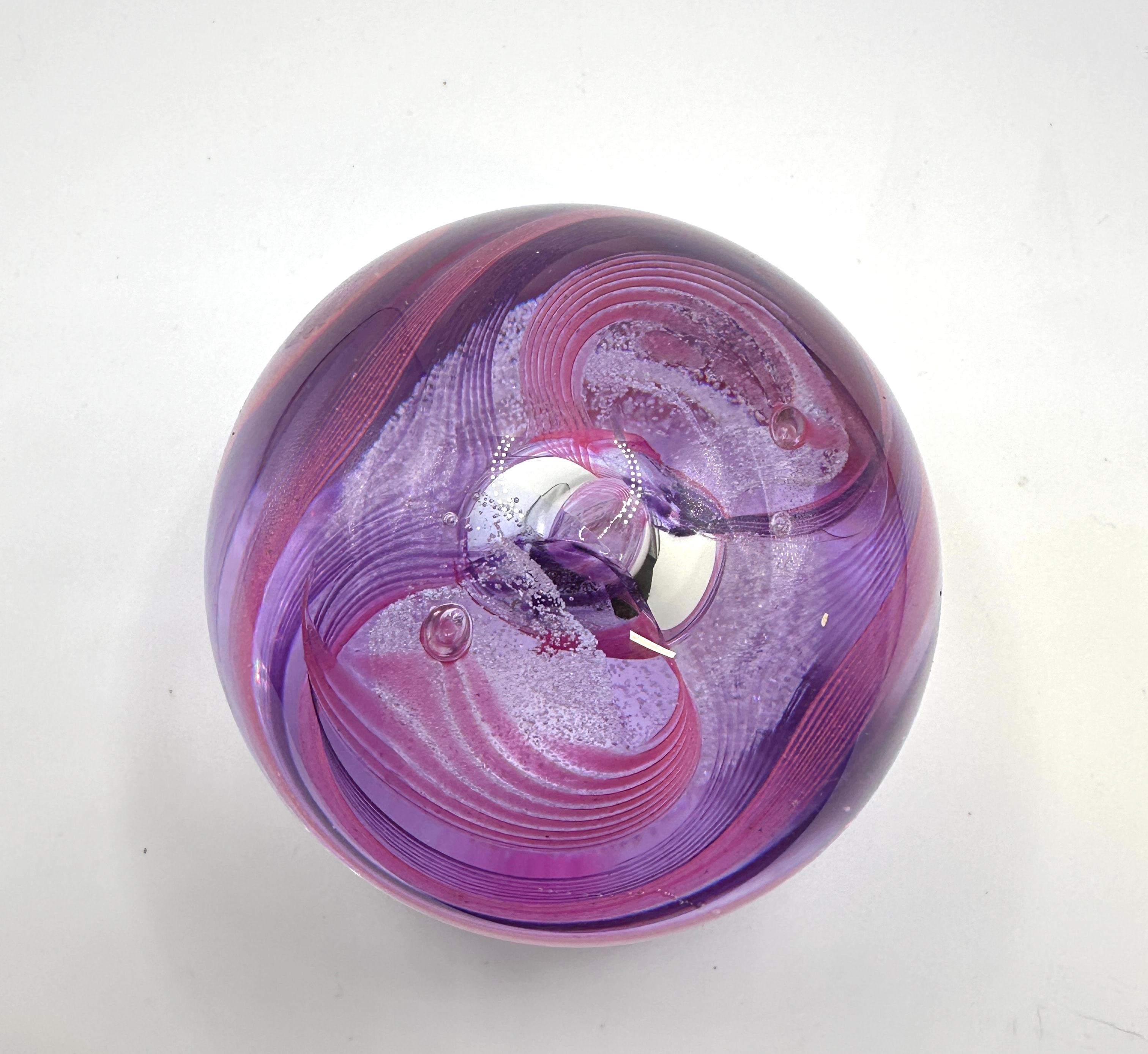 A Caithness Art Glass ‘Oriental Silk’ paperweight. This spherical art glass paperweight exhibits a modern aesthetic with an intricate internal design of swirled bands in various shades of purple, magenta, and pink, interspersed with areas of white and clear glass, some featuring fine internal effervescence or controlled bubbles. It is crafted from clear glass encasing these vibrant patterns. No discernible external text, signatures, or maker’s marks are visible.
