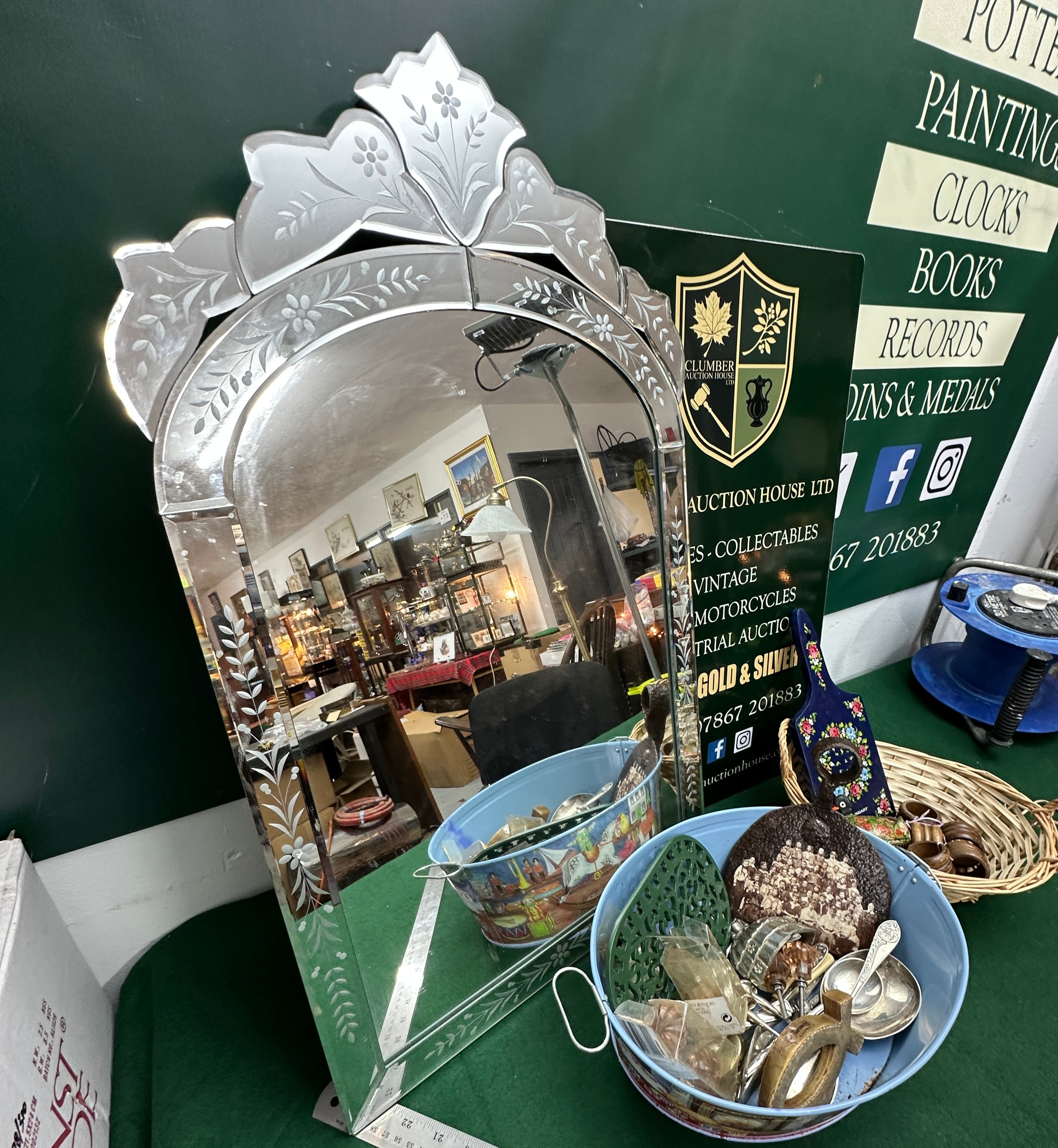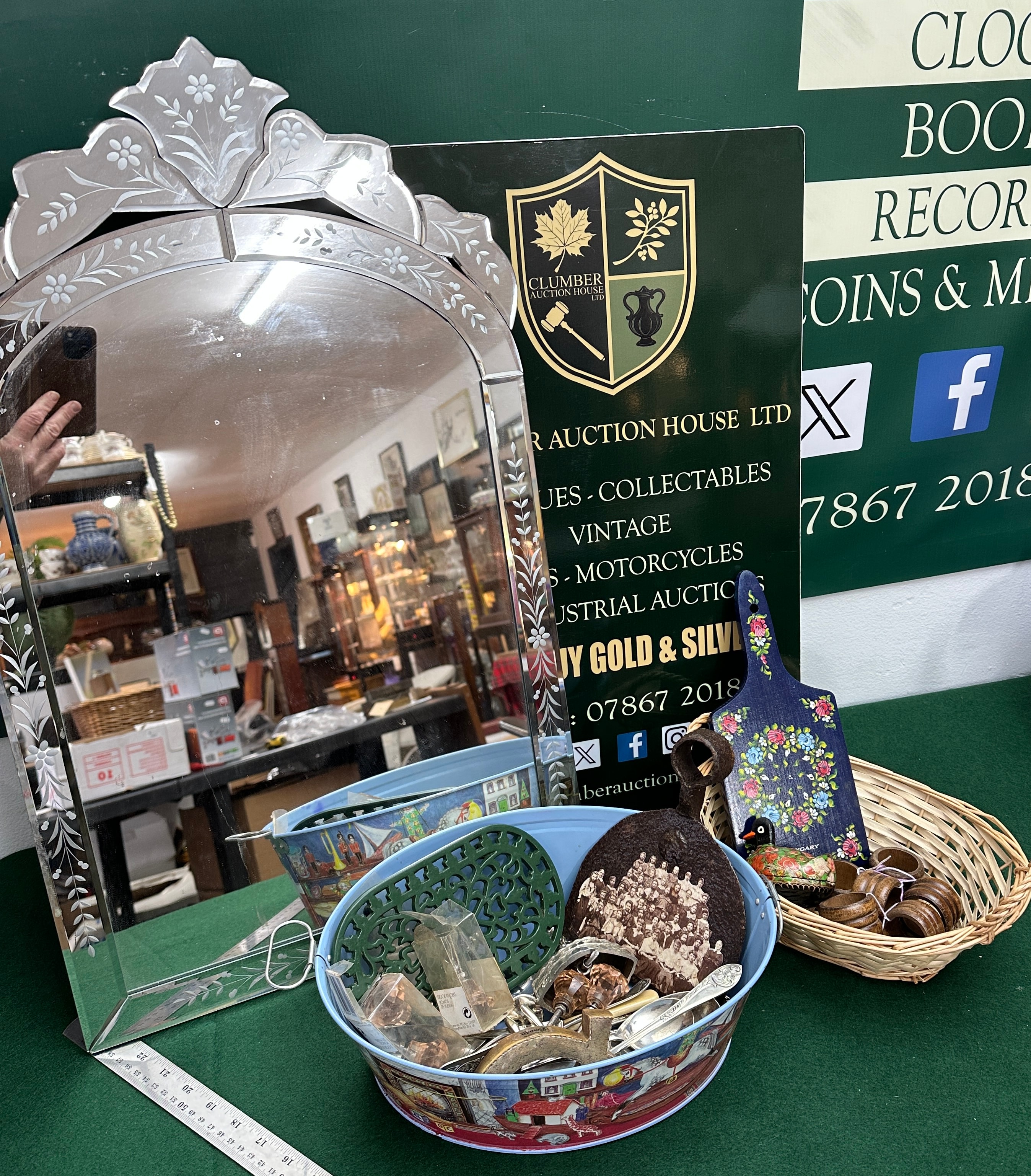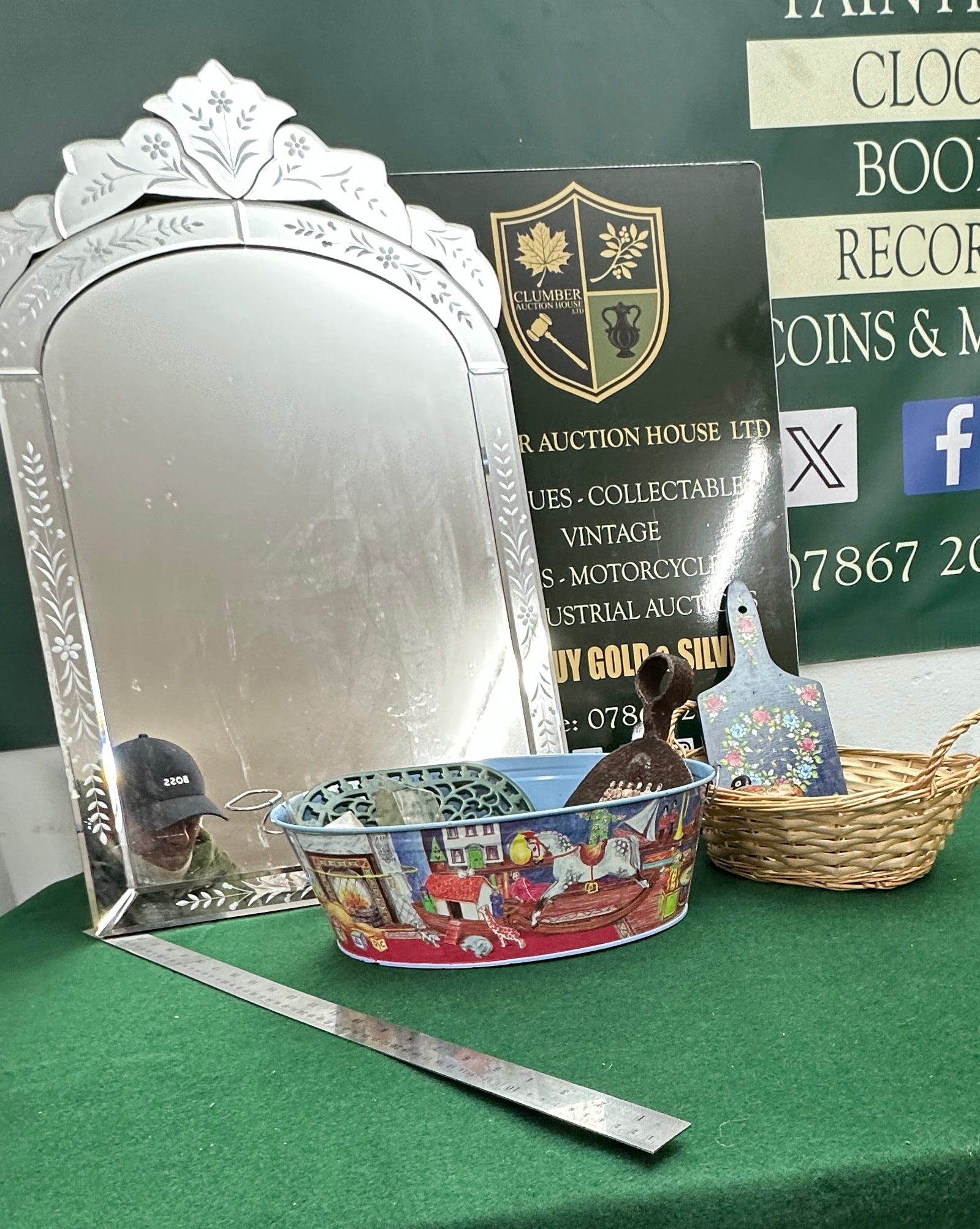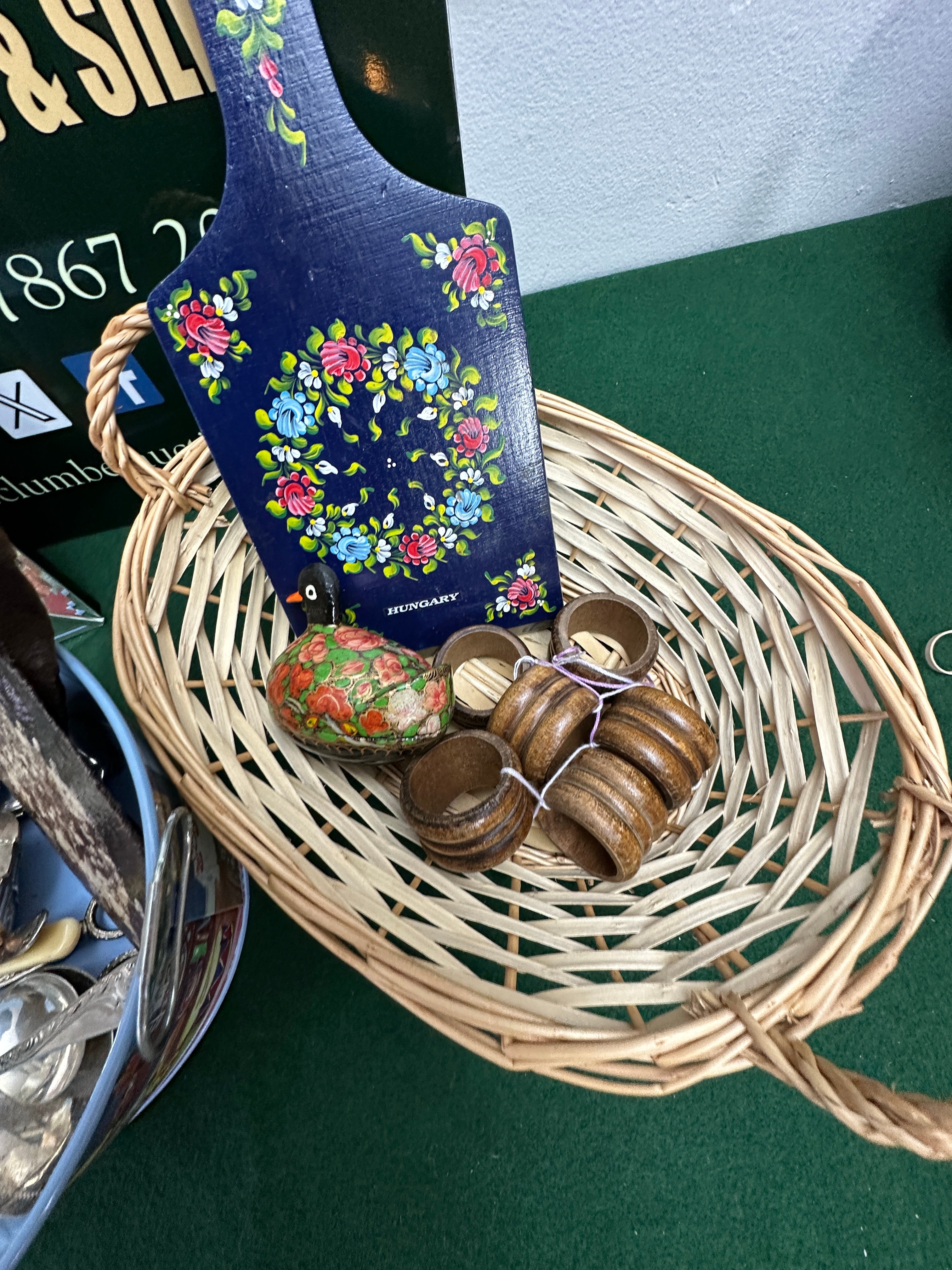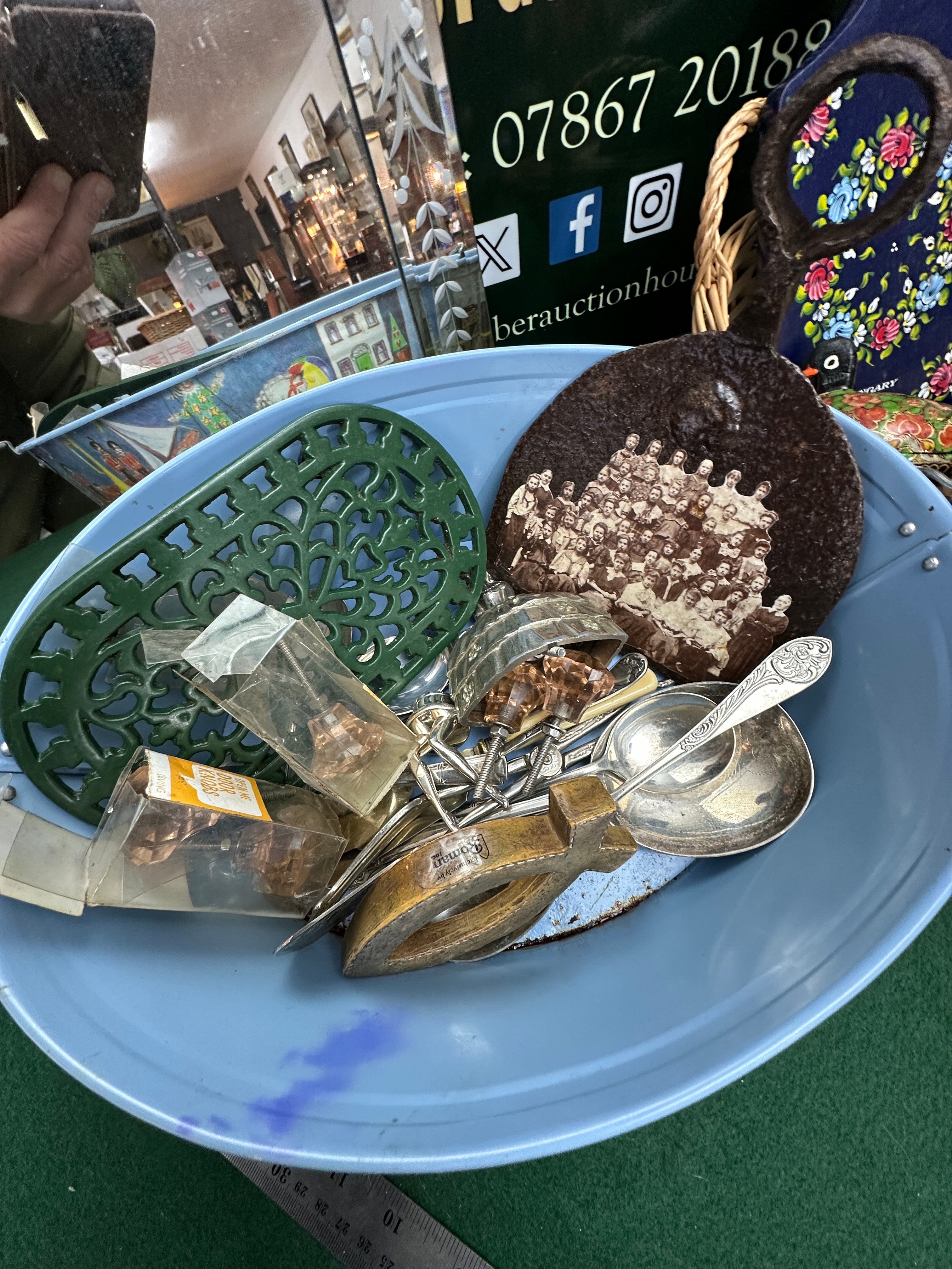 A diverse collection featuring a large arched glass mirror crafted in a Venetian style, adorned with etched floral and foliate designs on its frame and crest. Accompanying the mirror is a light blue oval metal tub, decorated with a continuous folk art scene depicting figures and buildings. The tub contains a green cast-iron trivet with an ornate design, a collection of silver-colored spoons, a collection of other small metal objects, a dark brown irregular plaque impressed with a sepia-toned group photograph suggesting late 19th or early 20th-century origin, and a collection of small transparent boxes with unidentified contents. Adjacent to the tub, a small, open-weave natural fiber basket holds a collection of plain wooden napkin rings, a small painted wooden duck, and a dark blue wooden board embellished with colorful folk art floral painting, clearly marked “HUNGARY.” A metal ruler is visible in the foreground, but specific item measurements cannot be accurately determined from its position.
