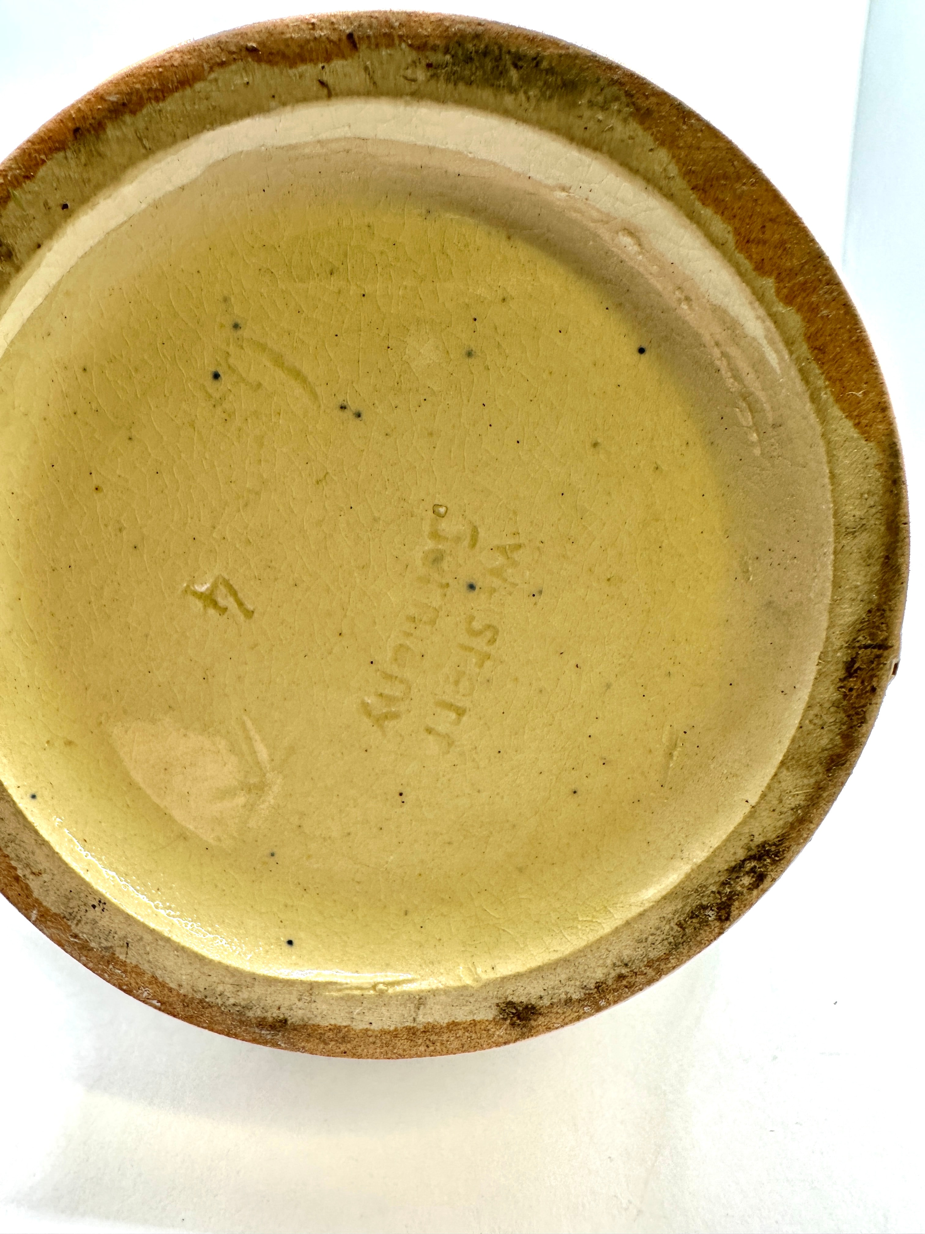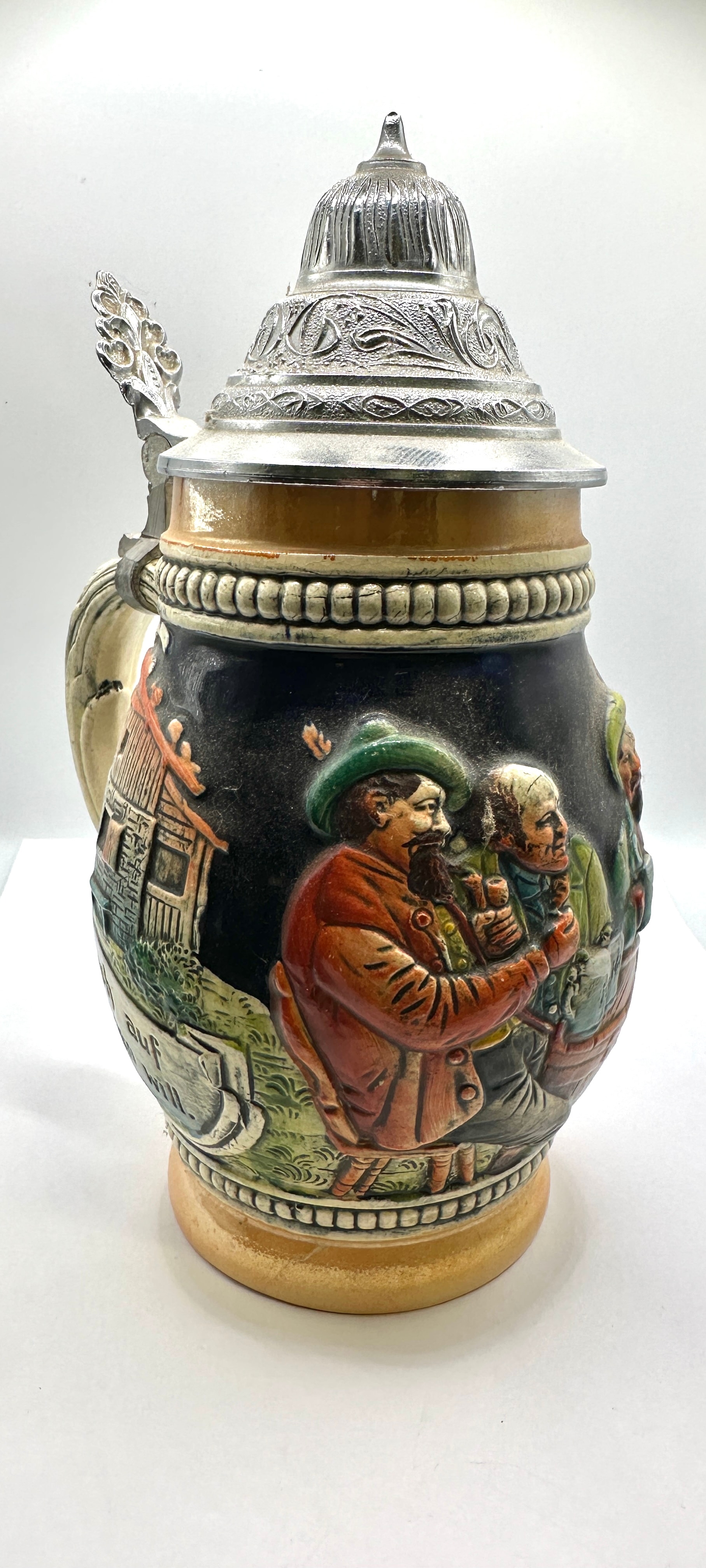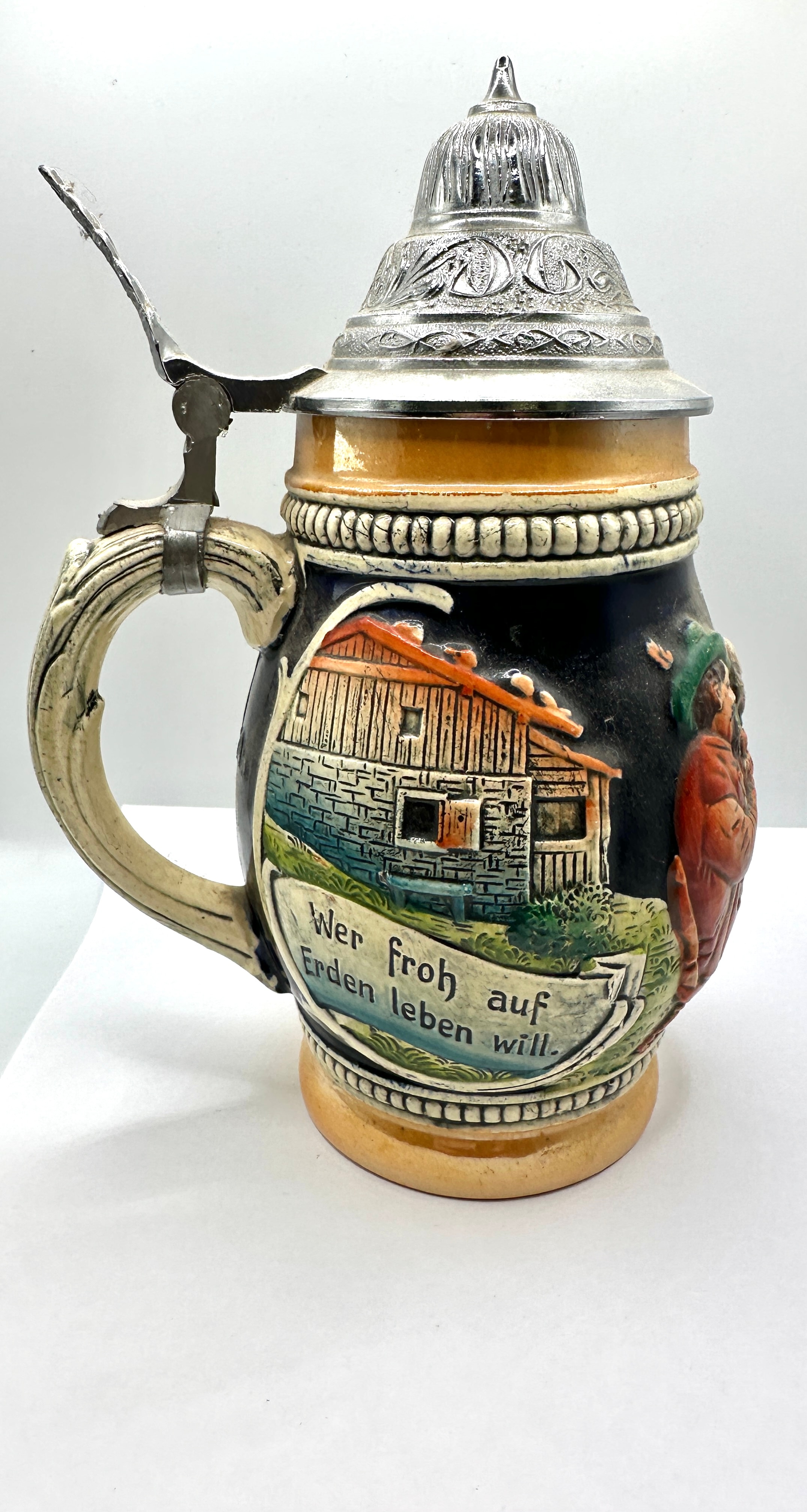 A Western Germany ceramic or stoneware lidded stein, executed in a traditional German folk art style, dating from the mid to late 20th century. The body features intricate relief-molded and hand-painted scenes depicting figures in traditional attire socializing near a rustic building. A banner inscribed with German text reads: “Wer froh auf Erden leben will” (He who wants to live happily on Earth). The stein is fitted with a hinged metal lid, likely pewter, decorated with embossed scrollwork and an ornate thumb lift. The unglazed base is marked “Western Germany” along with the number “4”.