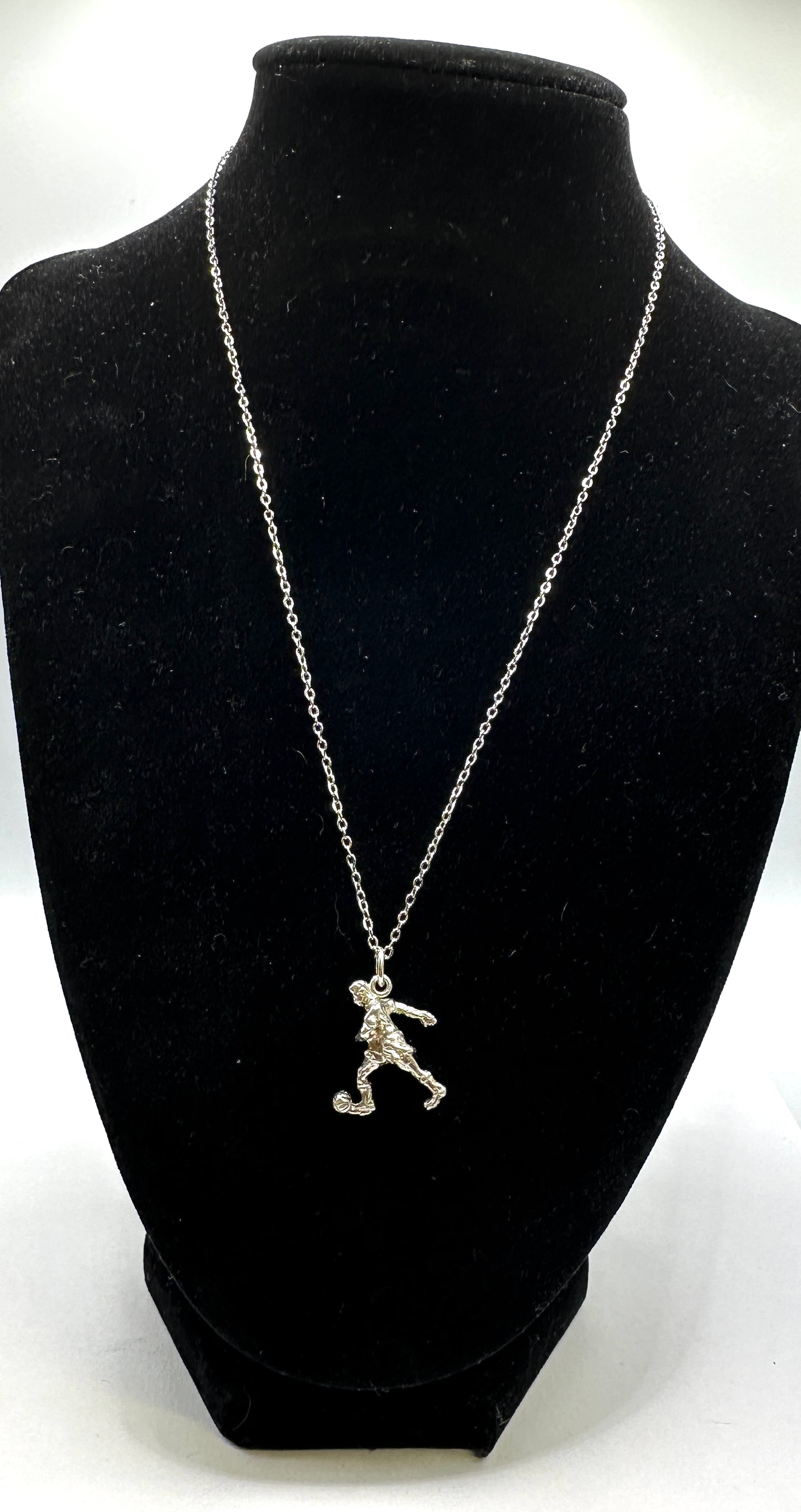 A Sterling Silver Soccer Player Pendant Necklace. Composed of a figural pendant depicting a stylized soccer player in motion, poised with a soccer ball at their foot. The pendant is suspended from a cable or curb link chain, matching the pendant’s metallic luster. No discernible hallmarks, manufacturer’s marks, or text are visible on either the pendant or the chain.