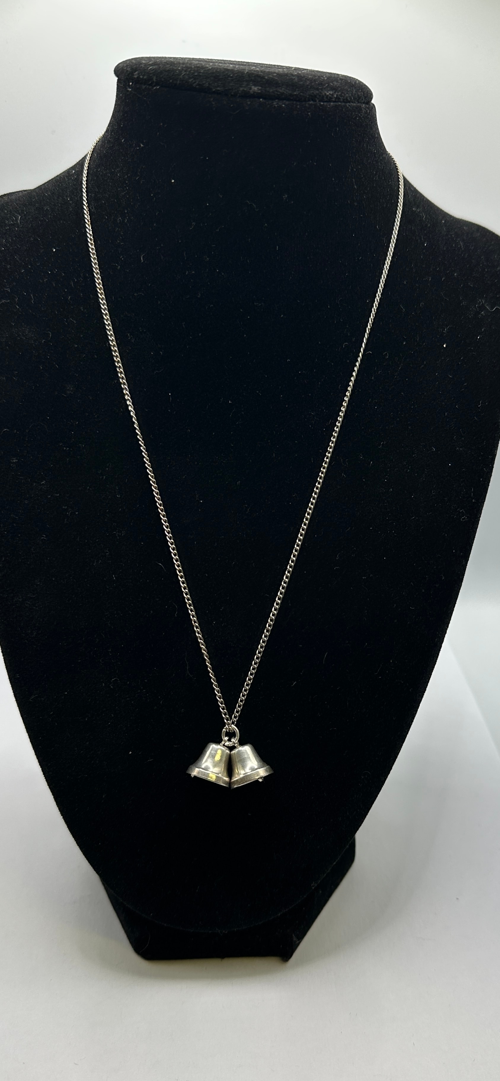 A 925 silver necklace, featuring a curb-link chain suspending a pendant of two conjoined bell-shaped charms. Each bell is fitted with an internal clapper. The item exhibits surface wear and tarnish, particularly on the bells.