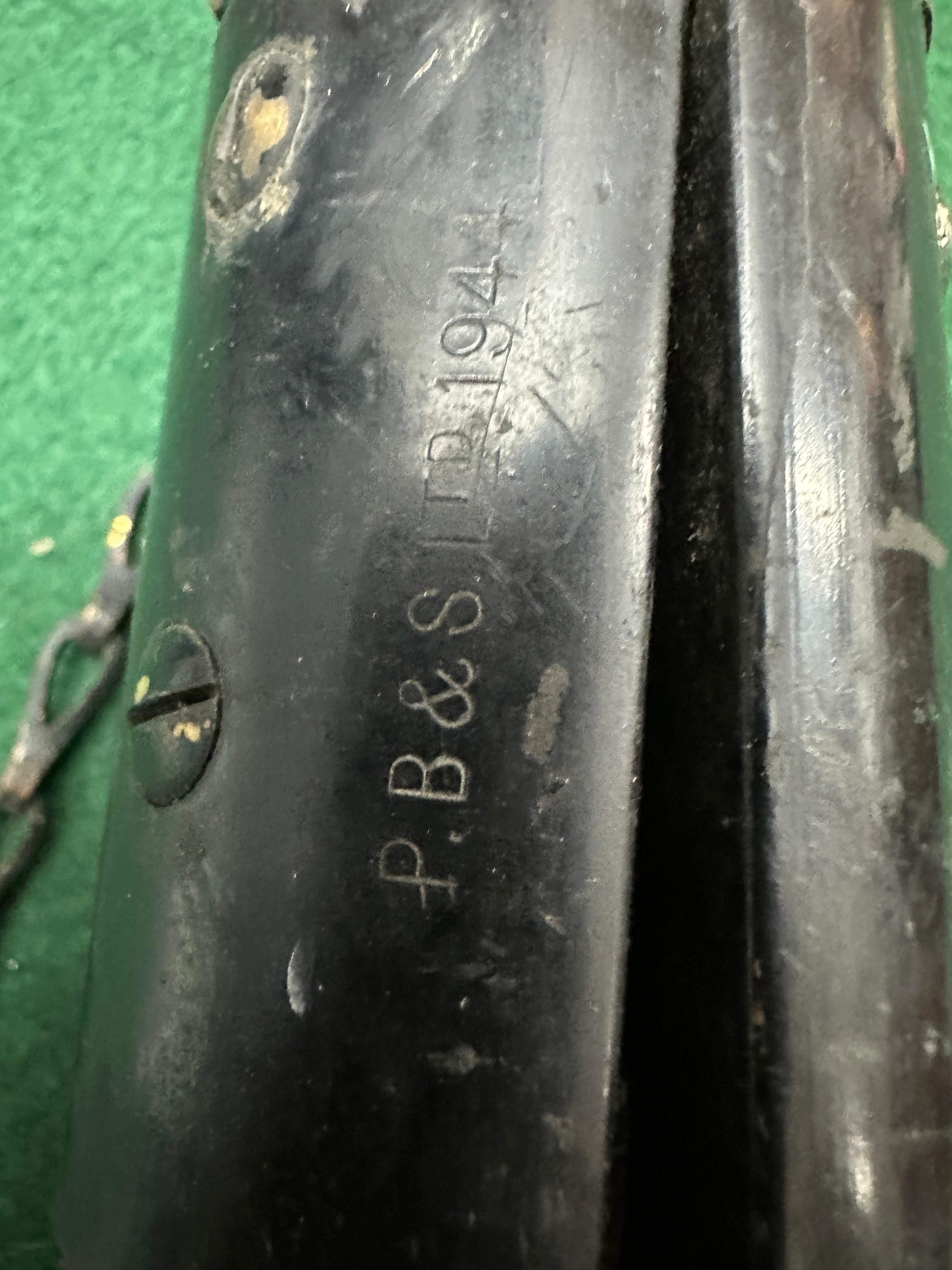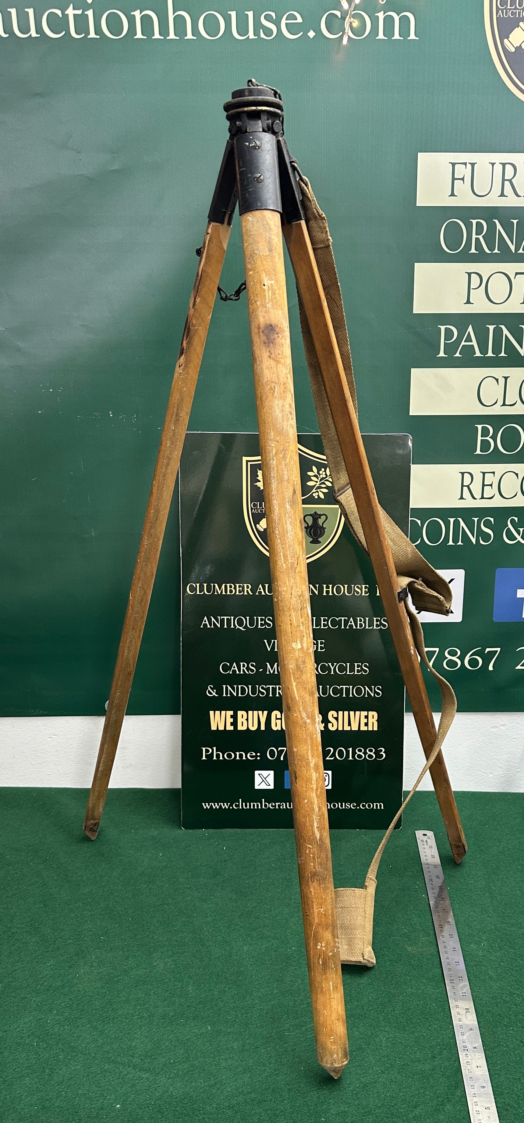 A WW2 Canadian Made Stand Instruments No. 21 Tripod, manufactured by P.B.& S.LTD and dated 1944. This three-legged wooden tripod features a black-painted metal head with a textured cap and securing screws. It is constructed from wood for the legs and metal for the fittings, complete with an attached canvas carrying strap and a small canvas pouch. The object exhibits clear signs of use, consistent with utilitarian equipment from the mid-20th century.