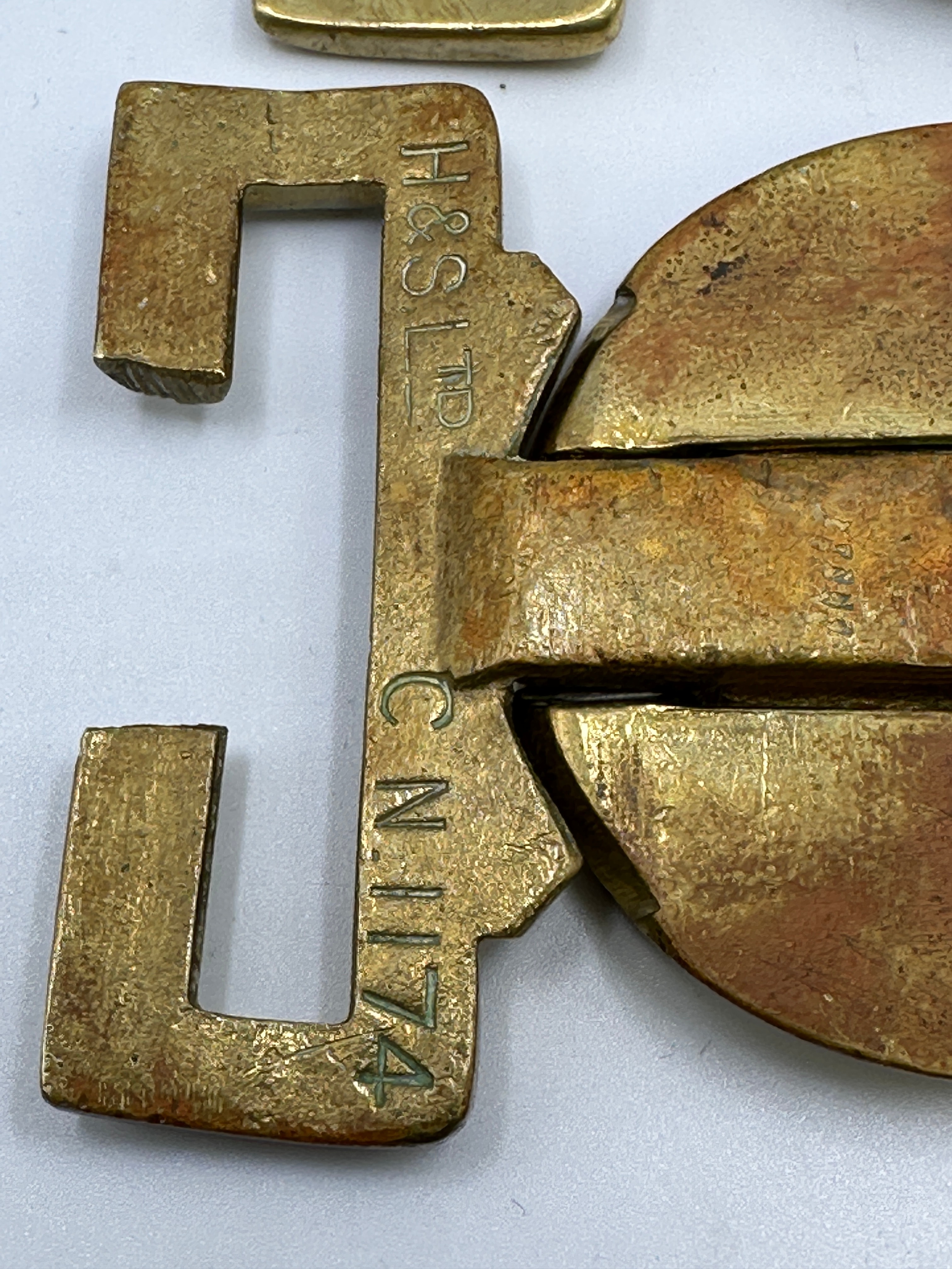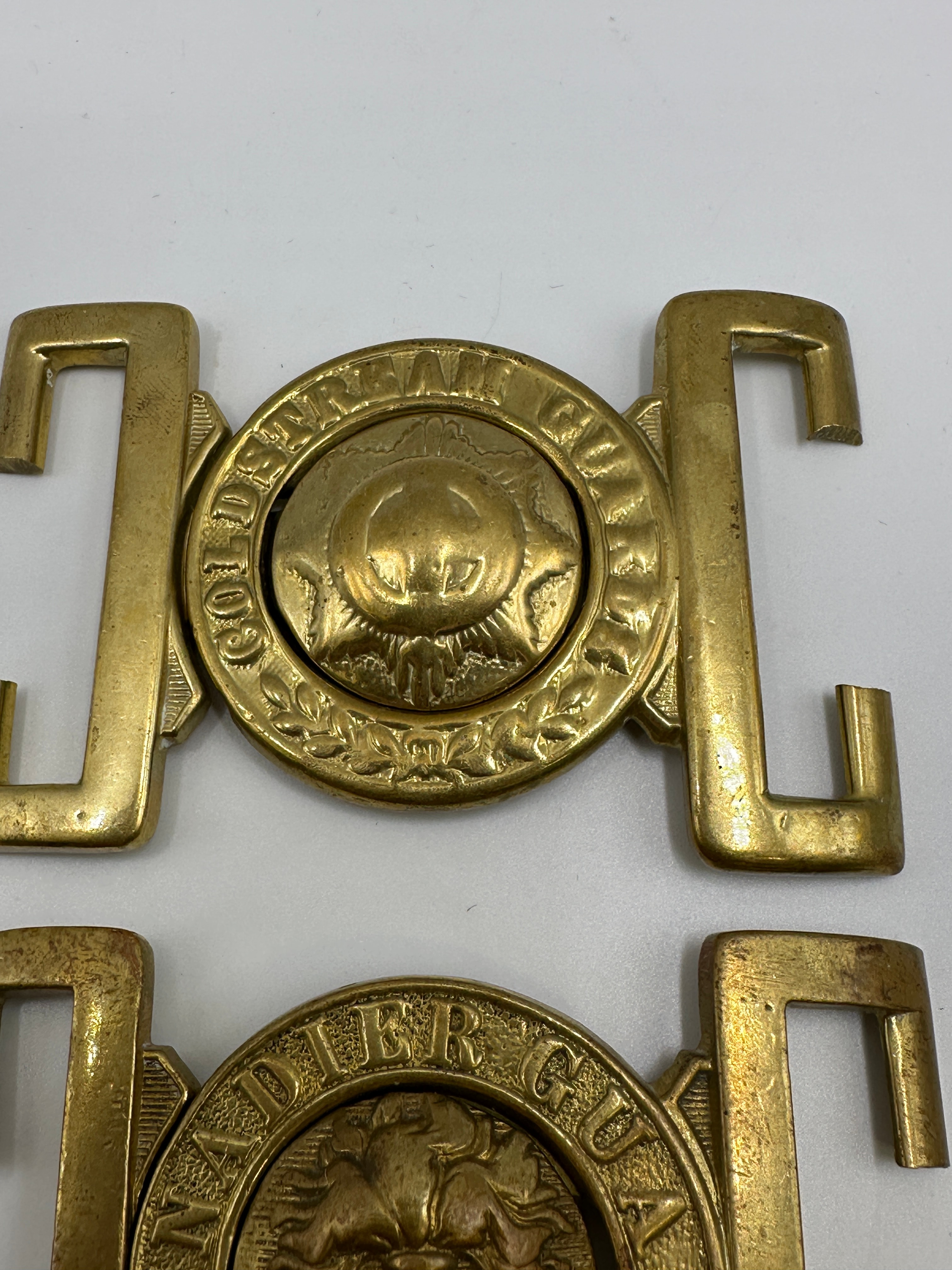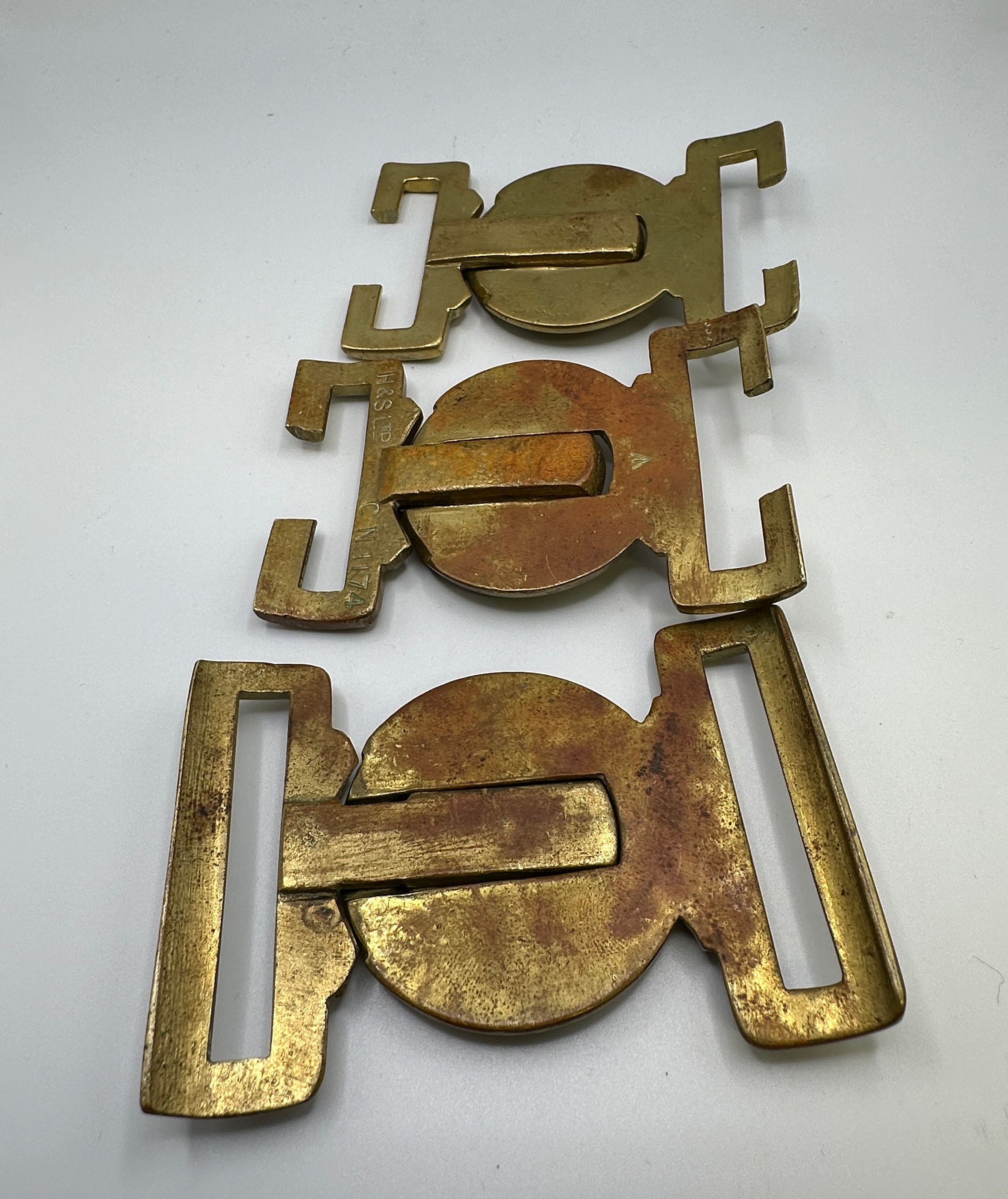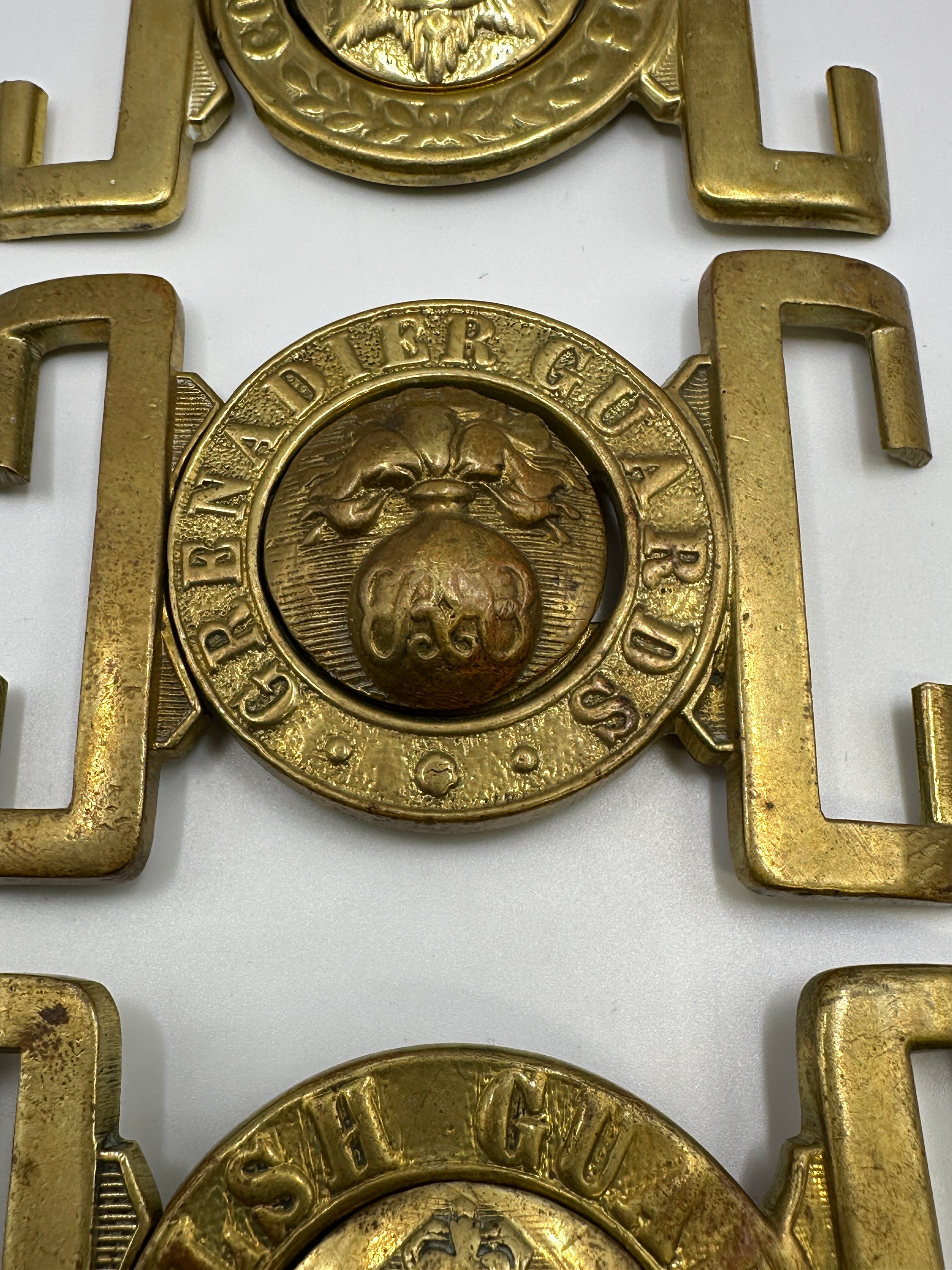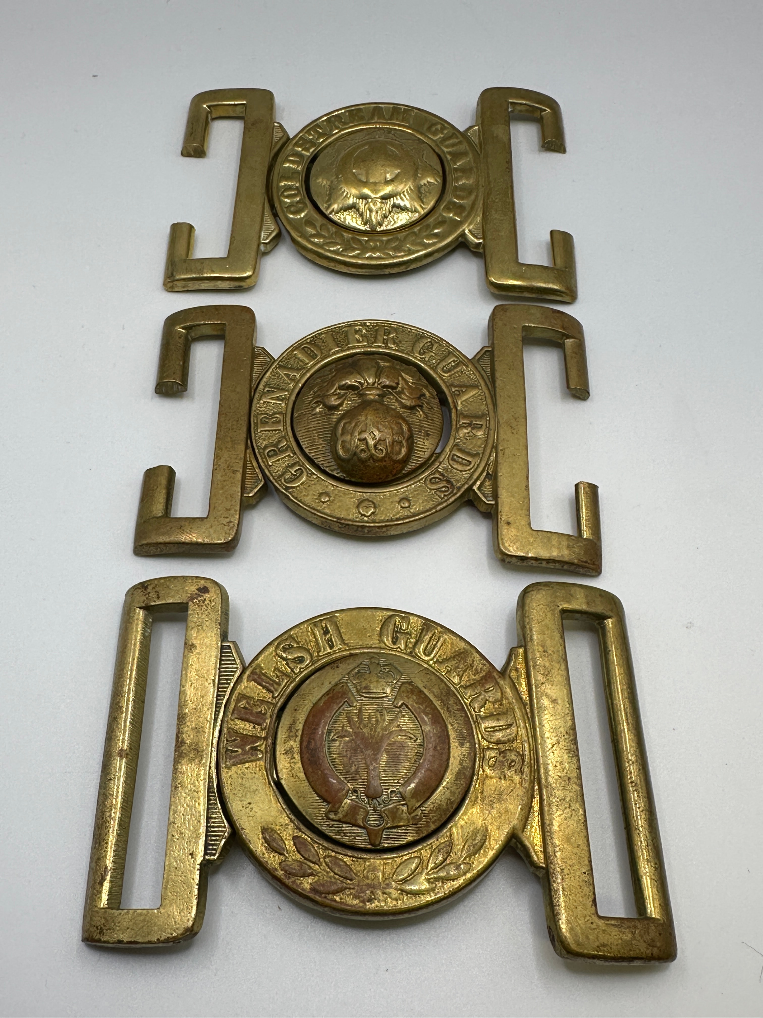 A group of three British Guards Regiment brass waist-belt clasps, each a two-part interlocking belt buckle. The top buckle is inscribed “COLDSTREAM GUARDS” with a star emblem, the middle buckle “GRENADIER GUARDS” with a flaming grenade emblem, and the bottom buckle “IRISH GUARDS” with a harp and crown emblem. The reverse of one buckle is marked “H&S LTD” and “C N 1174”.