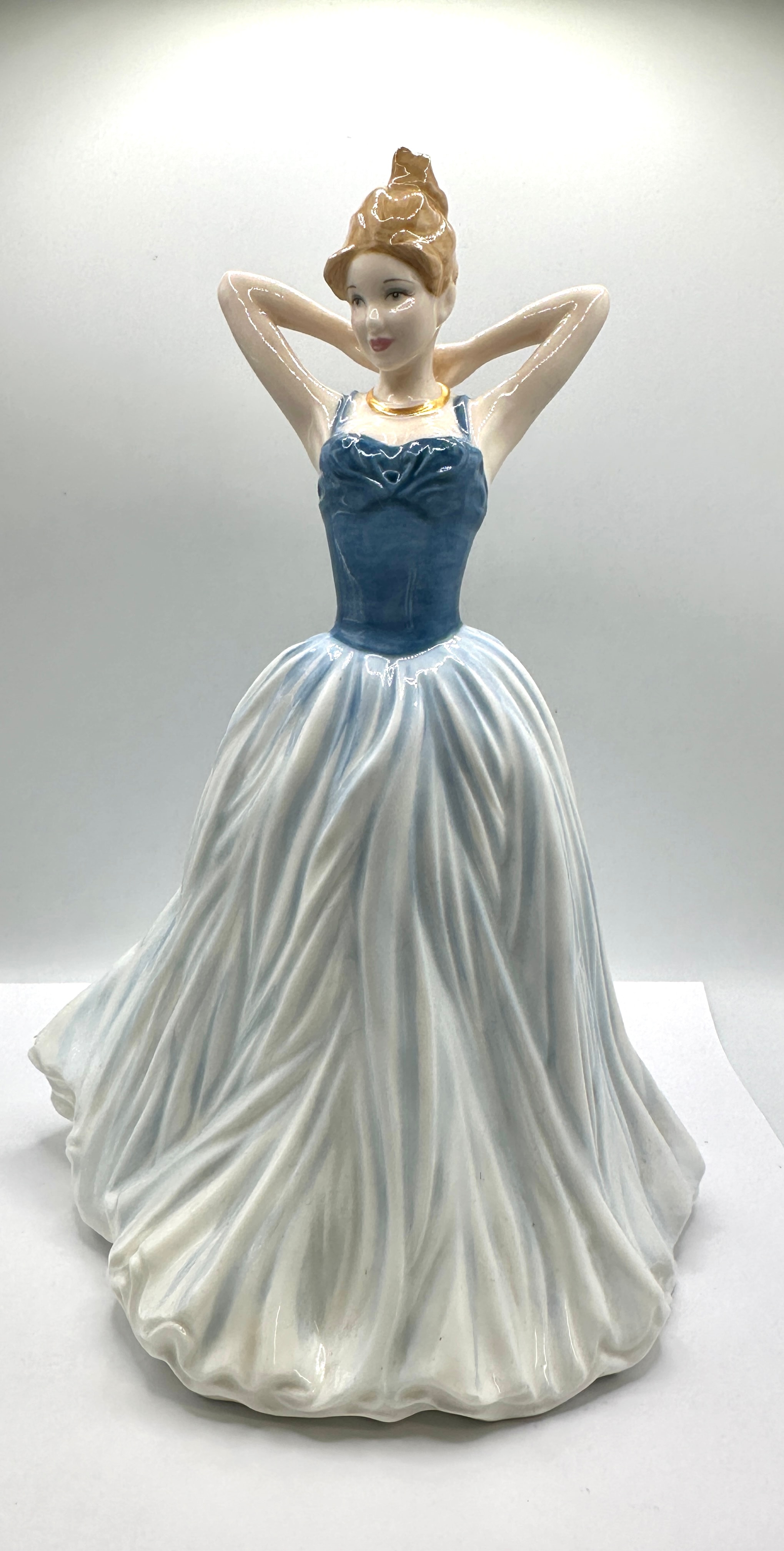 A Royal Doulton ‘Classics in Vogue’ bone china figurine titled ‘Finishing Touch,’ model number HN 4328. Modeled by Neil Faulkner and copyrighted 2001, this figurine depicts a female figure with an elaborate updo, posed with her hands behind her head. She wears a formal gown featuring a medium blue bodice and a voluminous white skirt with light blue shading. A gold-colored choker necklace adorns her neck. The base is clearly marked with the Royal Doulton lion and crown emblem, identifying it as “ROYAL DOULTON” from the “CLASSICS IN VOGUE” collection, specifically titled “Finishing Touch,” model number “HN 4328.” The inscription further states it was “MODELED BY Neil Faulkner,” “MADE IN ENGLAND,” and is copyrighted © 2001.