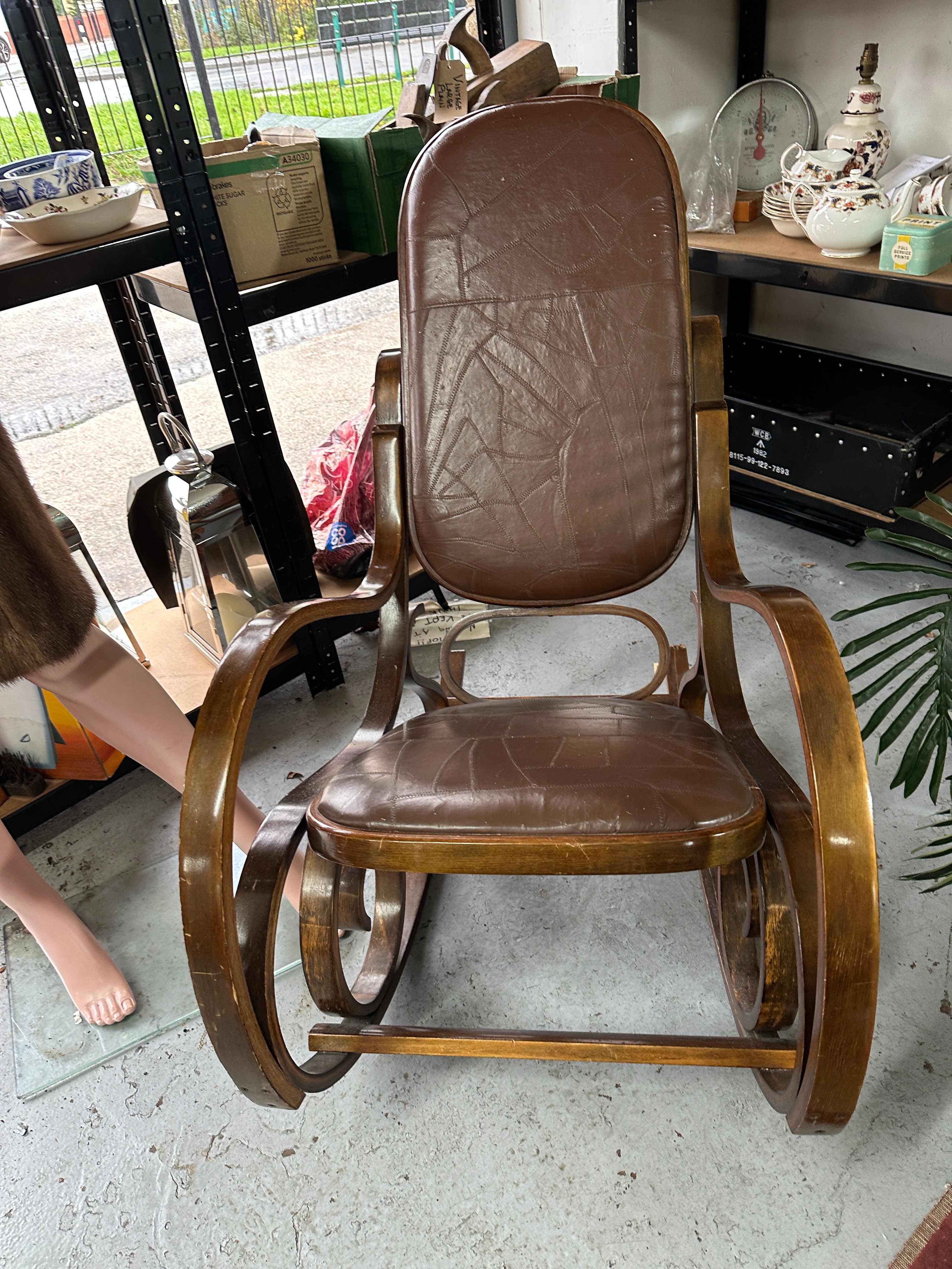 A Luigi Crassevig bentwood rocking chair, circa 1970s. This piece features a dark-toned wooden frame constructed with sweeping curves forming the arms, seat supports, and rockers, characteristic of a classic bentwood style. Both the seat and the tall backrest are padded and upholstered in a rich brown material, likely leather or faux leather.