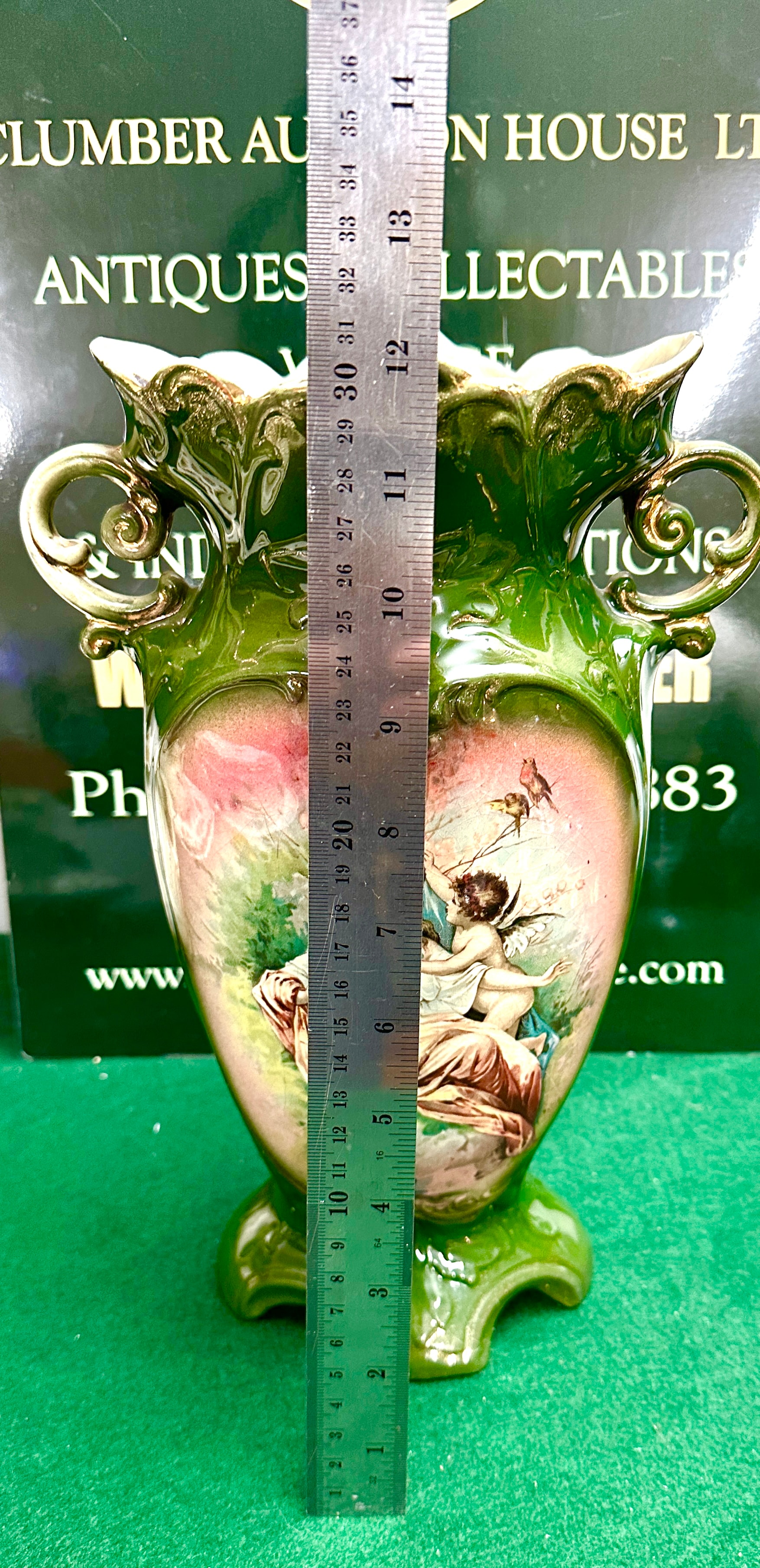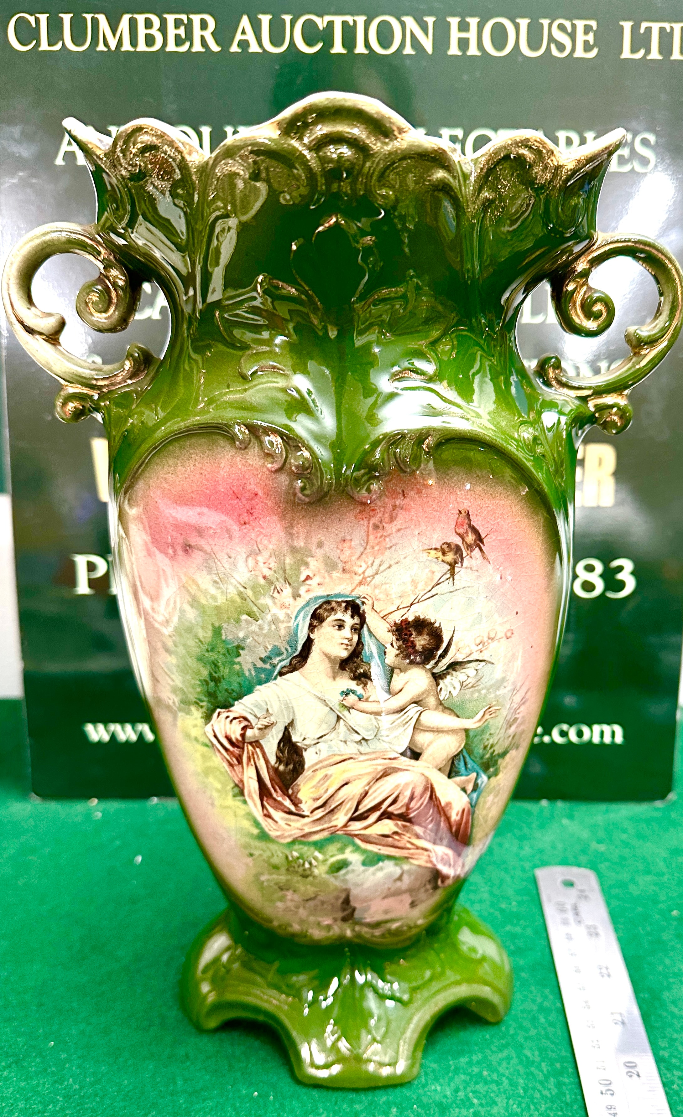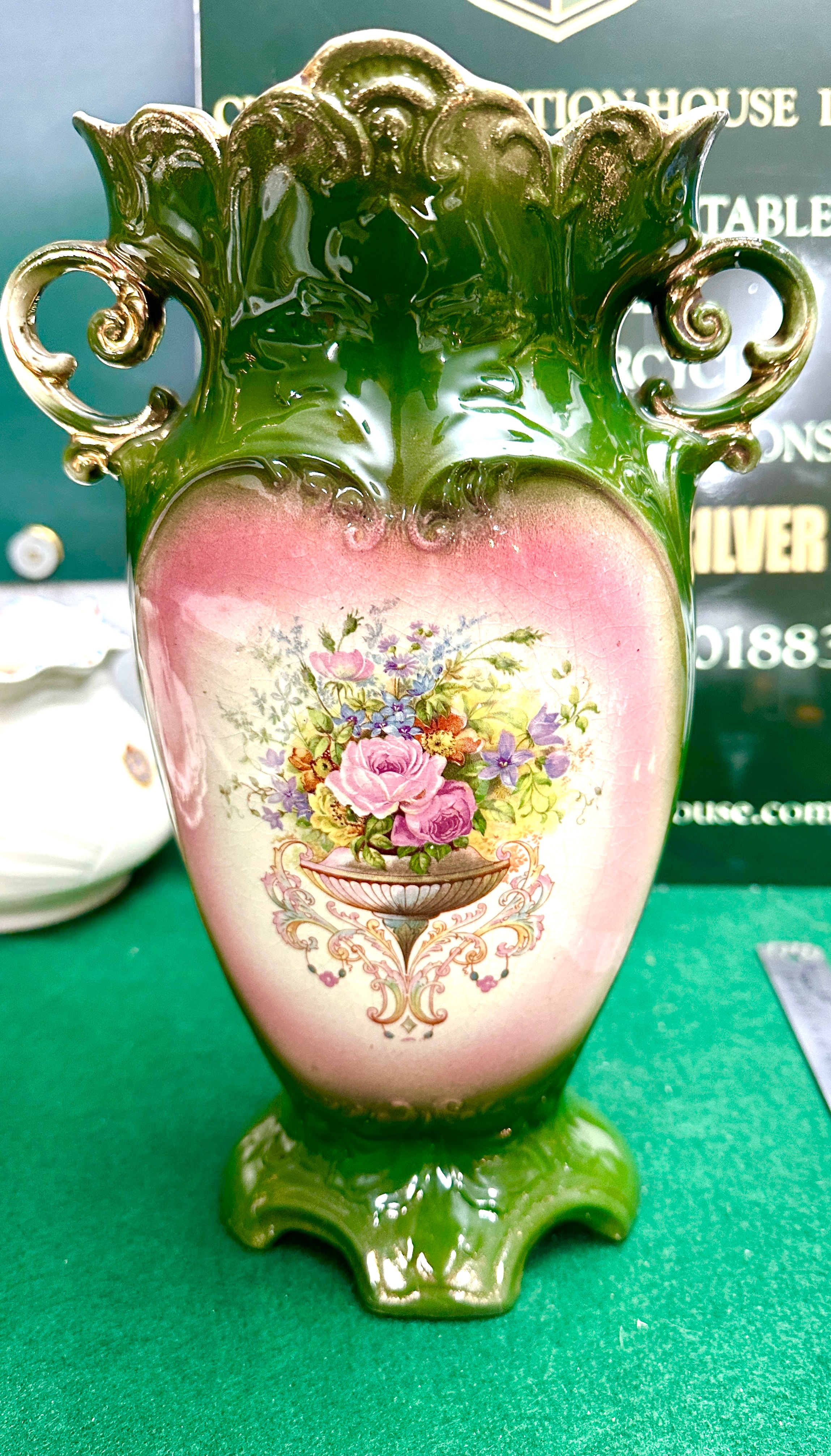 A decorative, footed ceramic vase crafted in an ornate late Victorian or Edwardian Rococo Revival style. The vase features a glossy dark green glaze with intricate gold gilding on its scrolled handles and a wavy, scalloped rim. The body of the vase is adorned with two heart-shaped panels; one displays a transfer print depicting a classical or romantic scene of a woman, a cherub, and birds, while the other presents a vibrant floral bouquet arranged in an urn. The ceramic material is glazed.
