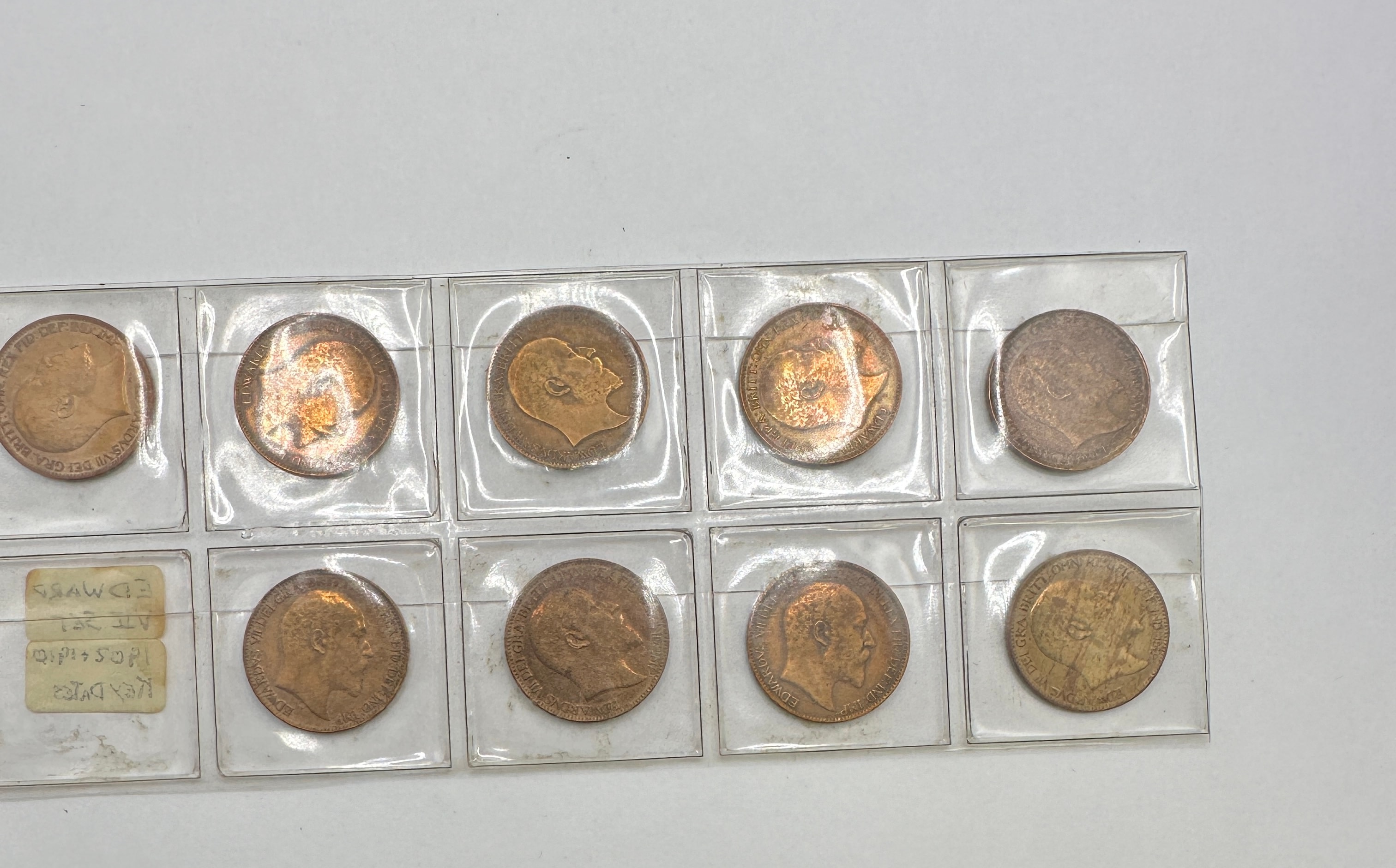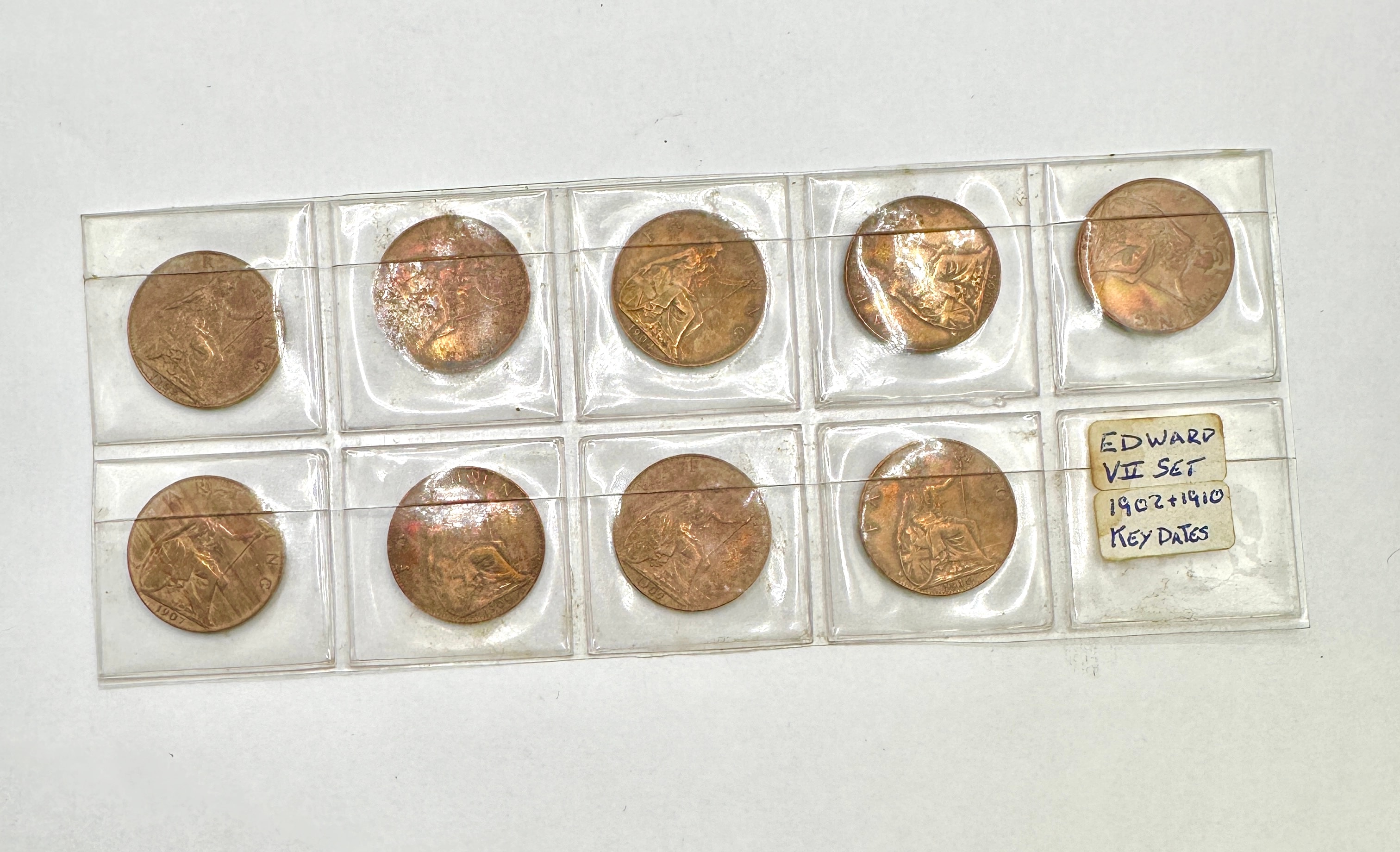A set of ten Great Britain Edward VII Pennies. Each coin features a profile bust of Edward VII, with the visible Latin legend “EDWARDUS VII DEI GRA: BRITT: OMN: REX FID: DEF: IND: IMP:” (Edward VII, by the Grace of God, King of all Britons, Defender of the Faith, Emperor of India). The reverse side uniformly depicts a seated Britannia figure. The coins are dated between 1902 and 1910. They are individually housed in clear, square plastic holders, with an eleventh compartment containing a handwritten label reading “EDWARD VII SET”, “1902-1910”, and “KEY DATES”.