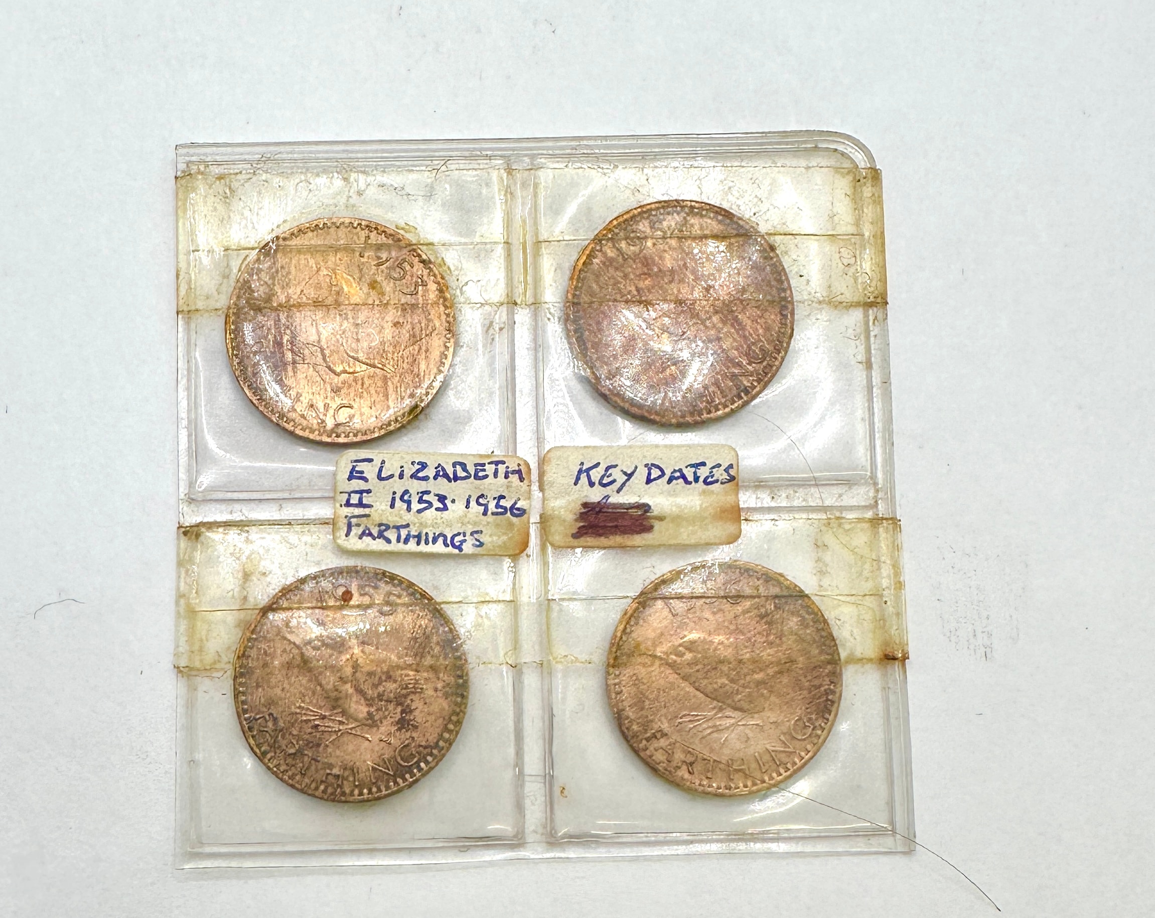 A collection of four circular, reddish-brown metallic coins, likely copper or bronze, identified as Great Britain Elizabeth II Farthings from the years 1953, 1954, 1955, and 1956. Each coin features a bird design (a wren) and partial text reading “ONE FARTHING.” The coins are housed within a four-pocket, clear plastic collector’s holder.