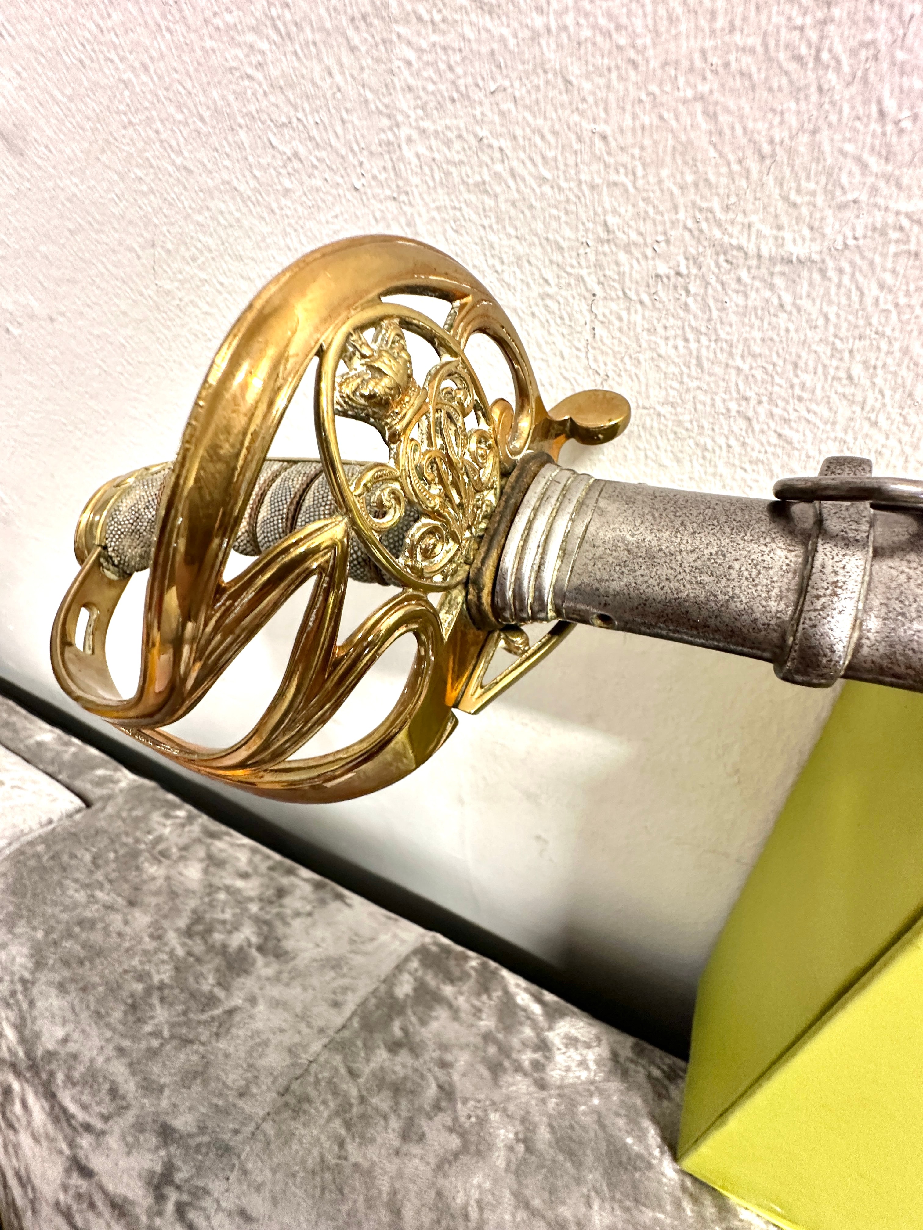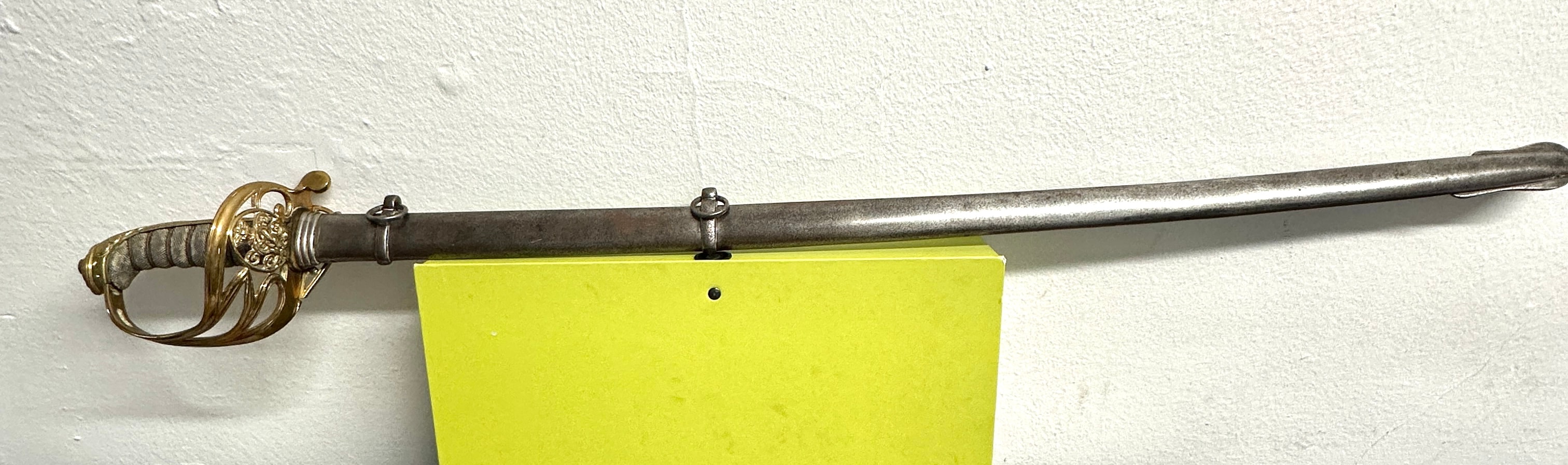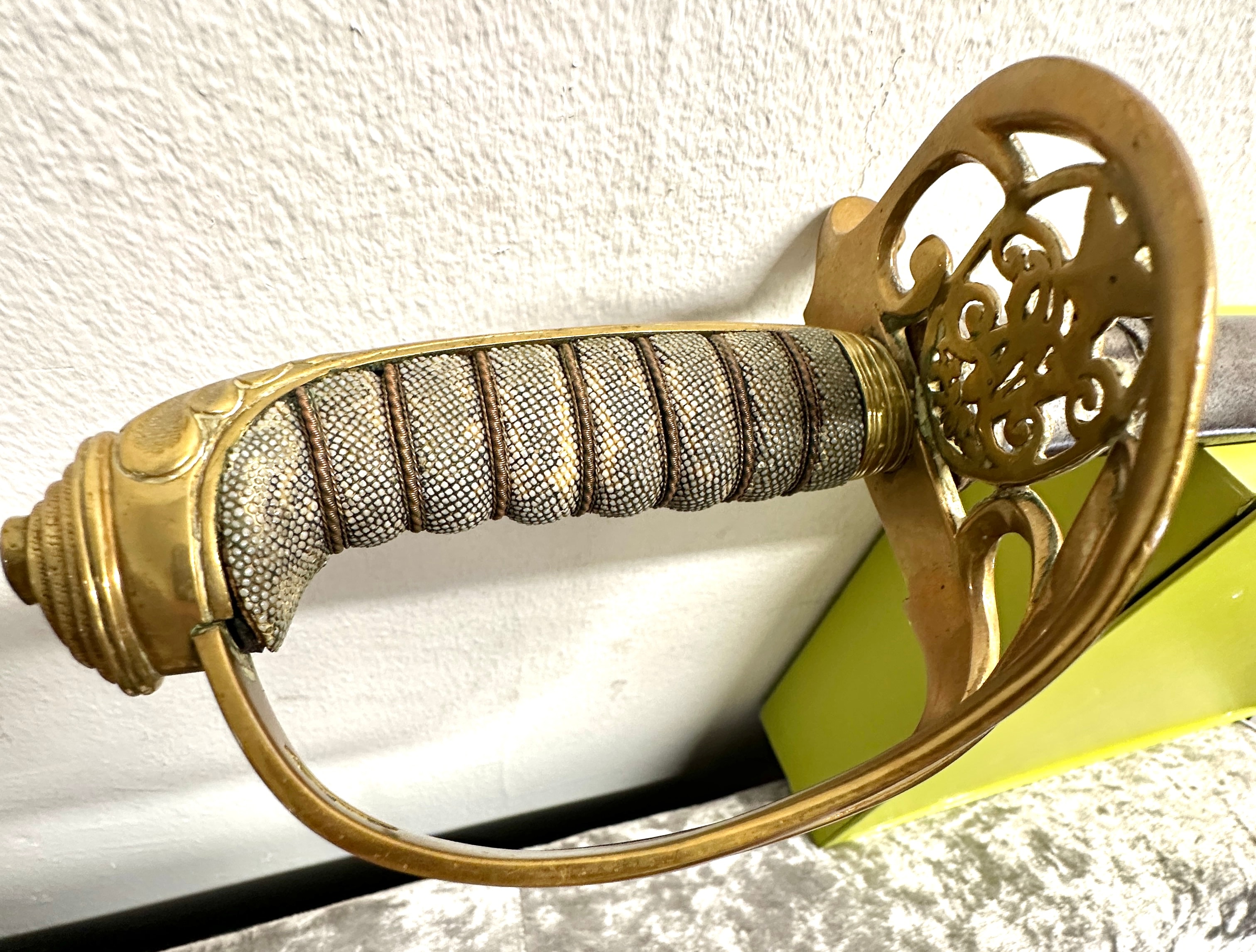 A 19th-century officer’s saber, features a gilded brass or bronze hilt with an elaborate, pierced guard adorned with a central crowned eagle motif. The grip is wrapped in a textured material, likely shagreen, with twisted wire. The curved steel blade is etched with an eagle and foliate designs, and bears the partial inscription “CHATEL…” near the hilt. It is accompanied by its metal scabbard, which has two suspension rings.