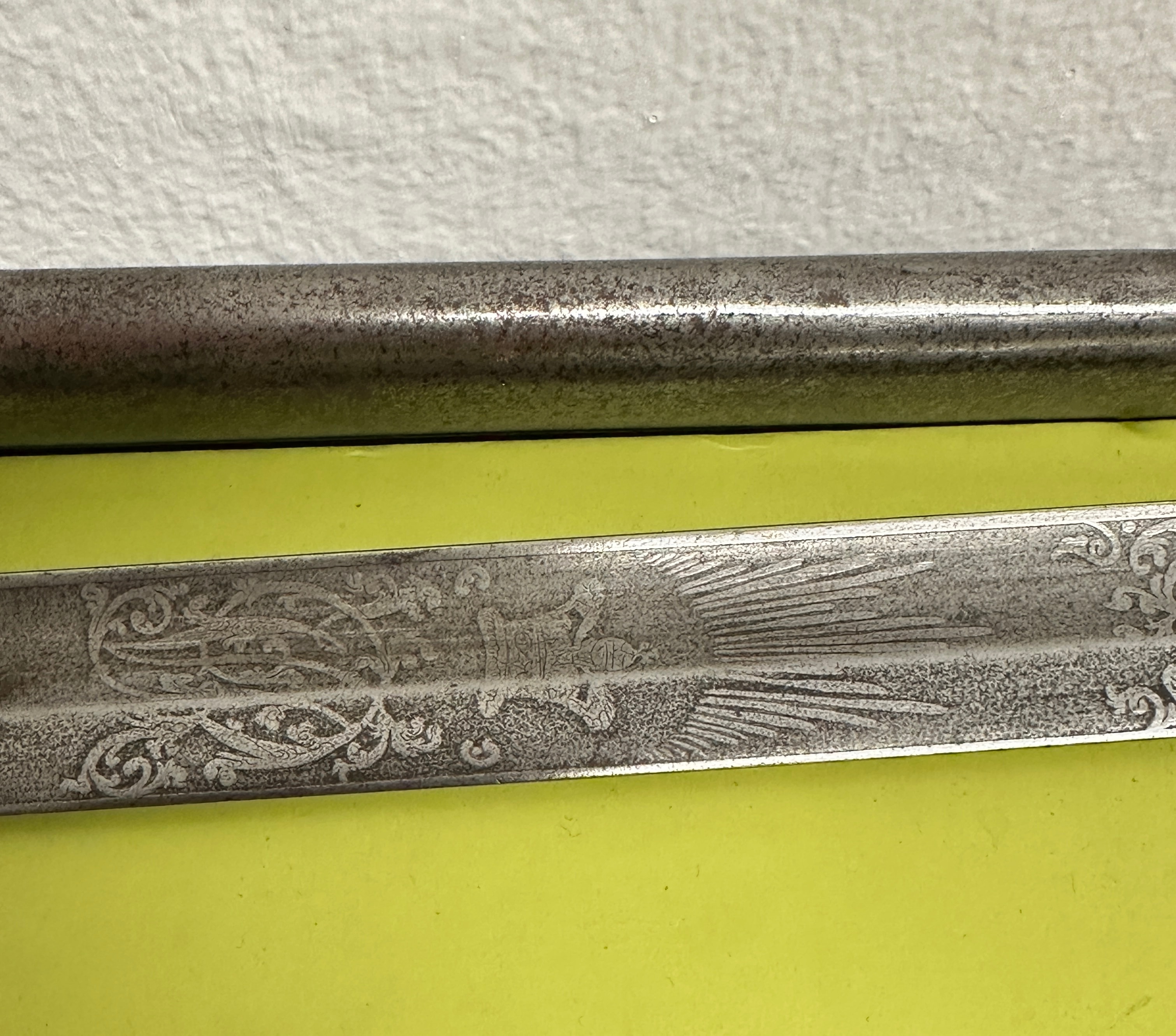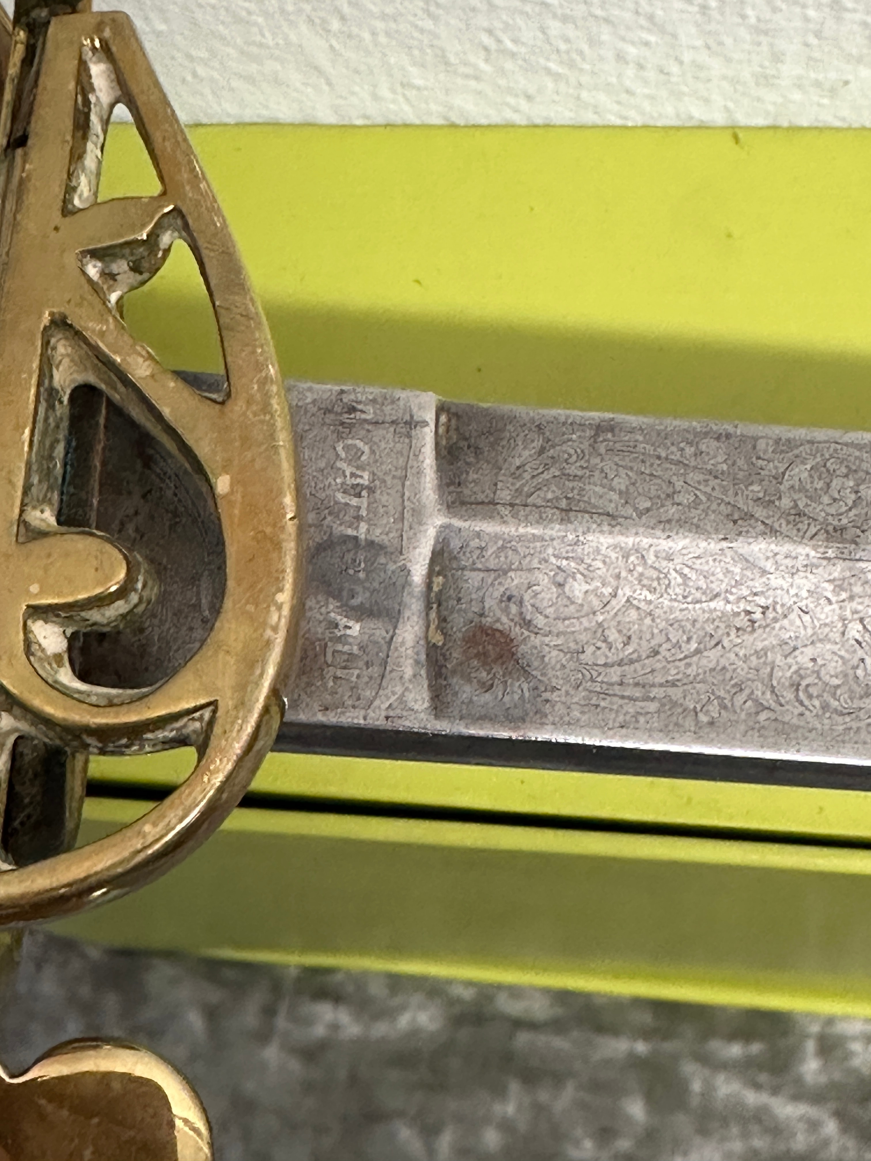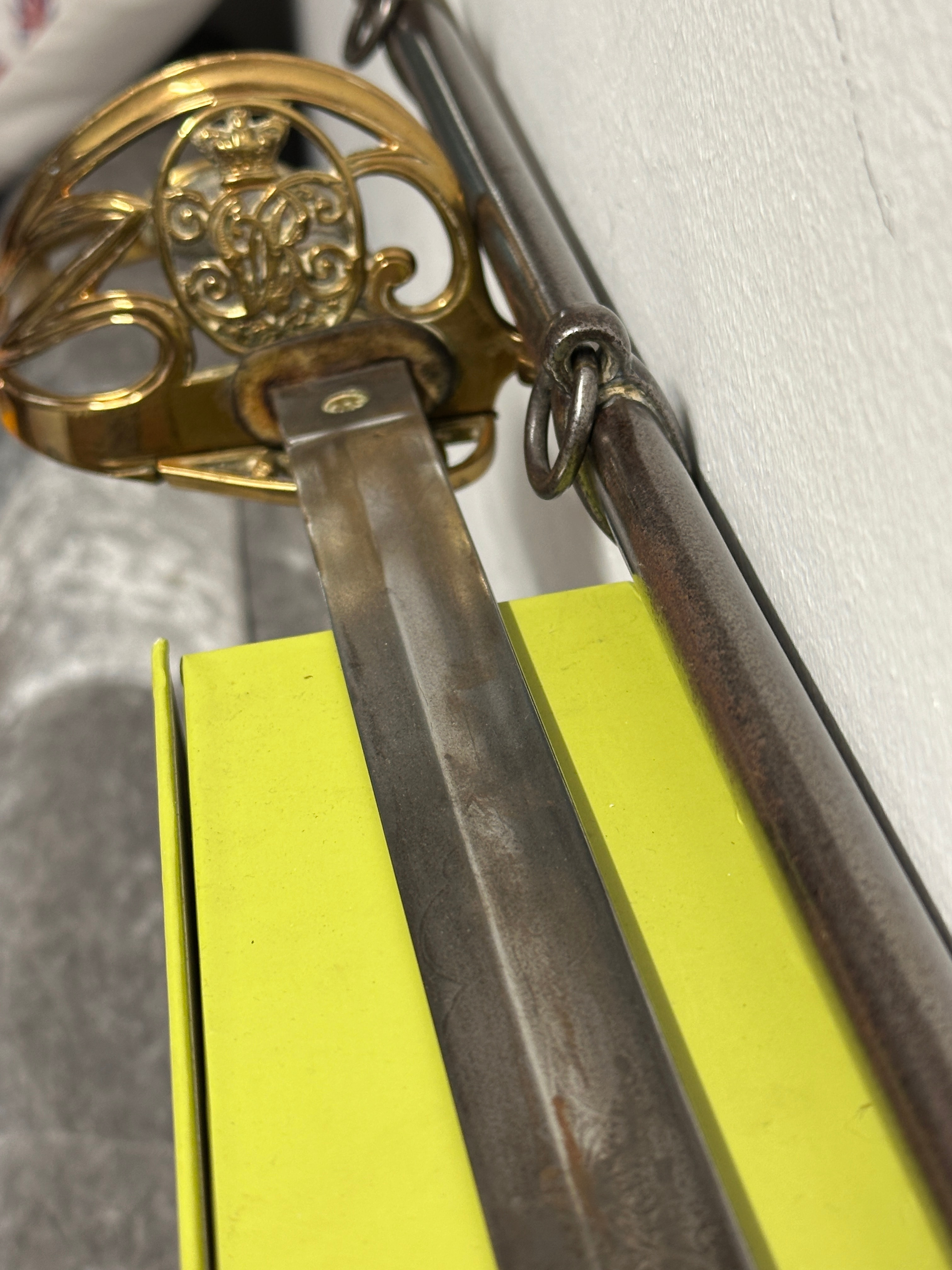 A 19th-century officer’s saber, features a gilded brass or bronze hilt with an elaborate, pierced guard adorned with a central crowned eagle motif. The grip is wrapped in a textured material, likely shagreen, with twisted wire. The curved steel blade is etched with an eagle and foliate designs, and bears the partial inscription “CHATEL…” near the hilt. It is accompanied by its metal scabbard, which has two suspension rings.