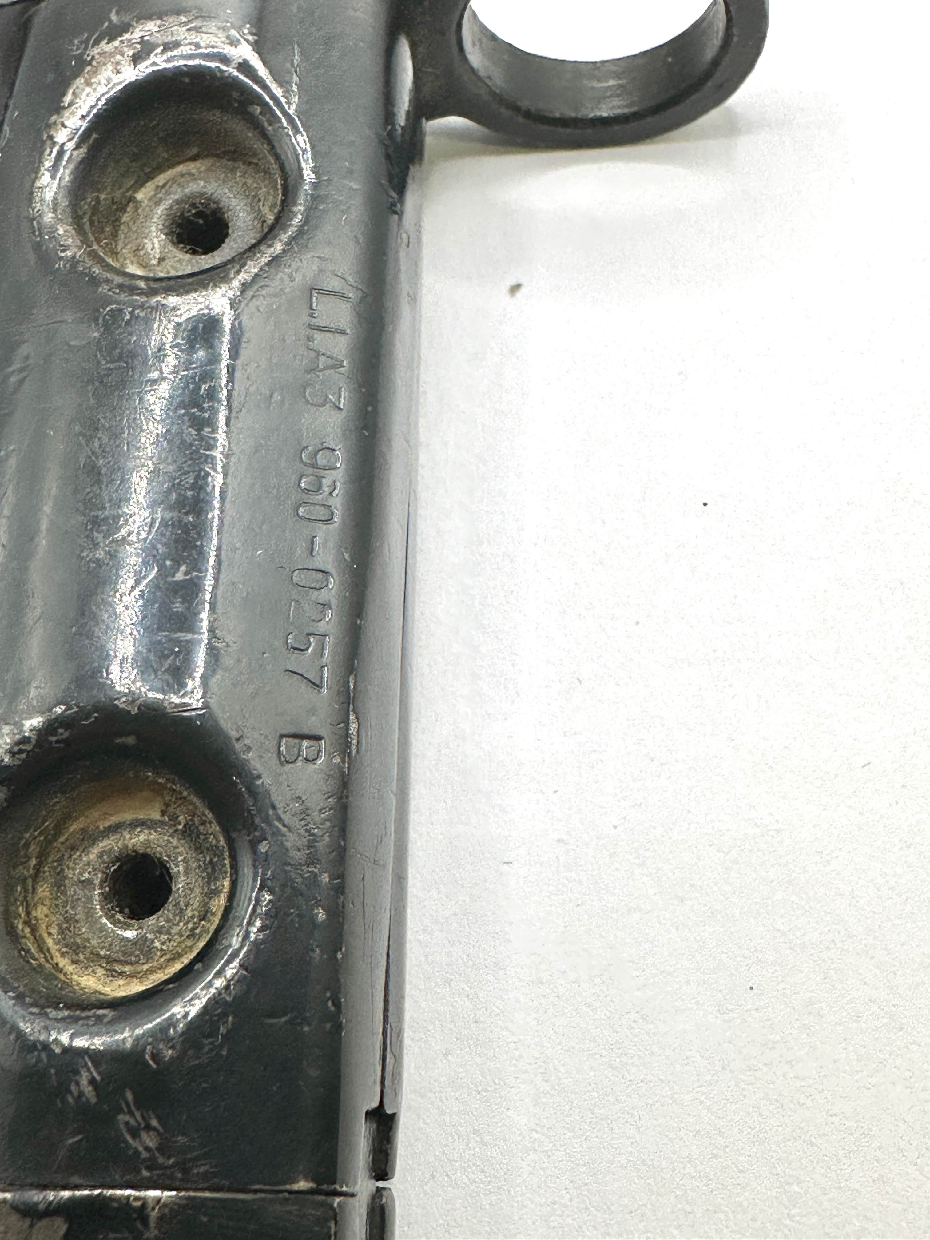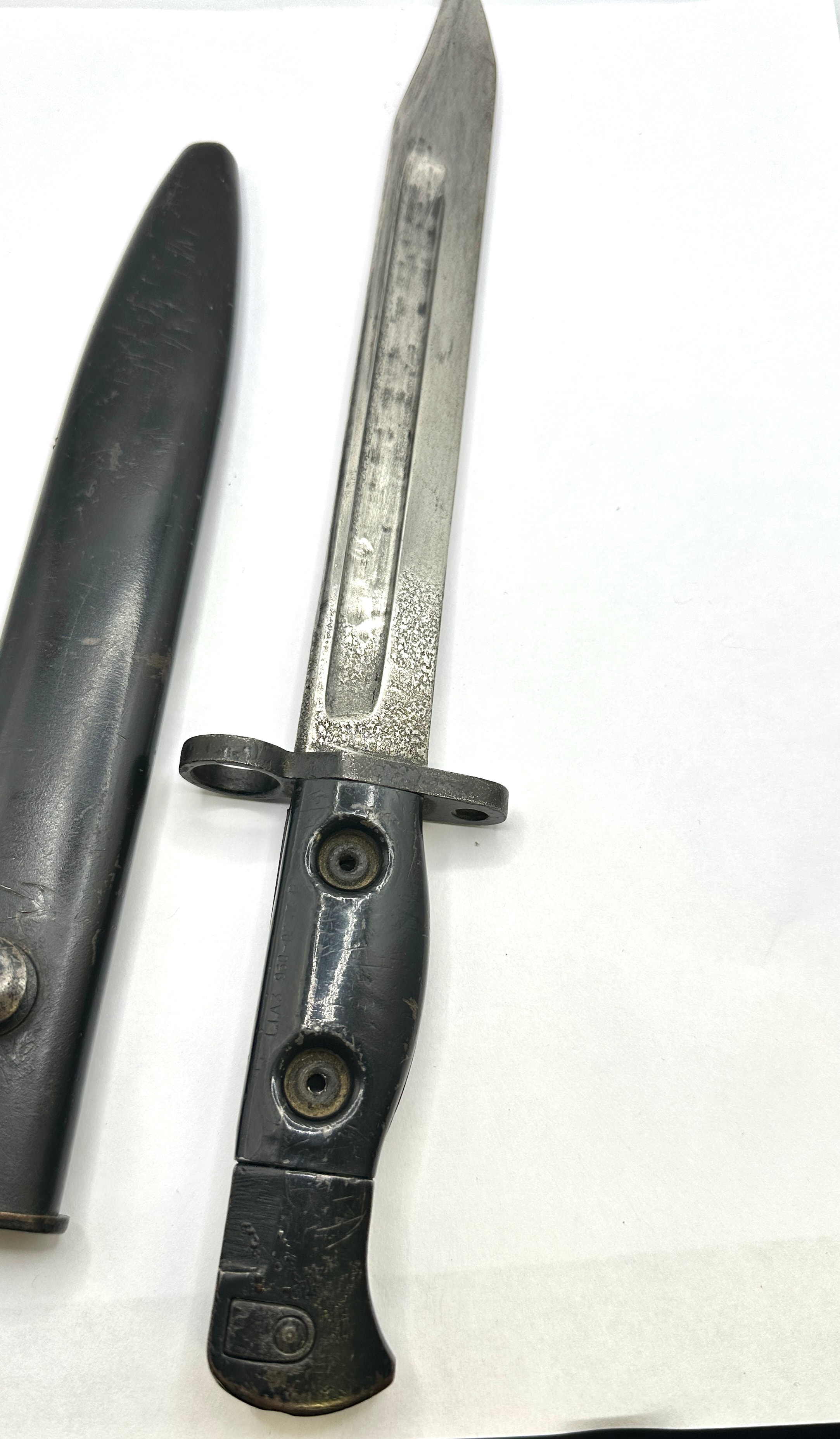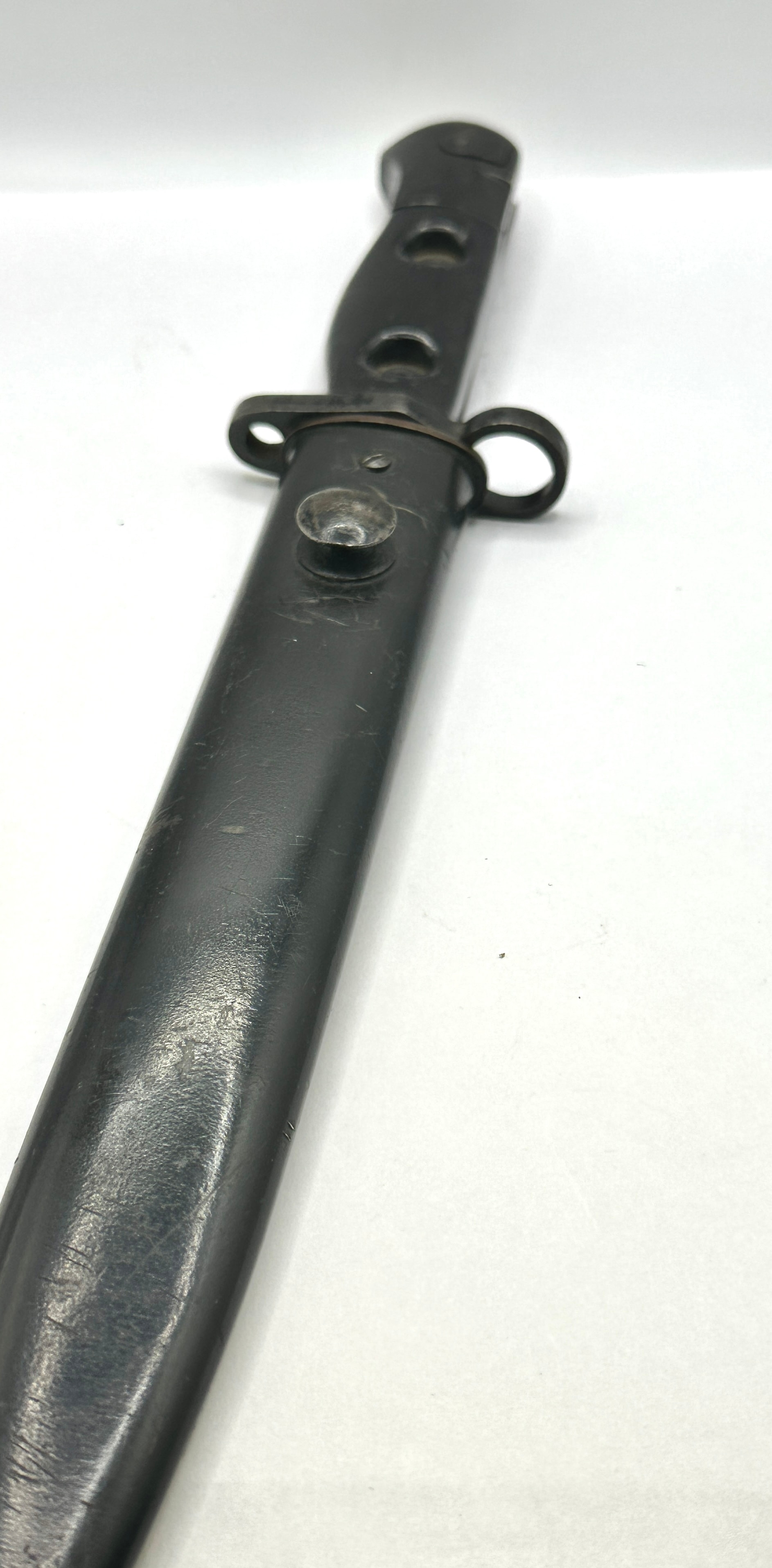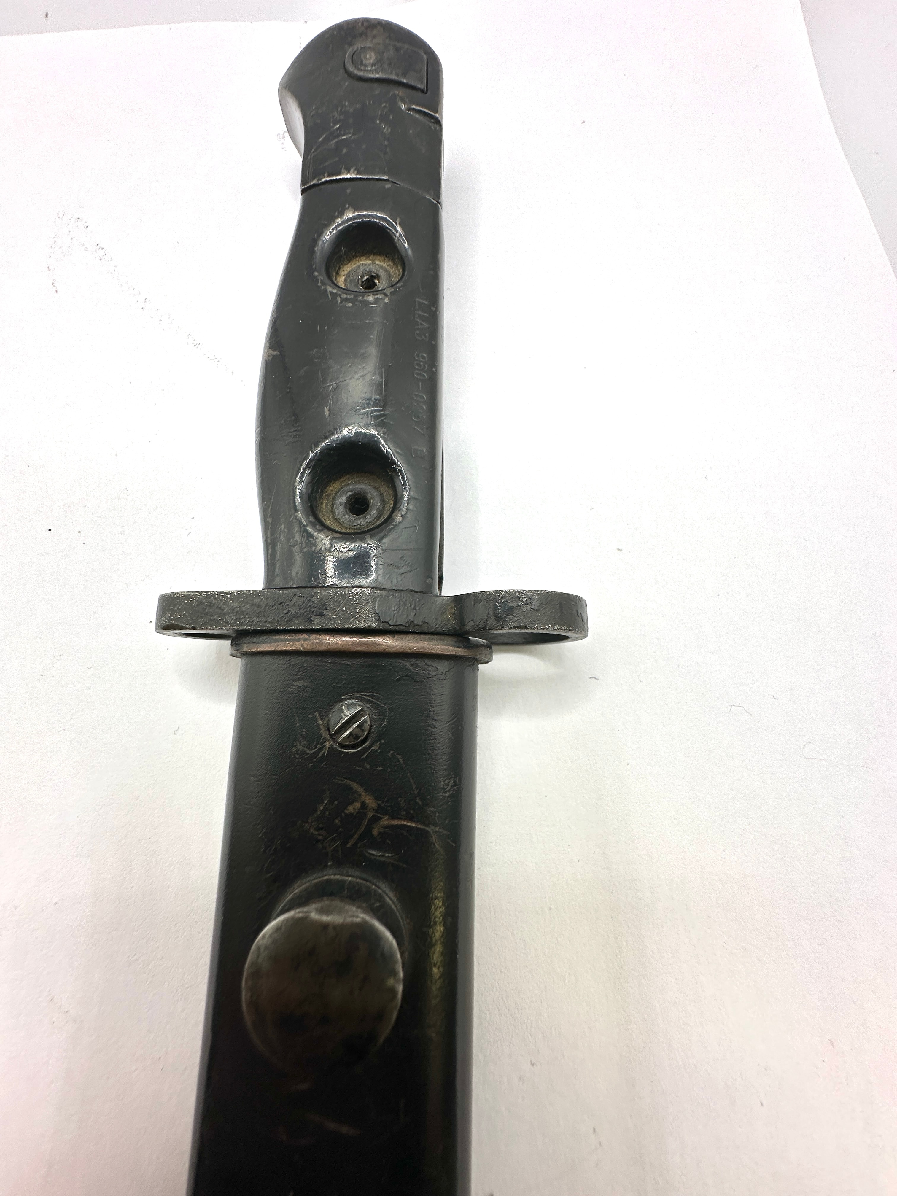 An Australian L1A2 bayonet and its accompanying scabbard. The bayonet features a steel blade and a black, possibly polymer or hard plastic, handle. Engraved on the side of the handle is the marking “L1A3 960-0257 B”. The hilt includes a steel crossguard and a pommel with a rifle attachment mechanism, including a barrel ring and a locking button. The handle is secured by two prominent rivets. The scabbard is a simple, black-finished hard material, likely metal, with a belt attachment stud.