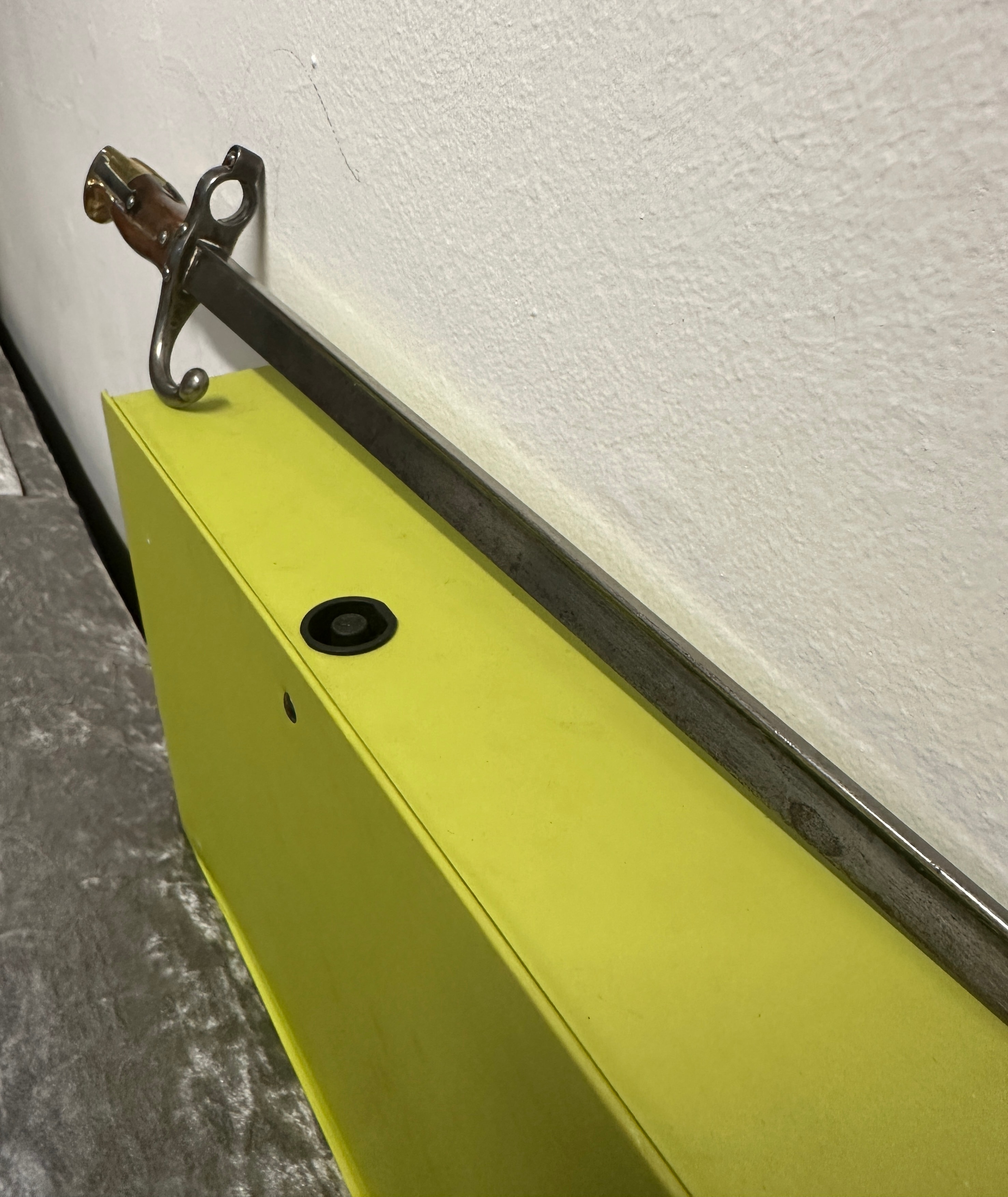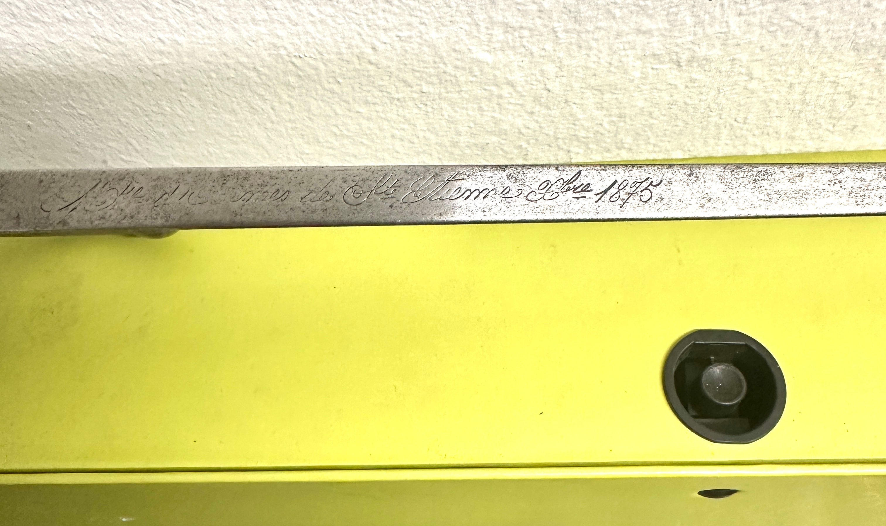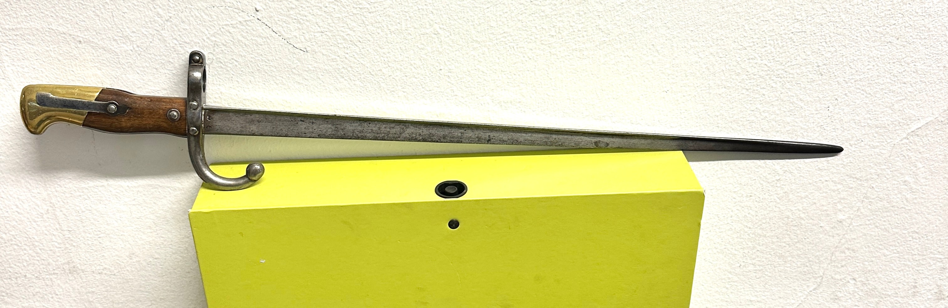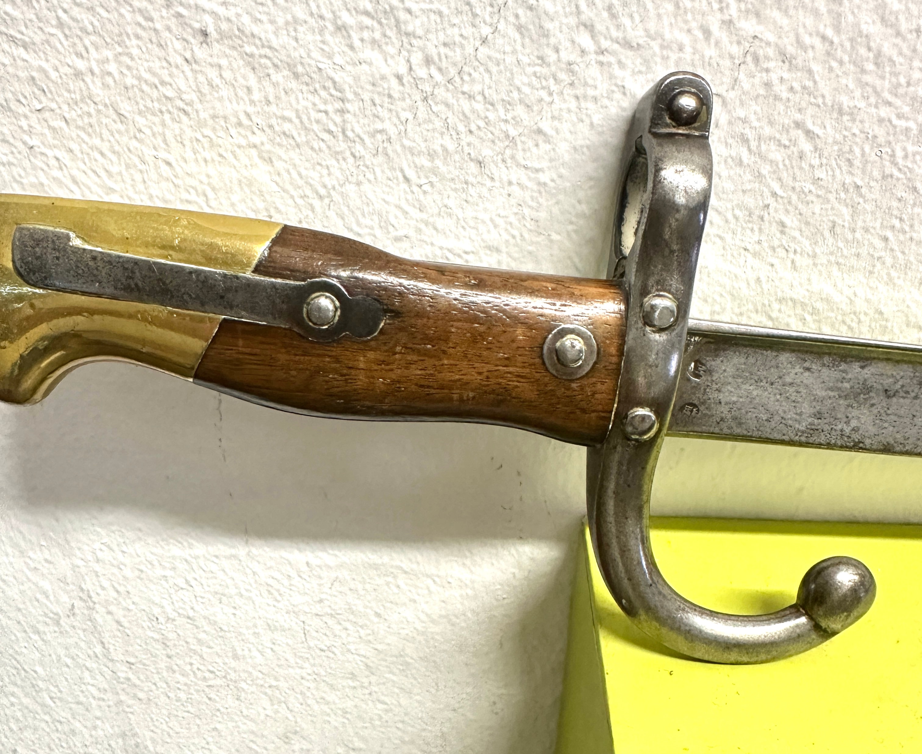 A French Model 1874 Gras Bayonet by St. Etienne. This military bayonet features a straight steel blade with an S-shaped steel crossguard, a two-piece wooden grip secured by rivets, and a brass pommel incorporating a rifle attachment mechanism. The spine of the blade is engraved with the inscription “Mre d’Armes de St Etienne 1875.”