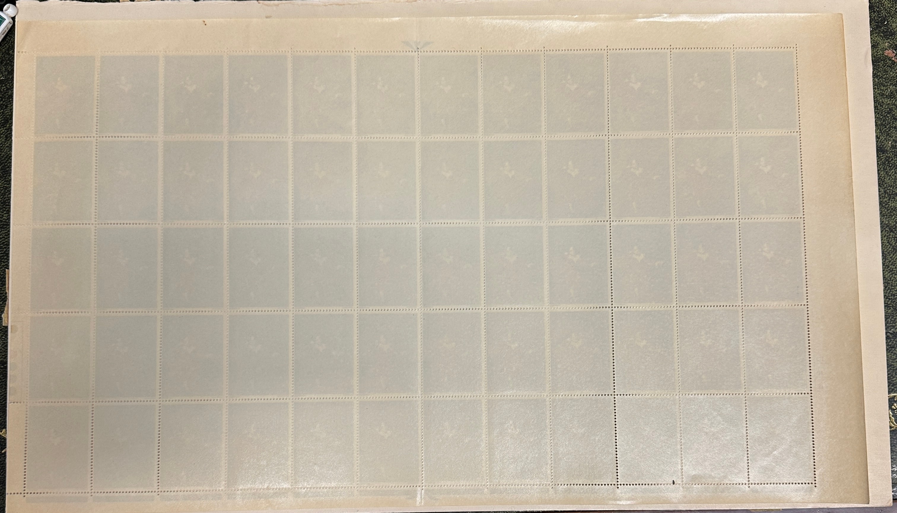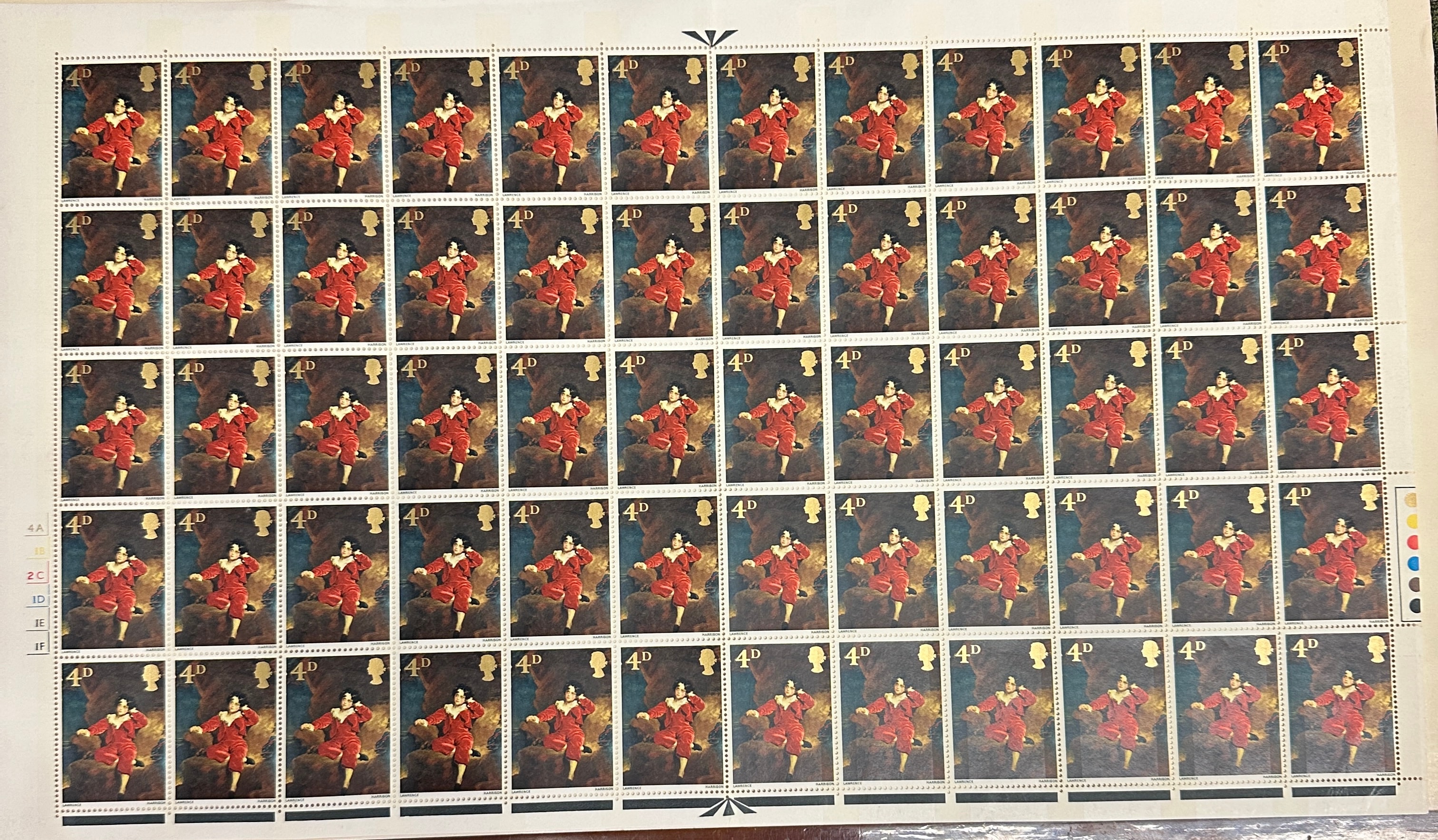 A Great Britain 1967 4d British Paintings 1st Series Complete Sheet of 60 stamps. Each stamp features a portrait of a young boy in a red suit, depicting ‘Master Lambton’ by Sir Thomas Lawrence. The denomination ‘4D’ is clearly printed, along with the names ‘LAWRENCE’ and ‘HARRISON’ visible below the central image. The sheet is arranged in 6 rows of 10 stamps and retains its original selvedge. Printer’s marks, including “M.A.” and “HARRISON”, are visible on the left margin, with color registration dots (CMYK) on the right. The reverse side reveals a uniform crown watermark across the entire sheet. The stamps are mint, unused, and retain their intact gum.
