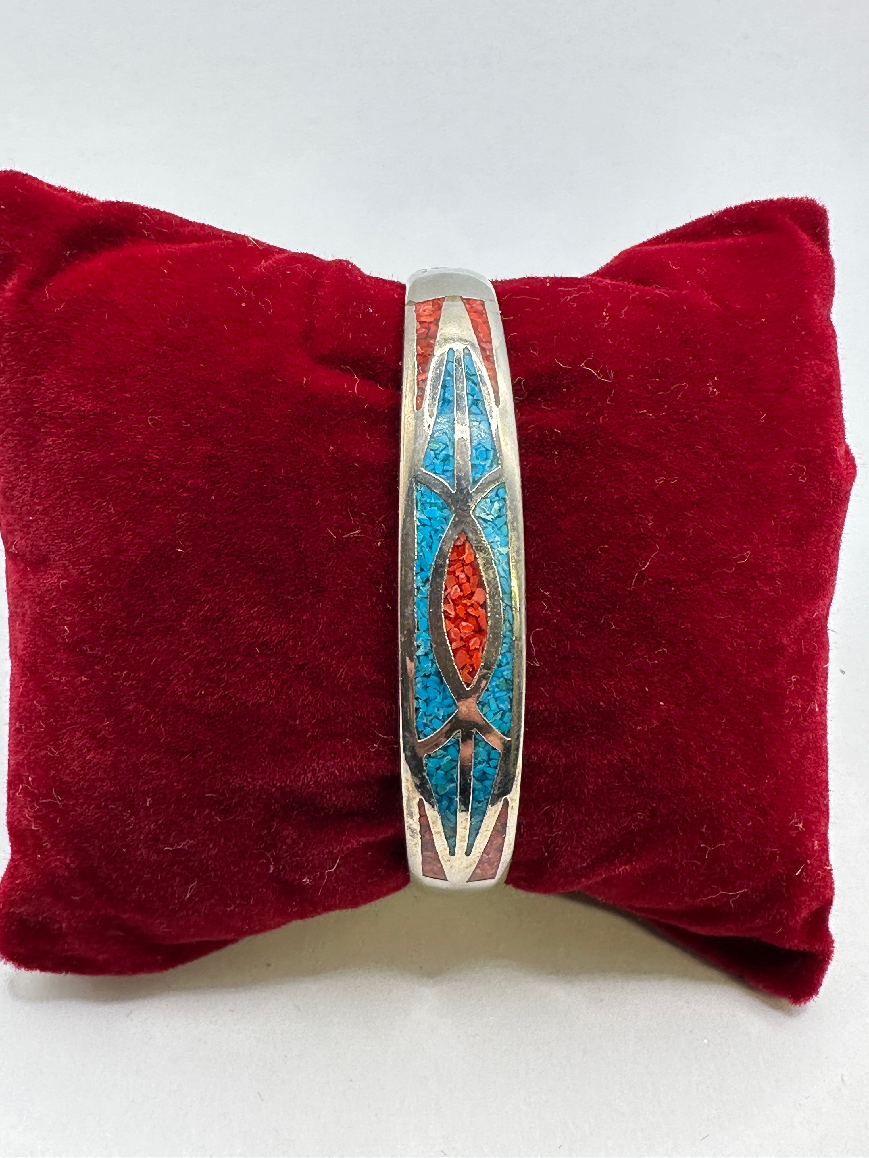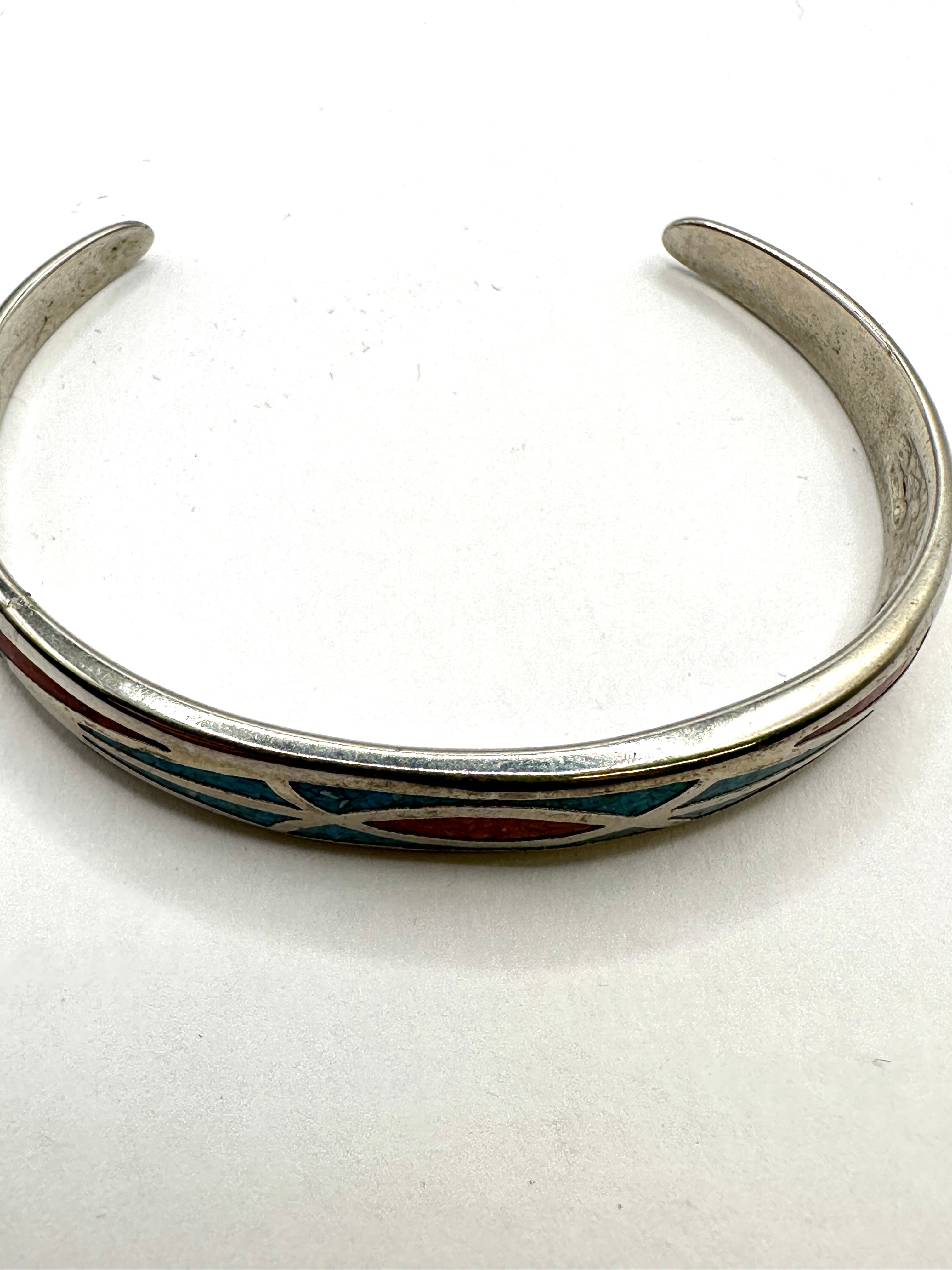 A vintage Southwestern cuff bracelet crafted from white metal, featuring channel inlay work with crushed turquoise and a red stone, likely coral or spiny oyster. The inlay is arranged in alternating geometric patterns, with the design along the top surface consisting of interconnected oval and angular shapes in blue and red. A faint, illegible marking is visible on the interior surface of the cuff, possibly a maker’s mark or metal purity stamp.