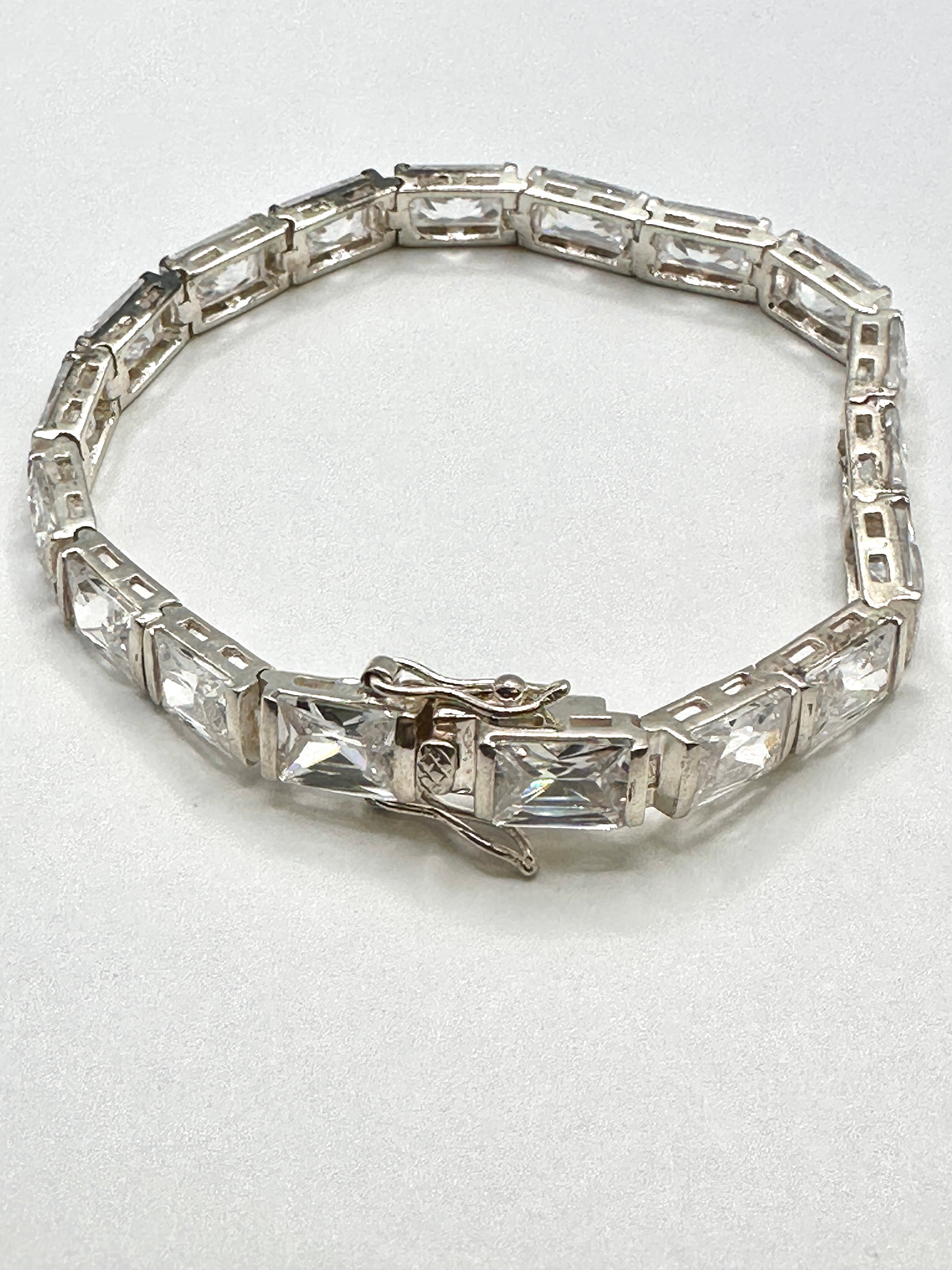 A sterling silver tennis bracelet featuring emerald-cut cubic zirconia stones. The bracelet is designed with a continuous line of individually set, clear, rectangular faceted stones, each secured within a four-sided frame, forming a flexible, linked band. It is equipped with a box clasp and an additional hinged safety catch. The underside of the clasp is marked ‘925’ for sterling silver, alongside another less distinct hallmark.