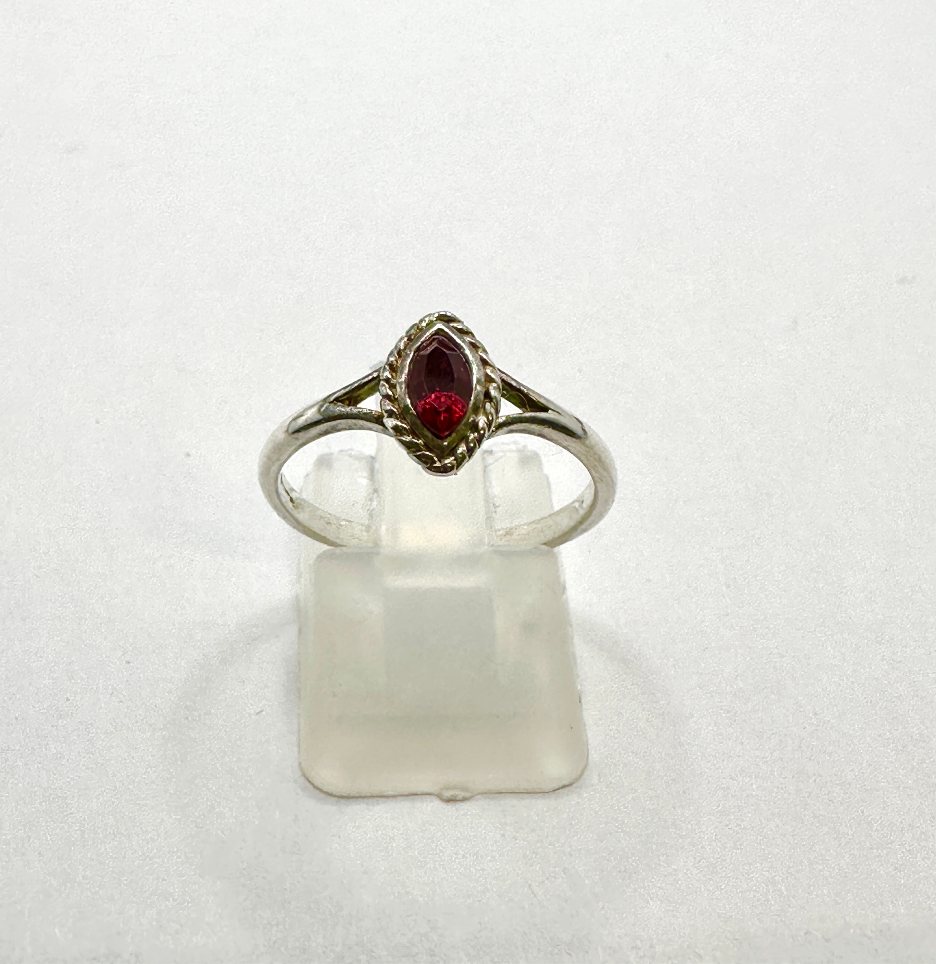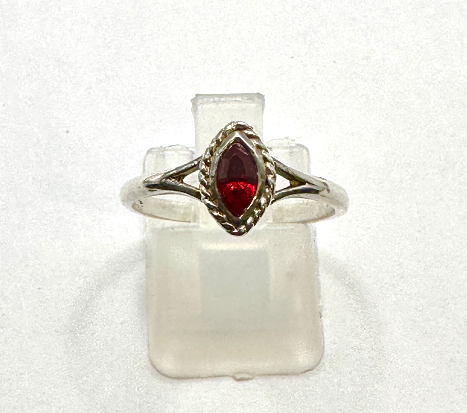 A 925 sterling silver ring featuring a marquise-cut red garnet. The gemstone is set within a bezel with a twisted rope border. The band has a simple split-shank design that tapers to a solid shank.