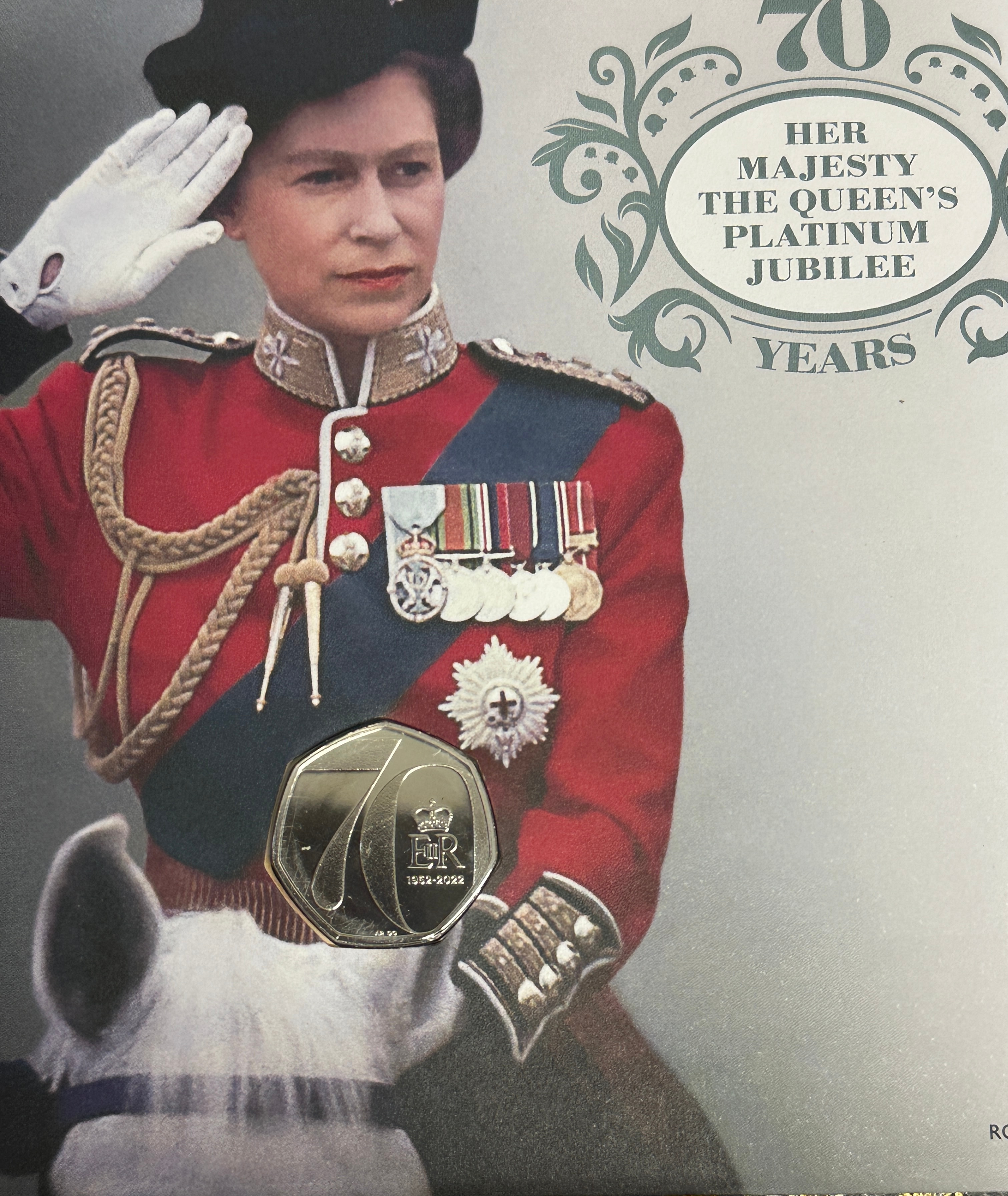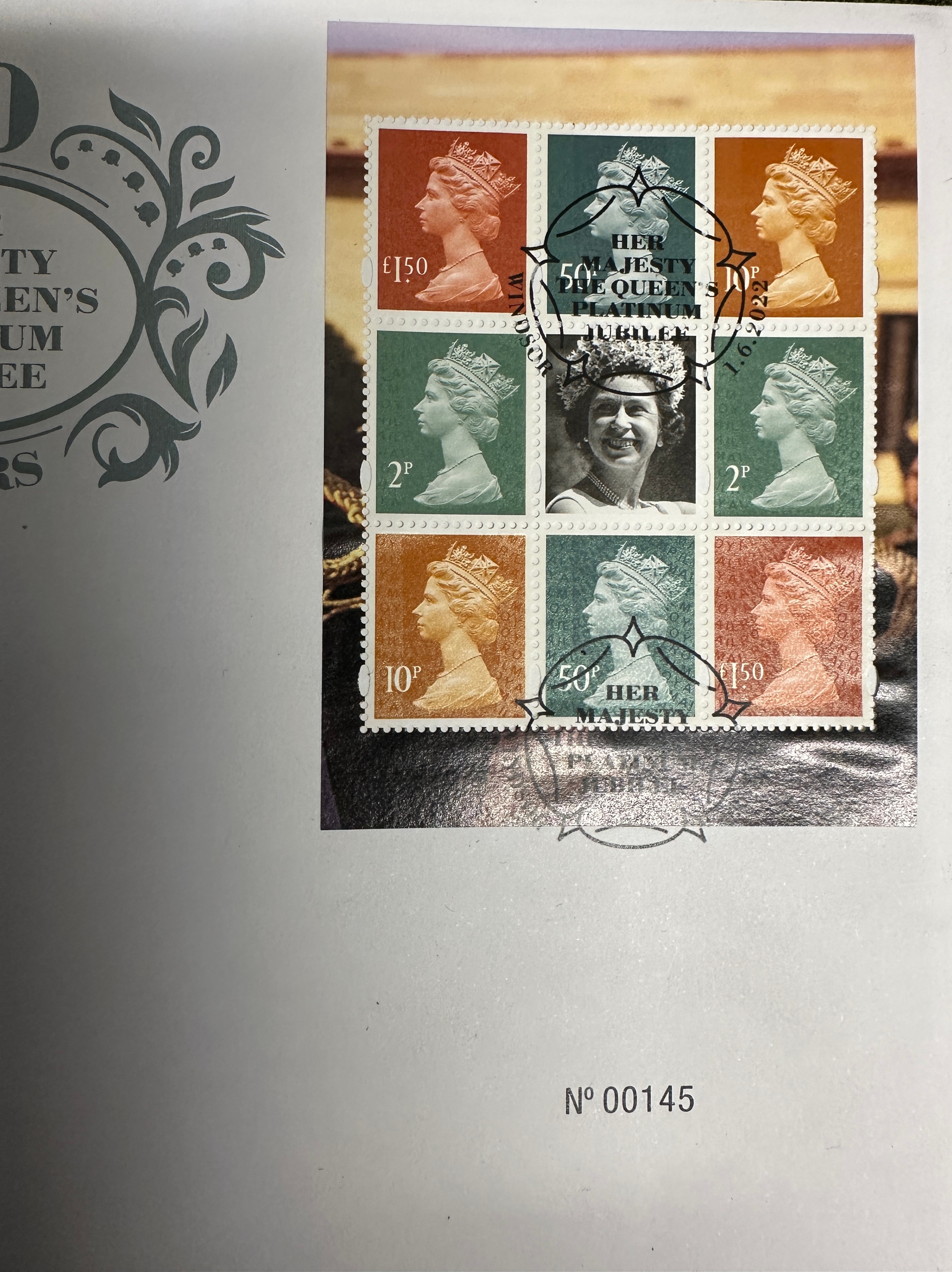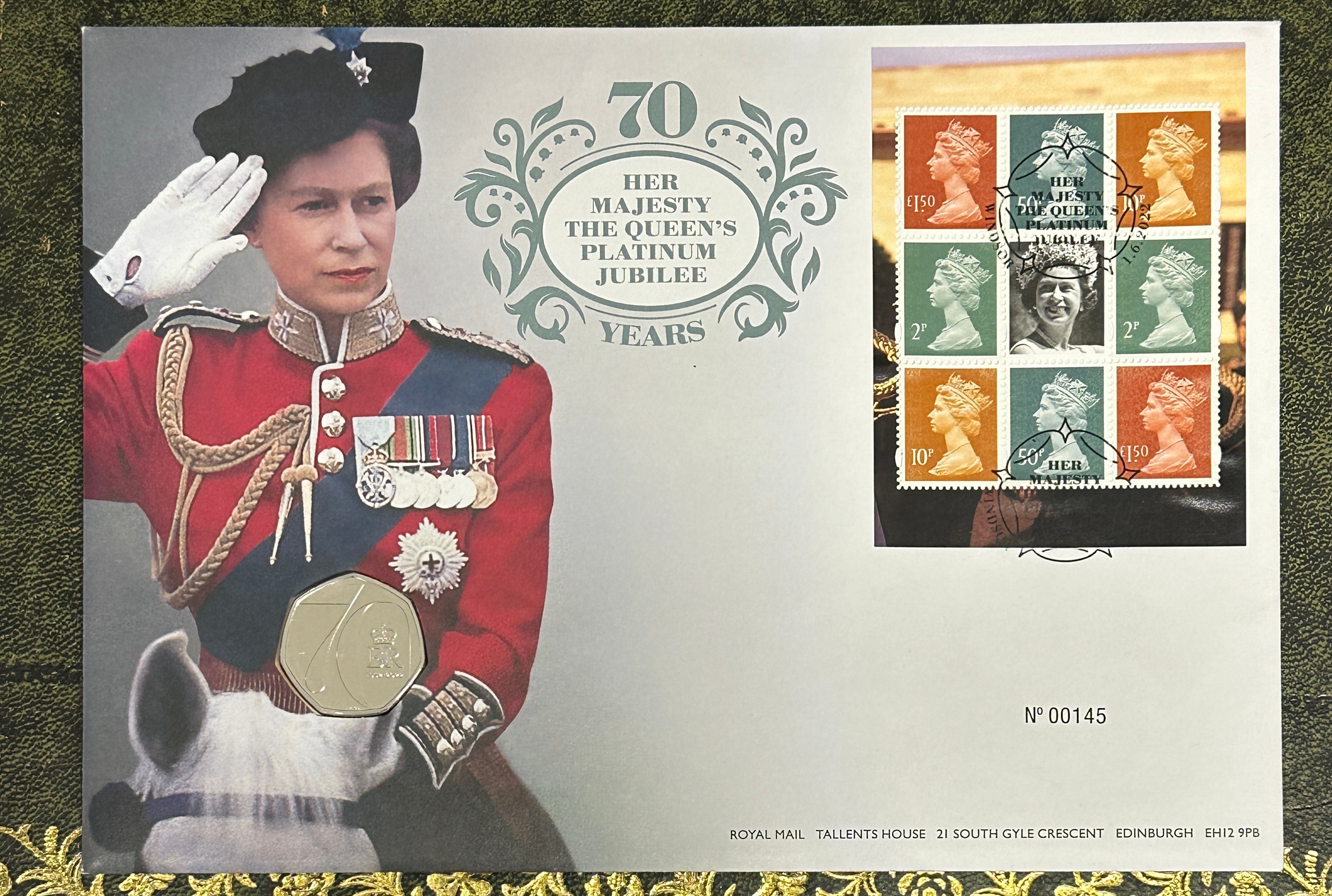A Royal Mail Her Majesty The Queen’s Platinum Jubilee 50p Coin Cover. This commemorative presentation envelope or first-day cover celebrates the Royal Platinum Jubilee of Queen Elizabeth II in 2022. The front features a large photographic image of Queen Elizabeth II in military uniform, saluting while mounted on a horse. Prominent text reads “70 HER MAJESTY THE QUEEN’S PLATINUM JUBILEE YEARS”. An embedded metallic 50 pence coin displays the crowned “E II R” cypher and the dates “1952-2022”. A block of nine United Kingdom postage stamps, depicting various profiles and one smiling portrait of the Queen, is affixed to the top right, with denominations including £1.50, 2P, 10P, and 50P visible. A partial circular postmark over the stamps reads “HER MAJESTY 50E QUEEN’S PLATINUM JUBILEE”. The envelope, made of paper/card, also bears a printed serial number “N° 00145” and the address “ROYAL MAIL TALLENTS HOUSE 21 SOUTH GYLE CRESCENT EDINBURGH EH12 9PB”.