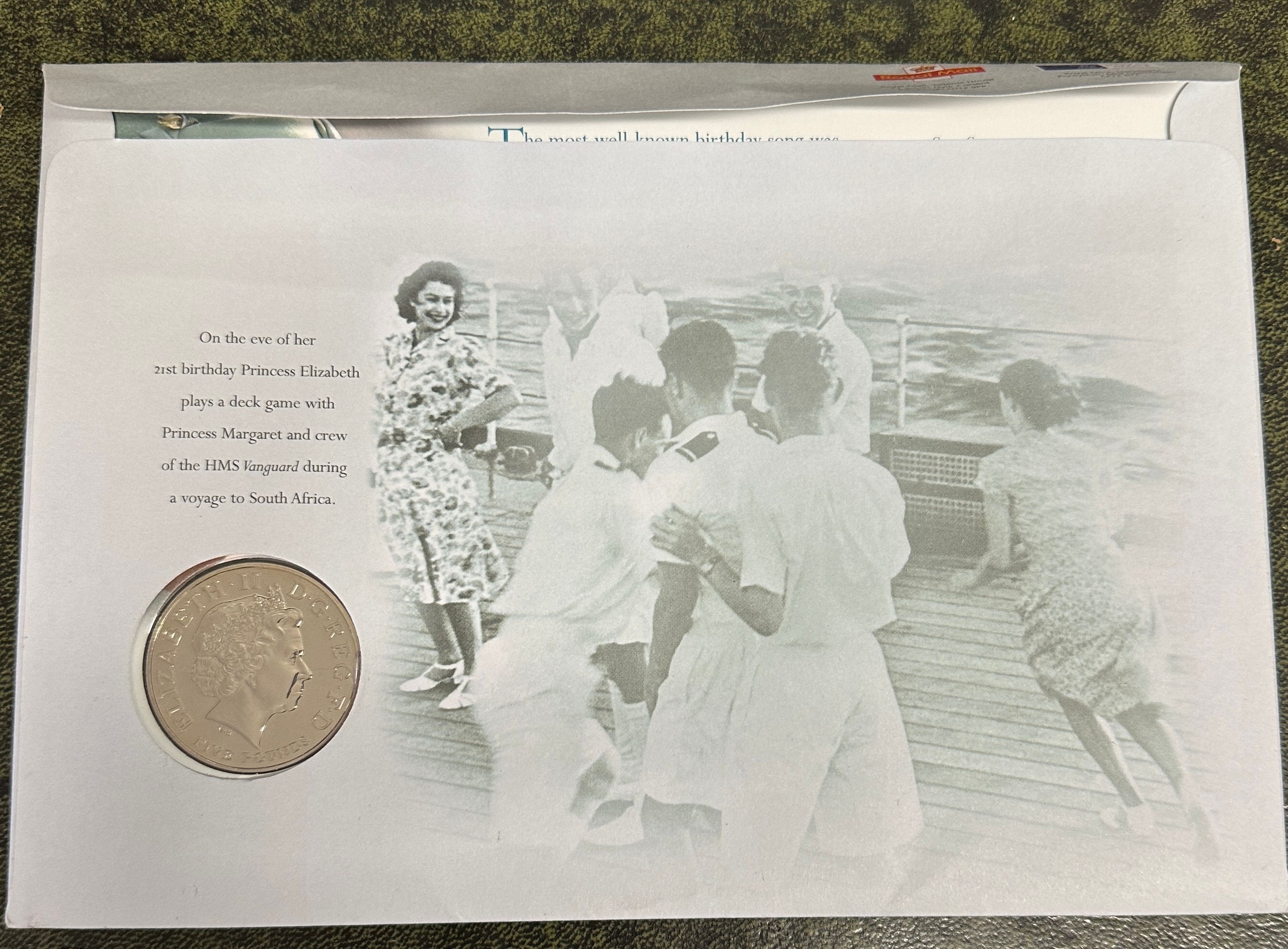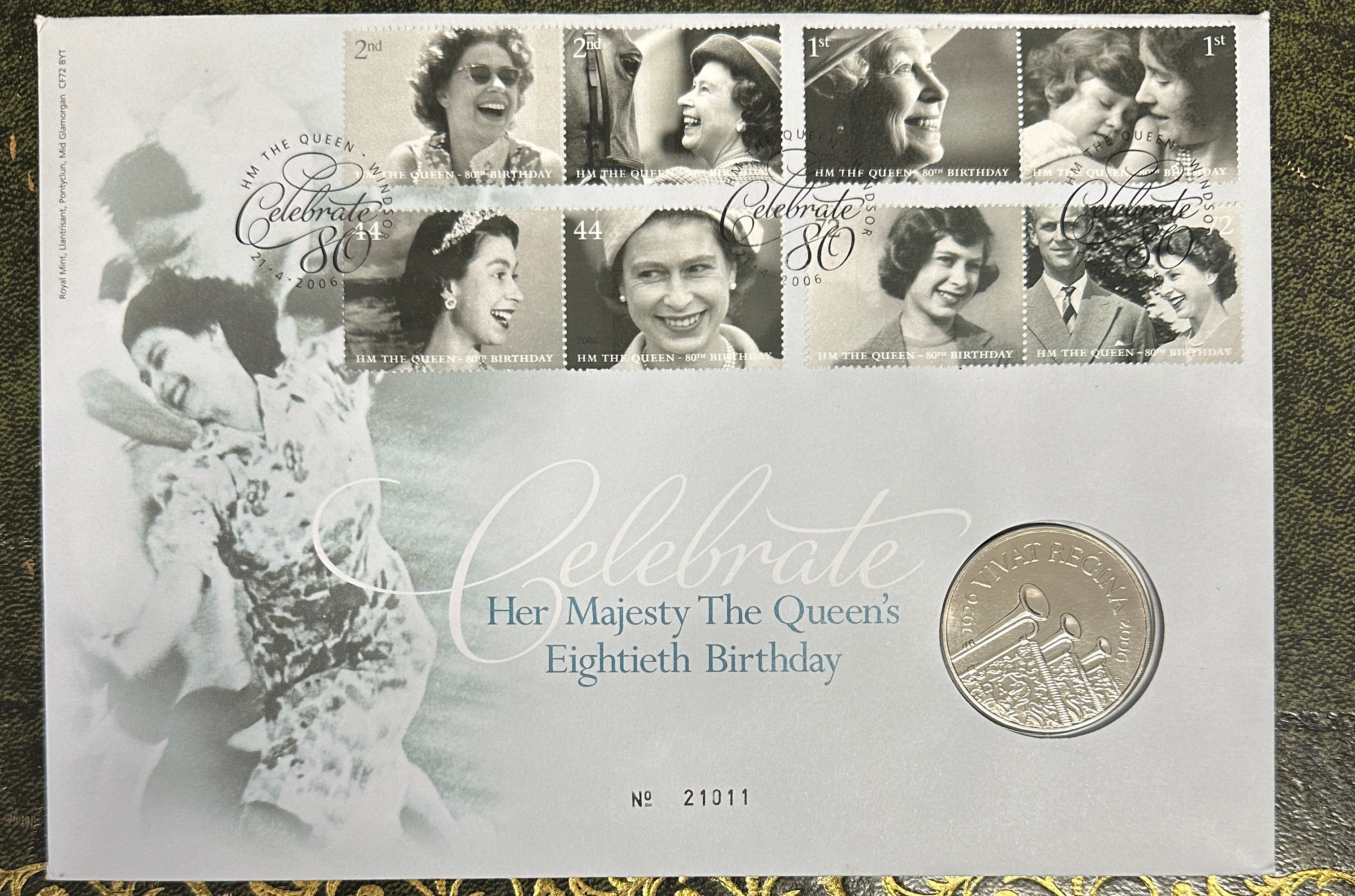 A Royal Mail 2006 Queen Elizabeth II 80th Birthday Commemorative Presentation Pack. The front features the title “Celebrate Her Majesty The Queen’s Eightieth Birthday” and the identifier “№ 21011.” A large grayscale photograph of two embracing figures is prominently displayed, alongside the producer’s mark “Royal Mail, Llantrisant, Pontyclun, M44 Ganorgan CF72 BYT.” Six affixed postage stamps, dated “2006” and marked “HM THE QUEEN – 80th BIRTHDAY,” depict various stages of the Queen’s life with denominations including “2nd,” “1st,” and “44.” An embedded silver-toned coin displays a portrait of Queen Elizabeth II with the legend “ELIZABETH II D G REG F D” and “2006” on its obverse, and stylized trumpets with “1926 E II R 2006” on its reverse. The reverse of the pack includes a grayscale photograph of Princess Elizabeth playing a deck game, accompanied by text describing the event. The item is composed of paper/card with metal (coin) and paper (stamps) inserts.