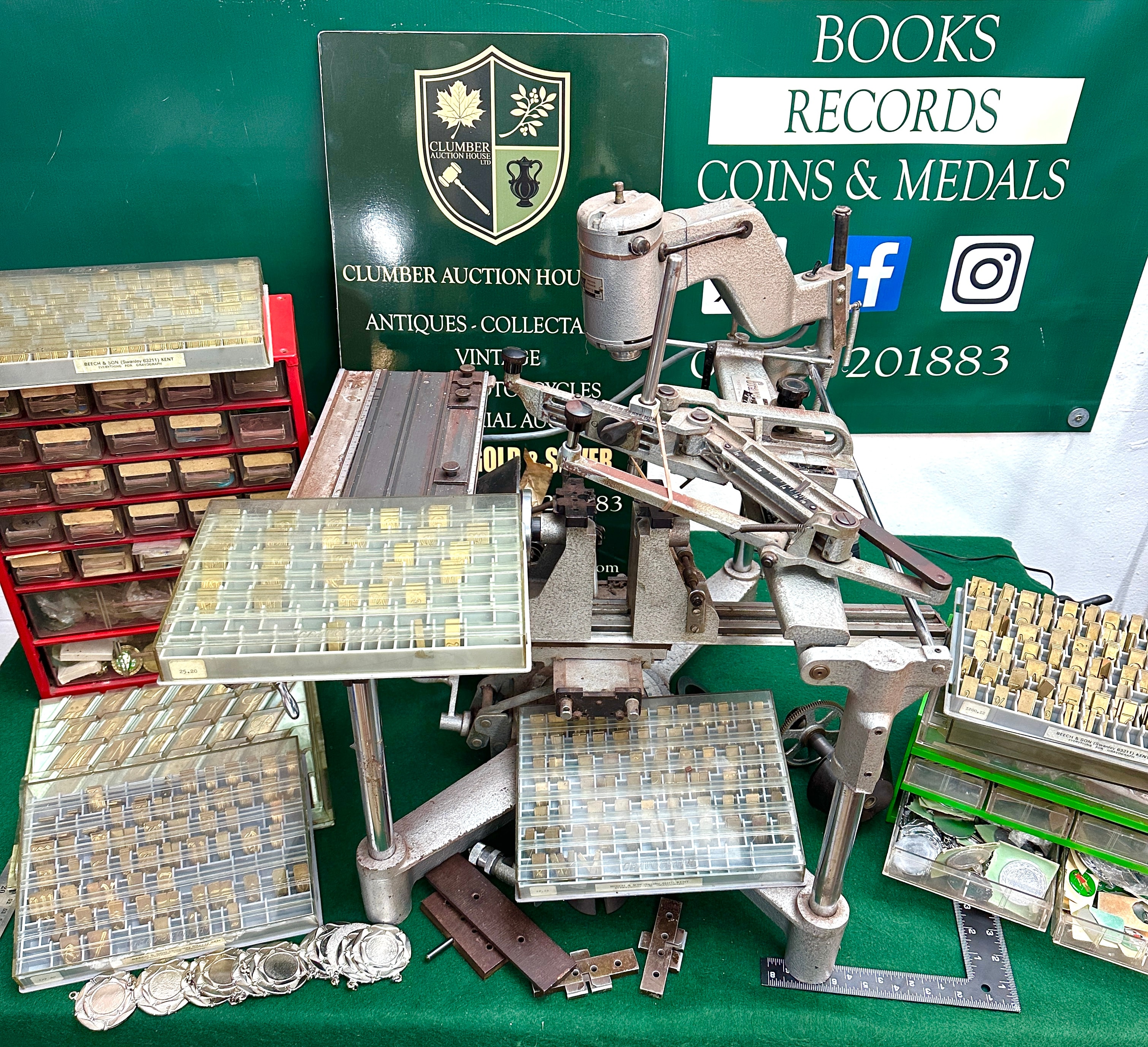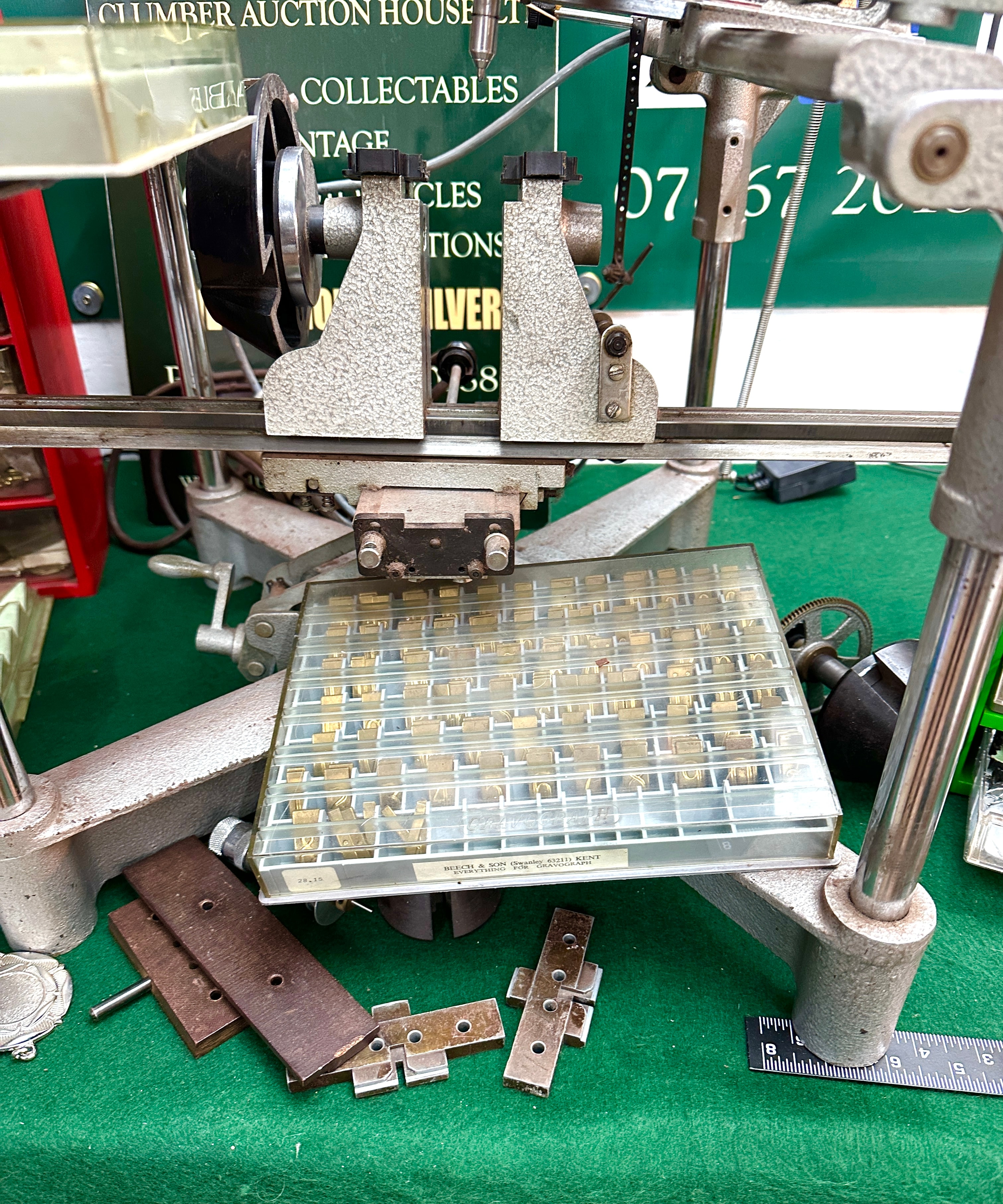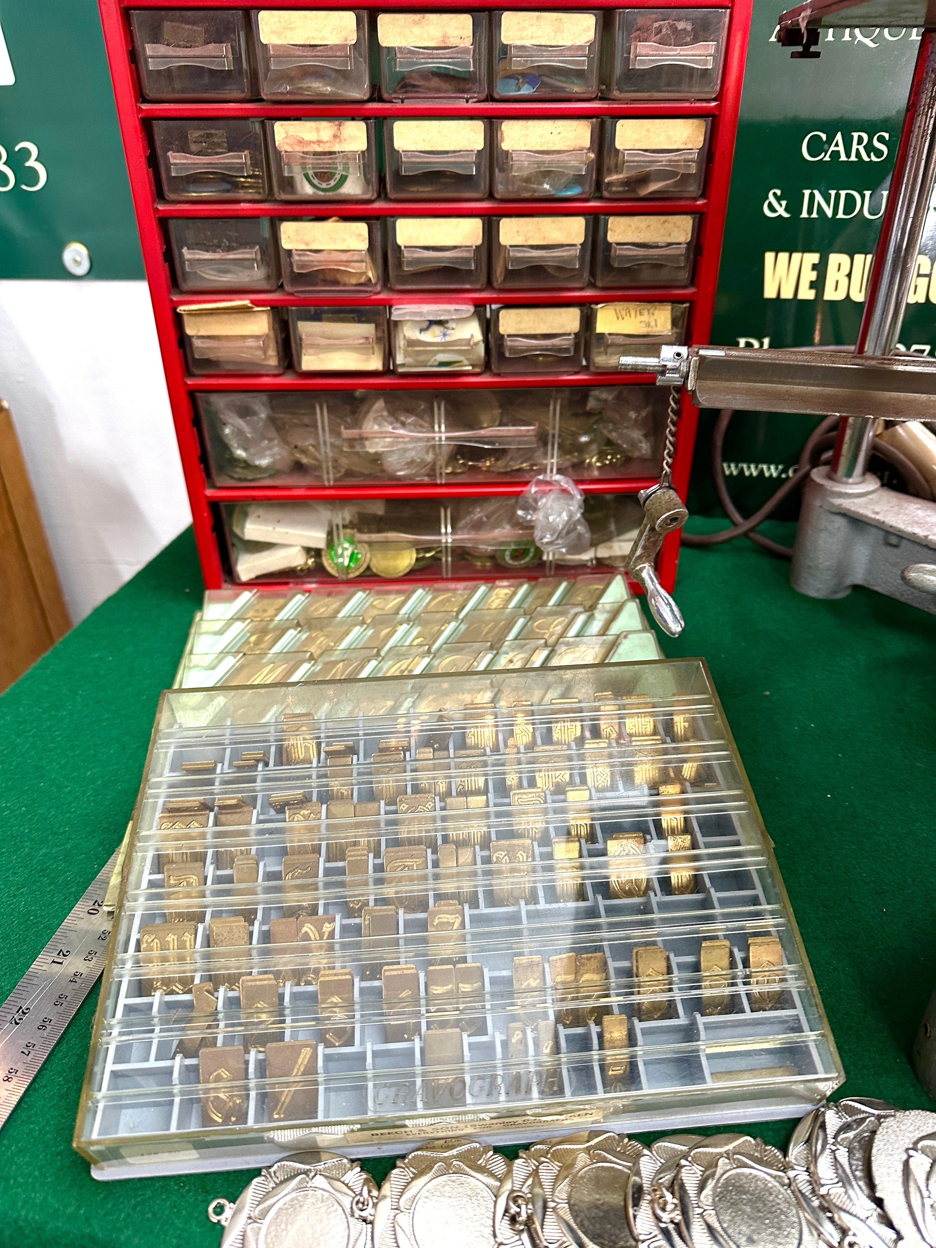 A Gravograph pantograph engraving machine, predominantly constructed from silver-grey painted cast metal and steel, appearing to be from the mid-20th century. Accompanying the machine is a substantial collection of brass individual letter, number, and symbol type blocks, arranged in multiple clear plastic storage trays, some marked “BEECH & SON (ENGRAVING) SIDCUP, KENT”. Also included are a red multi-drawer cabinet containing various small parts, components, and engraving blanks, alongside a collection of unengraved metal medallions or tags. The machine itself bears labels for “Gravograph” and “TROY by Javelin”.