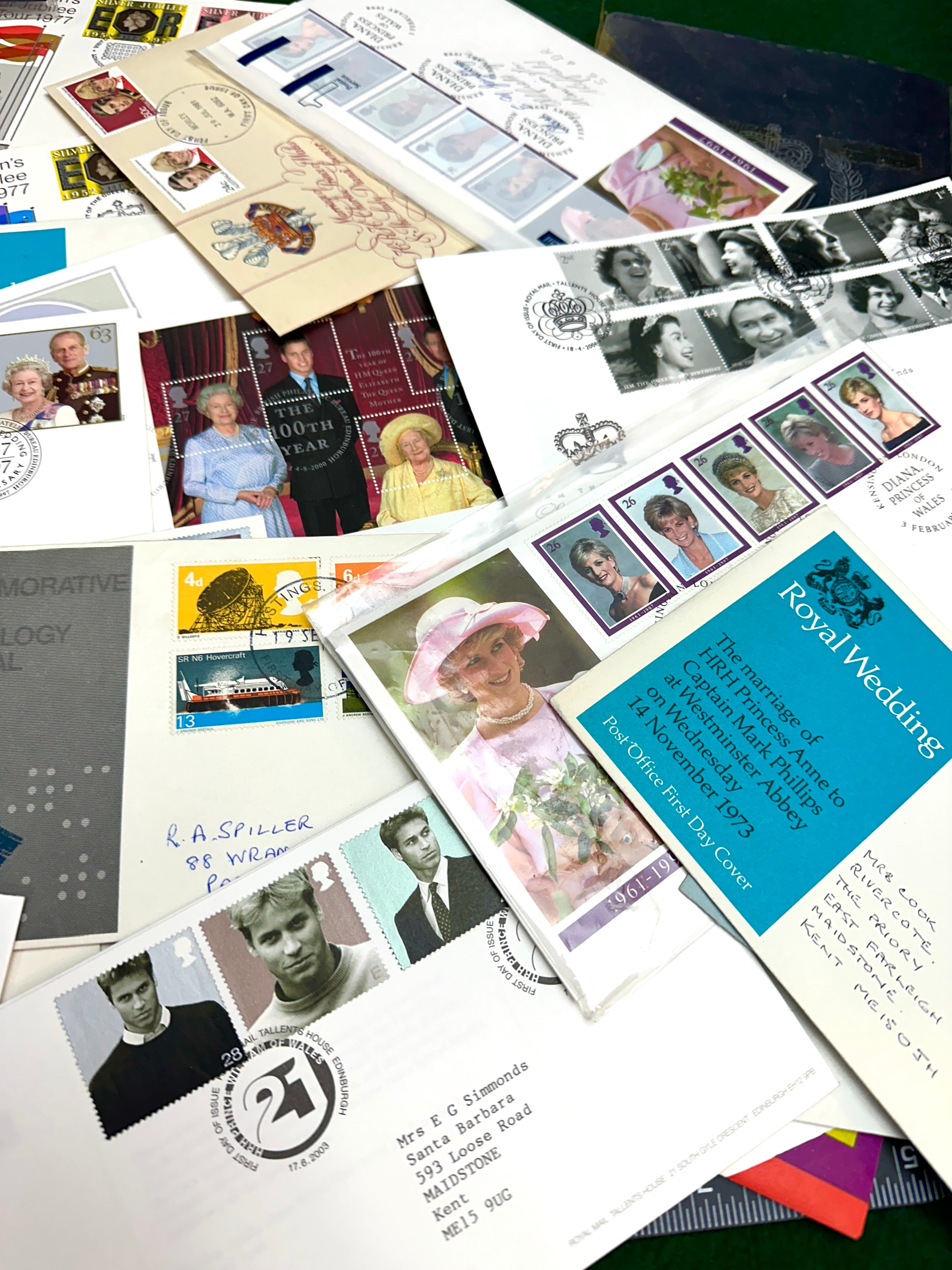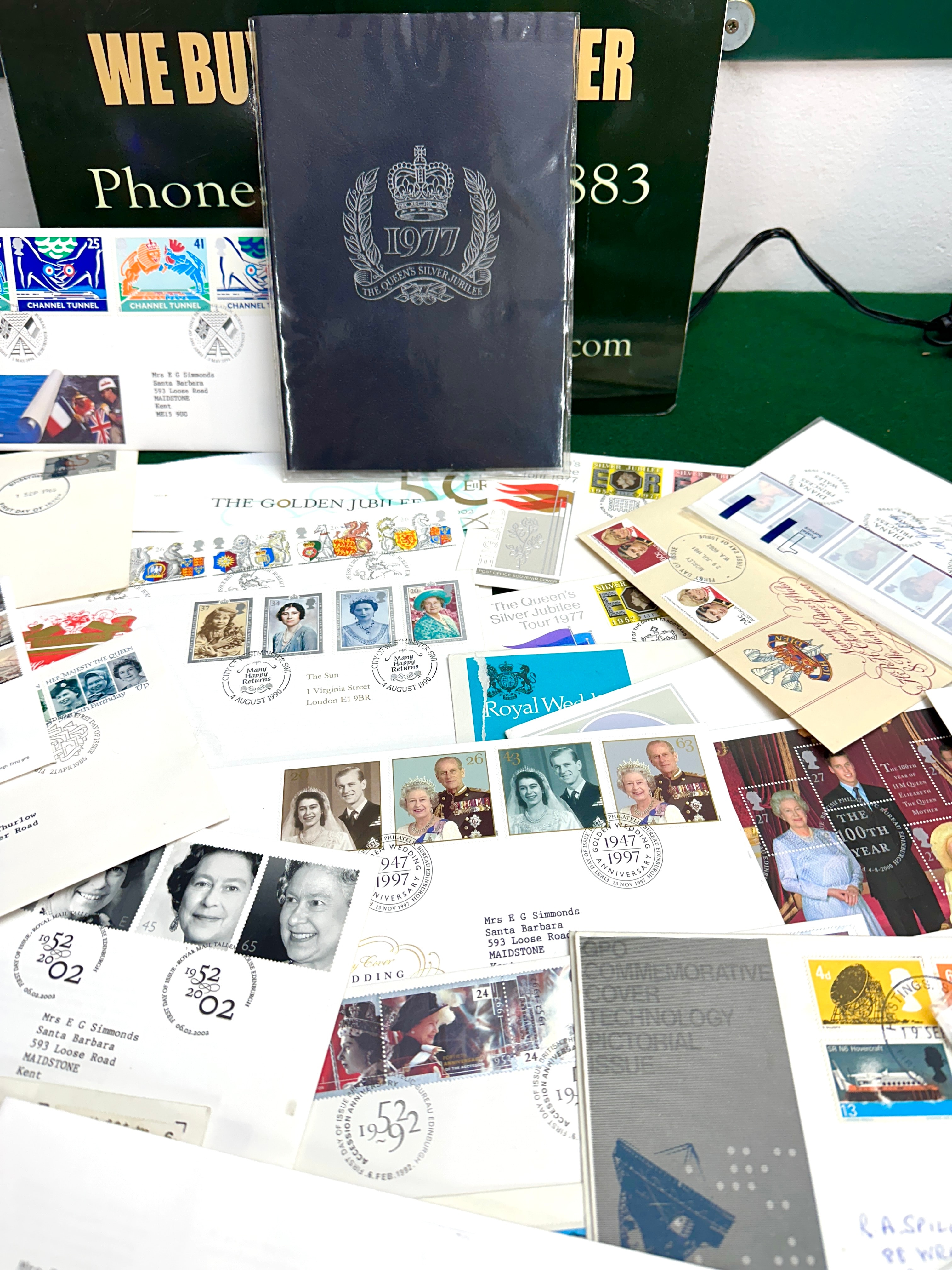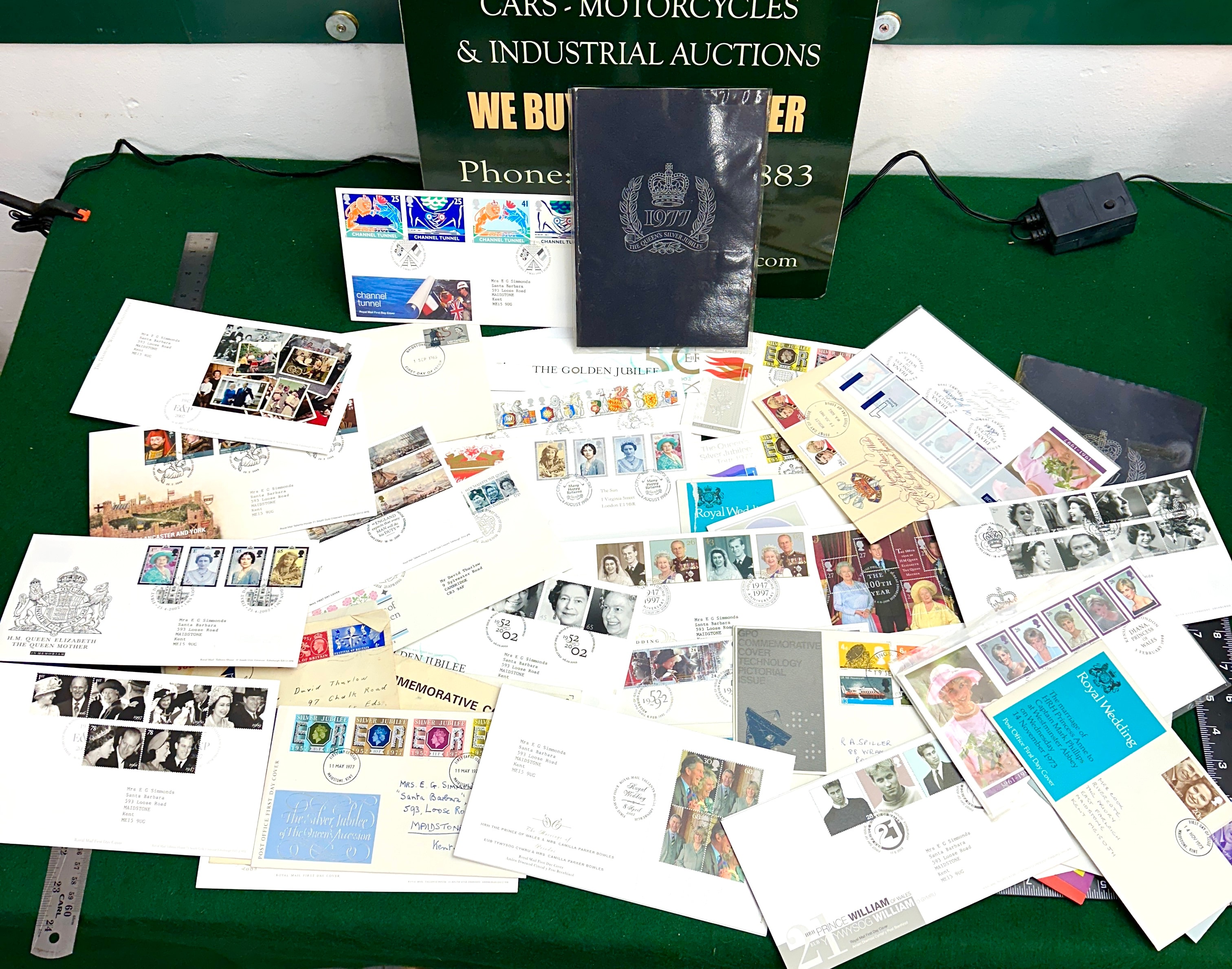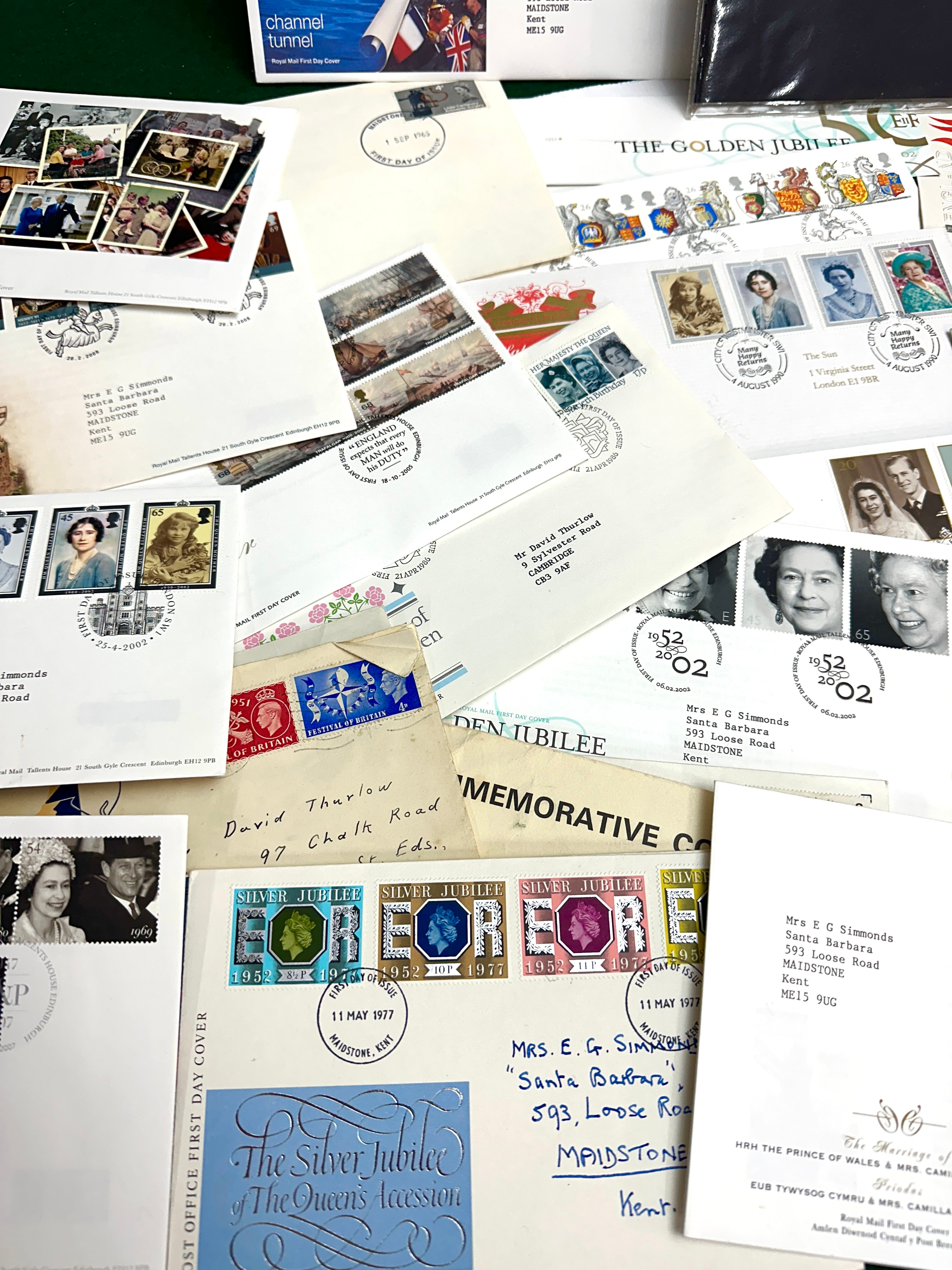 A collection of British philatelic material, primarily First Day Covers and a dark blue commemorative booklet. The paper covers feature various British postage stamps and dated postmarks commemorating significant royal events and anniversaries, including “The Queen’s Silver Jubilee 1977” (a title also present on the booklet), “The Golden Jubilee 1952-2002,” and various “Royal Wedding” commemorations (such as Princess Anne’s 1973 marriage), alongside covers related to Princess Diana, Prince William’s 21st birthday, and the “Channel Tunnel.” Many envelopes are addressed, notably to “Mrs E G Simmonds” in Maidstone, Kent, and “Mr David Thurlow.”