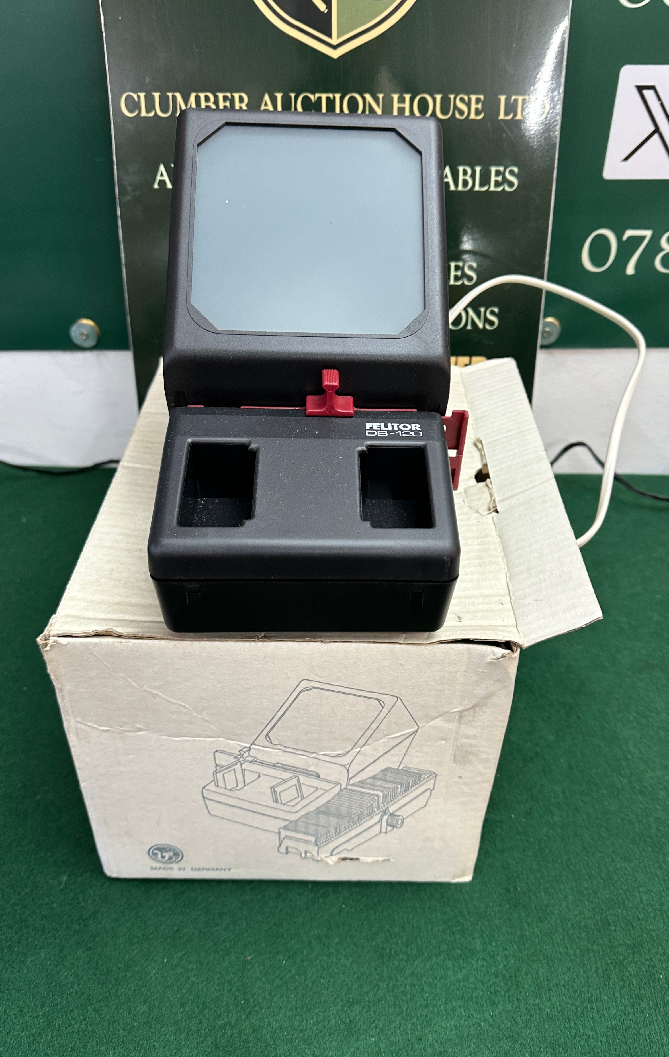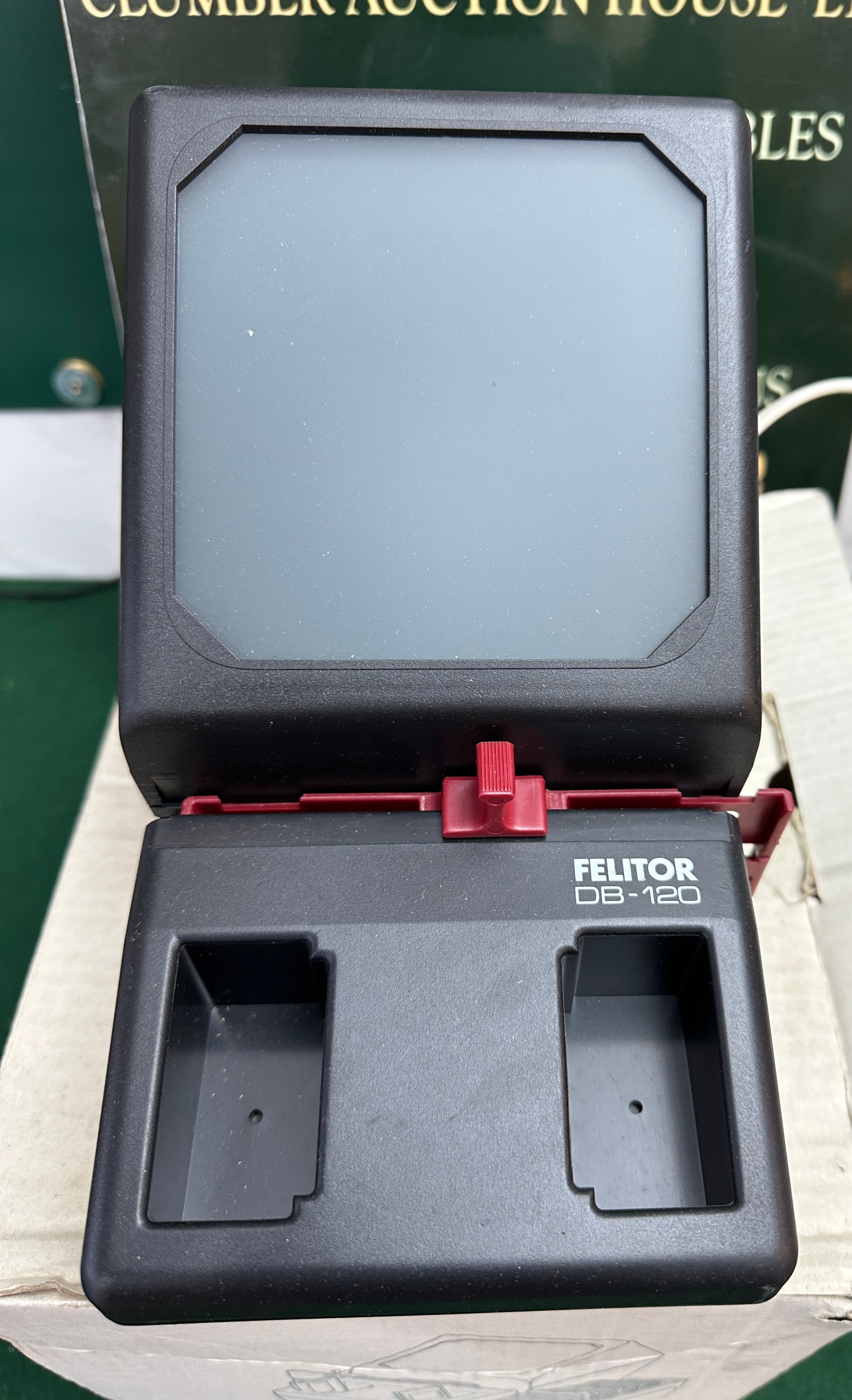 A Vintage Eumig DB120 Compact Desktop 35mm Slide Viewer. This electronic device features a hinged black plastic casing with dark red accents. The upper section contains a rectangular, dark display screen, while the lower base unit presents two recessed bays. The base is inscribed ‘FELITOR DB-120’. It comes with its original cardboard box, which displays a schematic drawing of the device, a ‘CE’ mark, and the phrase ‘MADE IN GERMANY’.