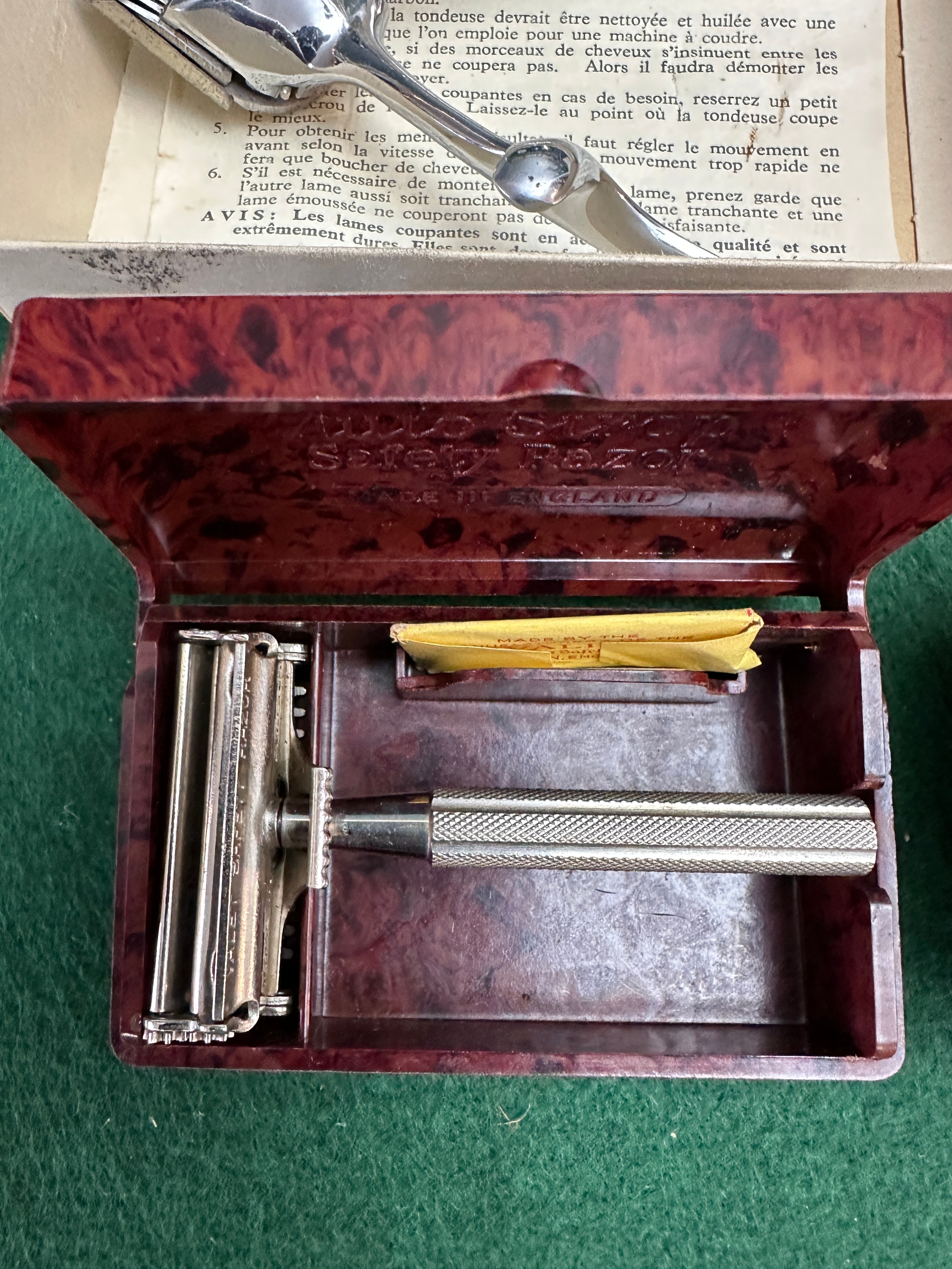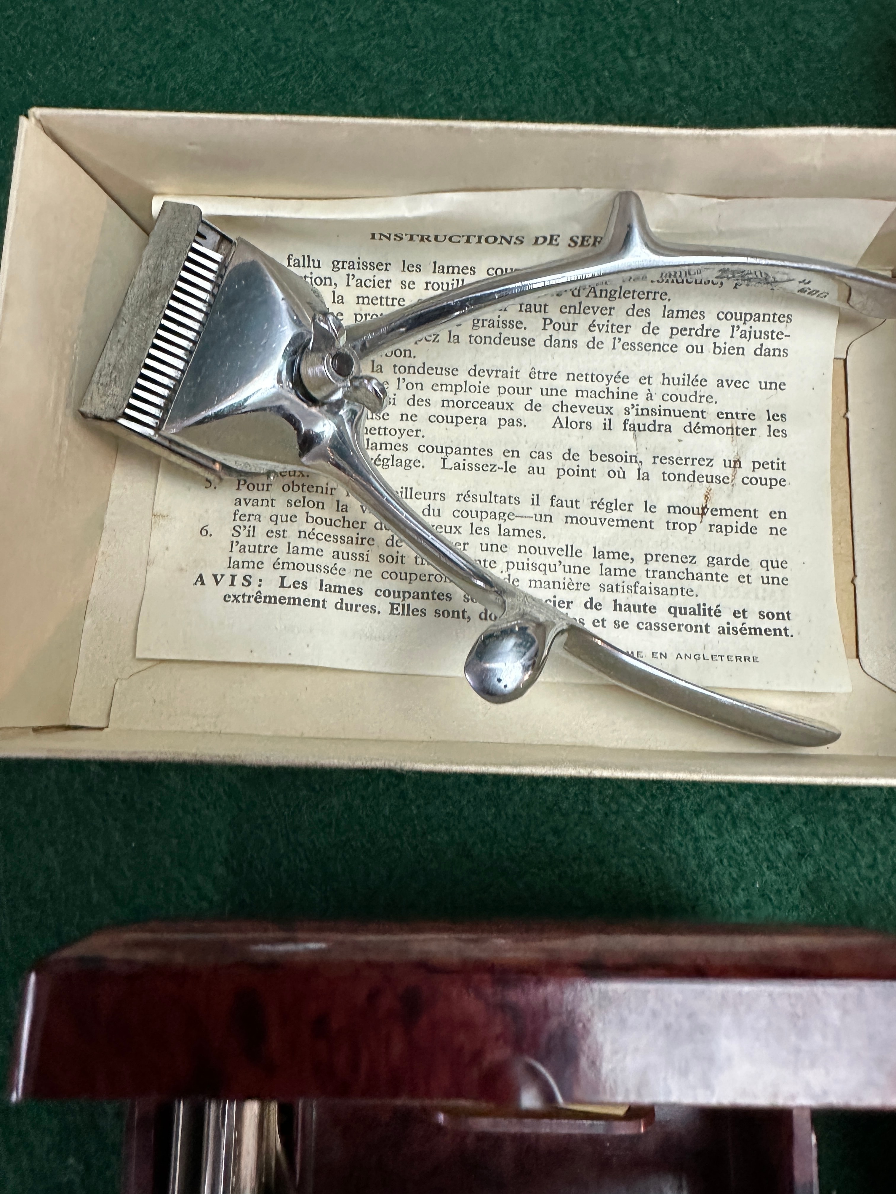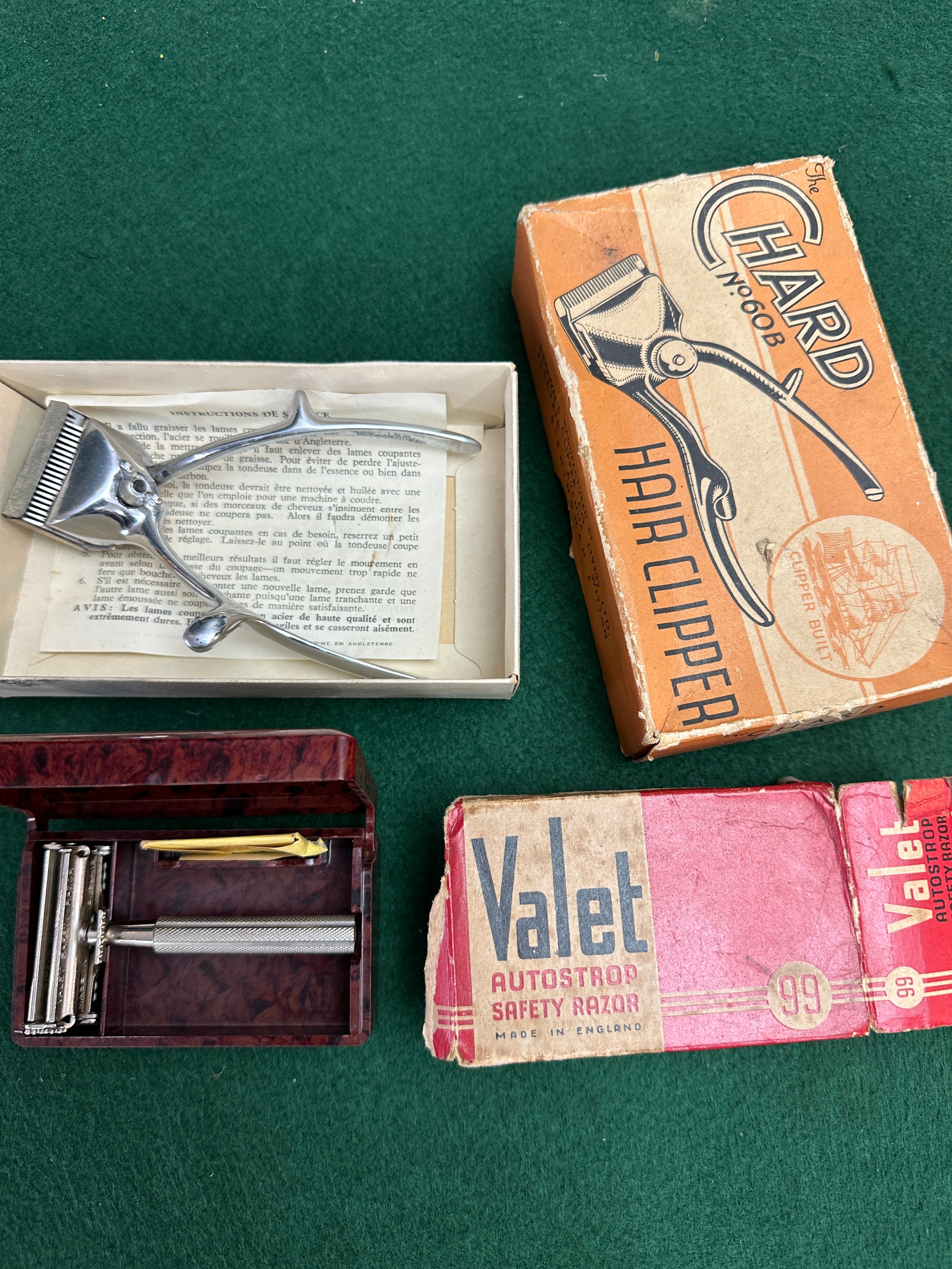 A collection of vintage personal grooming implements, primarily from the mid-20th century. The collection features an S.P. CHARD N°60B HAIR CLIPPER, presented in its original orange cardboard box. Accompanying this is a second chrome-plated manual hair clipper, housed in a plain cardboard box with French instructions titled “INSTRUCTIONS DE SERVICE,” detailing operation and maintenance, noting the blades are “MADE IN ENGLAND” from “high-quality steel.” Also included is a VALET AUTOSTROP SAFETY RAZOR, enclosed in a mottled brown bakelite or plastic case. Completing the ensemble is a red cardboard box of “Valet AUTOSTROP SAFETY RAZOR” blades, marked “MADE IN ENGLAND” and prominently displaying “99.”