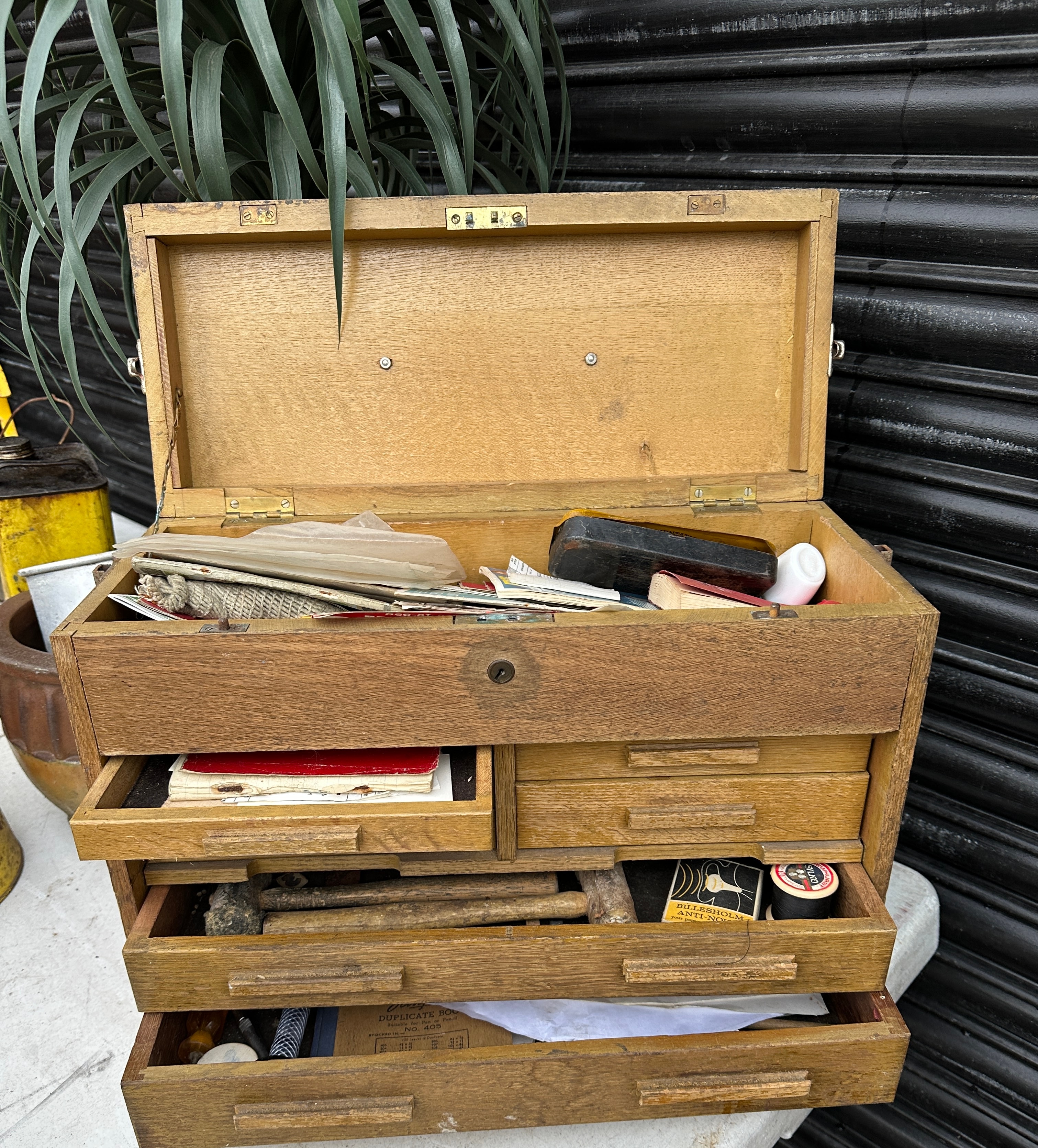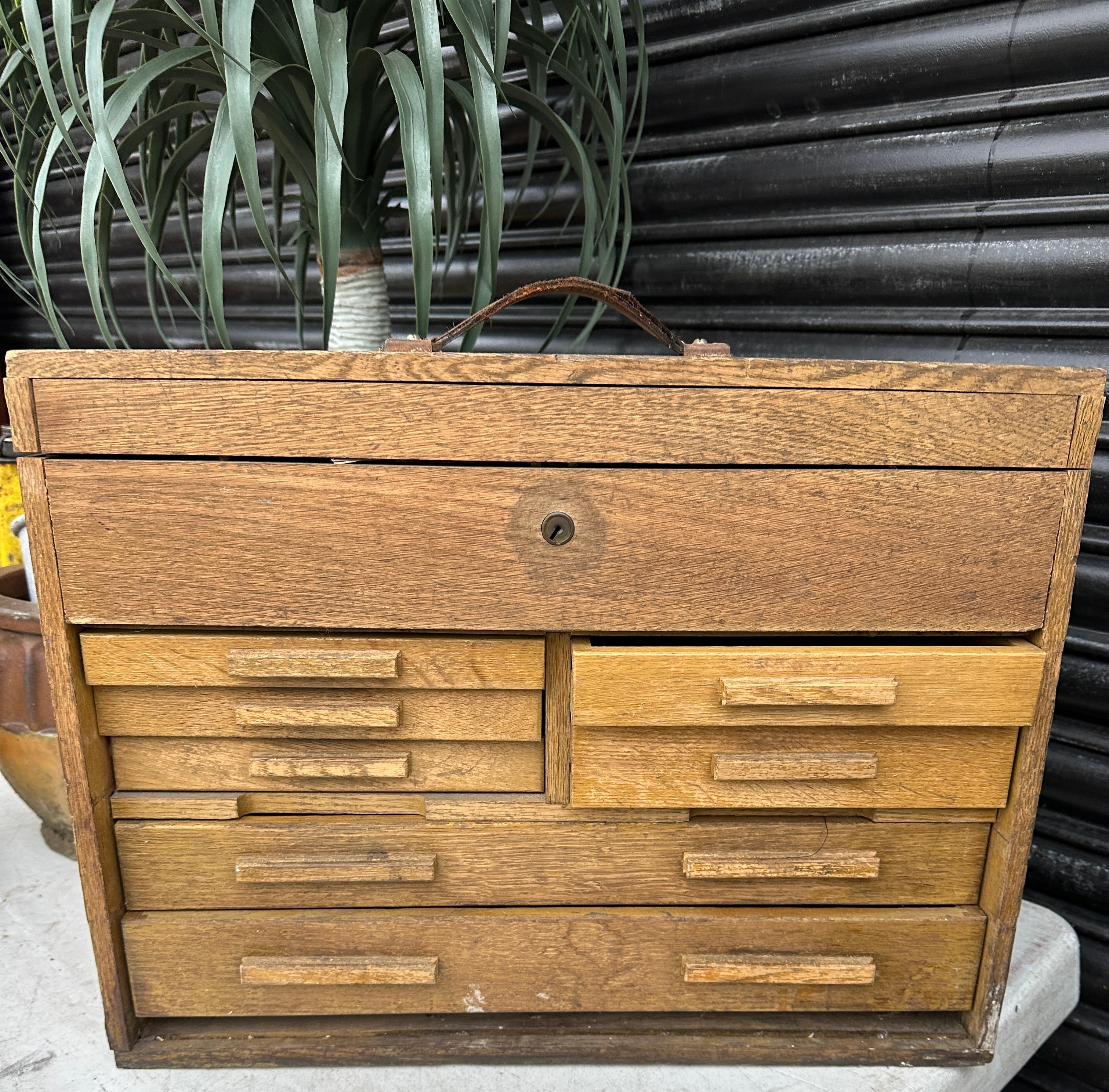A portable wooden multi-drawer chest, likely a craftsman’s or machinist’s toolbox, constructed from oak with a visible grain. It features a hinged lid with a leather handle and a brass or steel lock escutcheon on the front. Below the lidded compartment, there are five drawers arranged in two columns: three full-width drawers at the bottom, and two smaller drawers side-by-side above them. The drawers feature recessed finger pulls. Contents shown in the open drawers are not included in the lot.