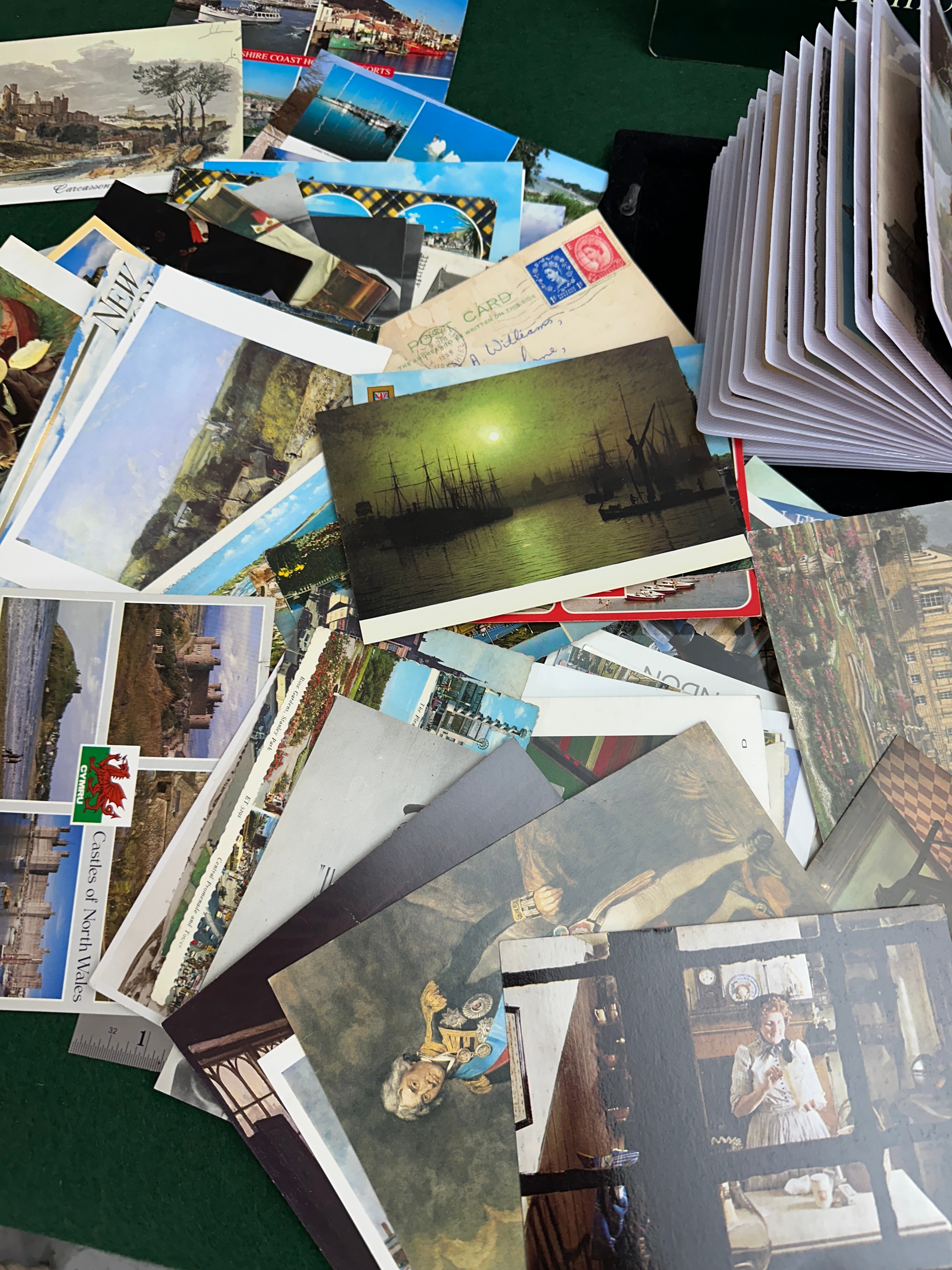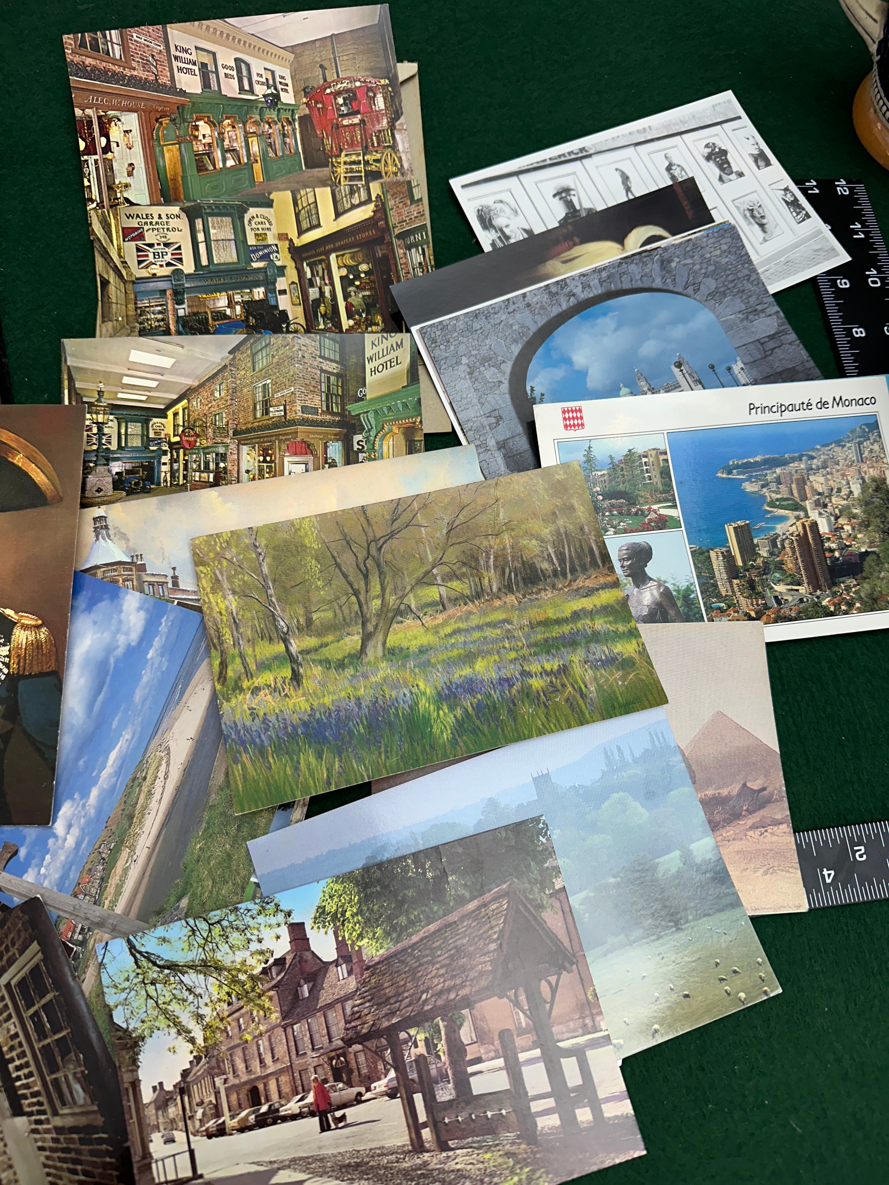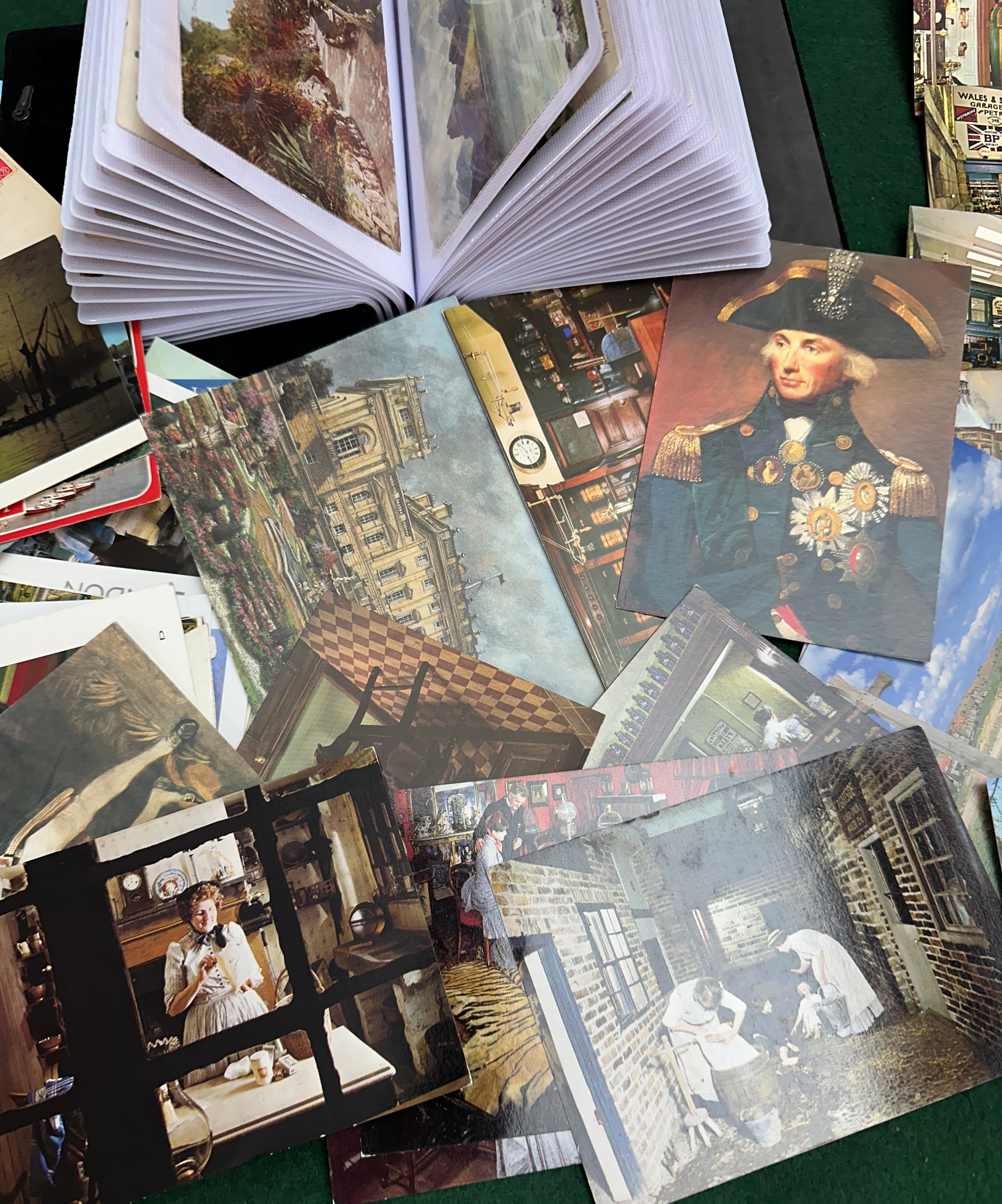 A large collection of vintage postcards, primarily loose but also with a significant portion housed within an open, multi-page postcard album. The collection spans various periods and styles, featuring diverse subjects including scenic landscapes such as fields of bluebells, coastal views, mountain ranges, and the Pyramids. Cityscapes are also present, depicting locations like “Principauté de Monaco,” historic European towns, and British architecture with signs like “KING WILLIAM HOTEL” and “WALES & SON CONFECTIONERS.” The collection further includes historical figures, notably Napoleon Bonaparte, and reproductions of artworks, such as interior genre scenes. The postcards are made from standard cardstock or heavy paper, and the album likely features plastic or paper sleeves.