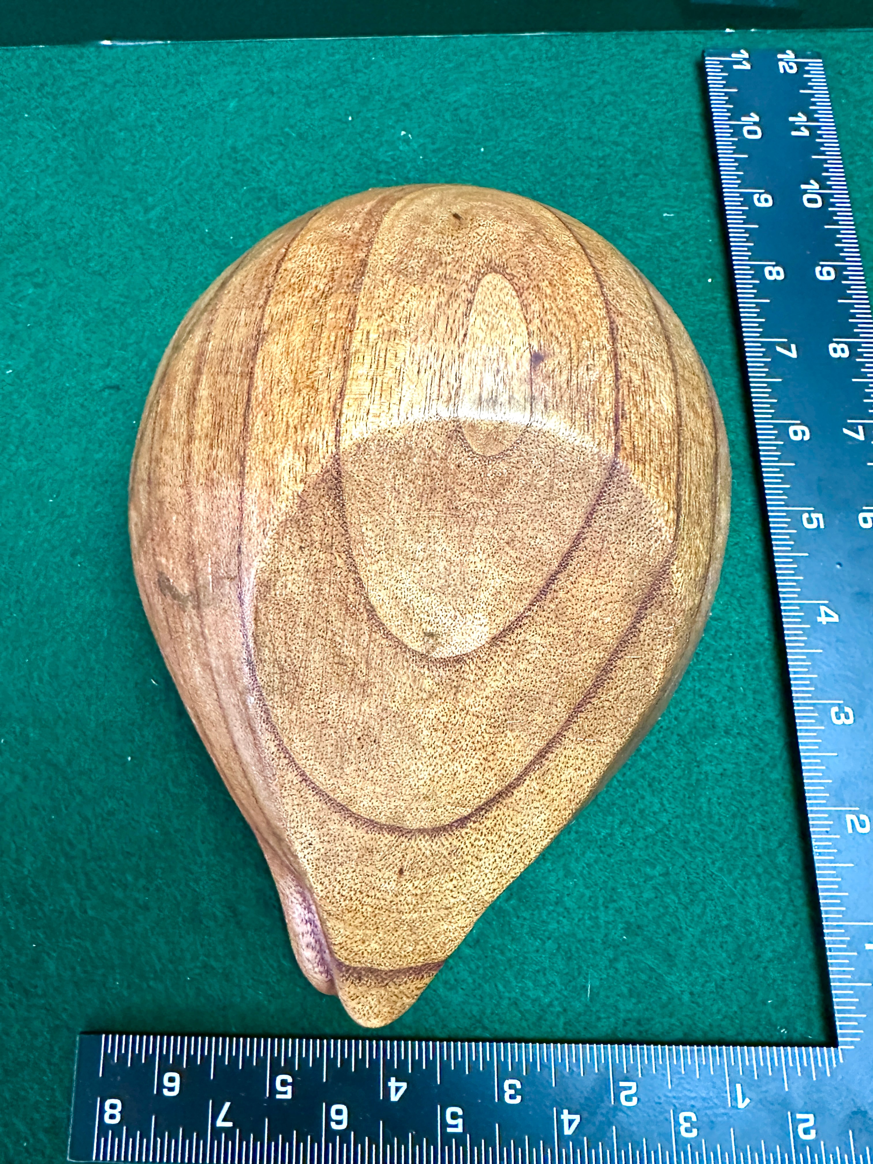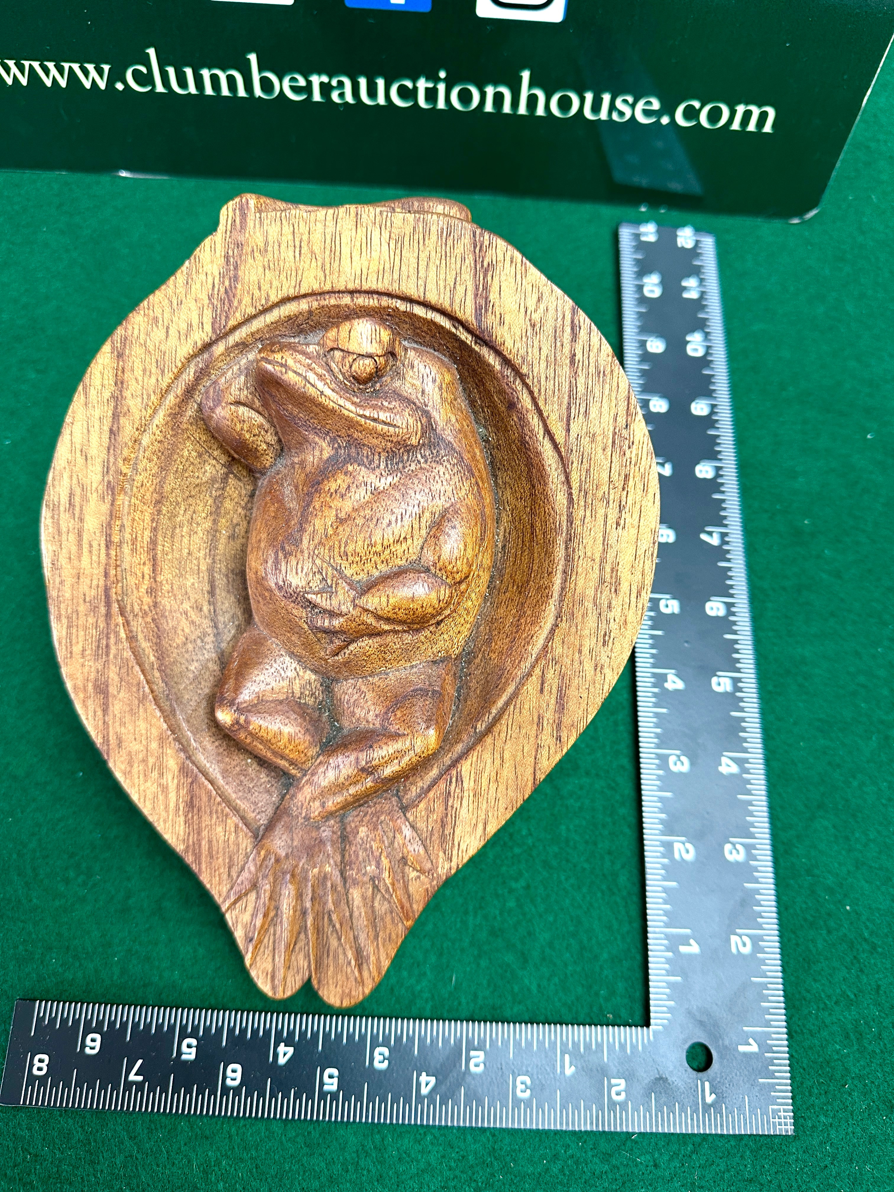 A hand carved Suar wood frog dish. This shallow decorative dish is crafted from a single piece of medium-toned hardwood, presenting an organic, stylized leaf or seed pod shape. It showcases prominent grain and a smooth finish, with a detailed high-relief carving of a frog positioned within its central depression. No specific maker’s marks or inscriptions are discernible.