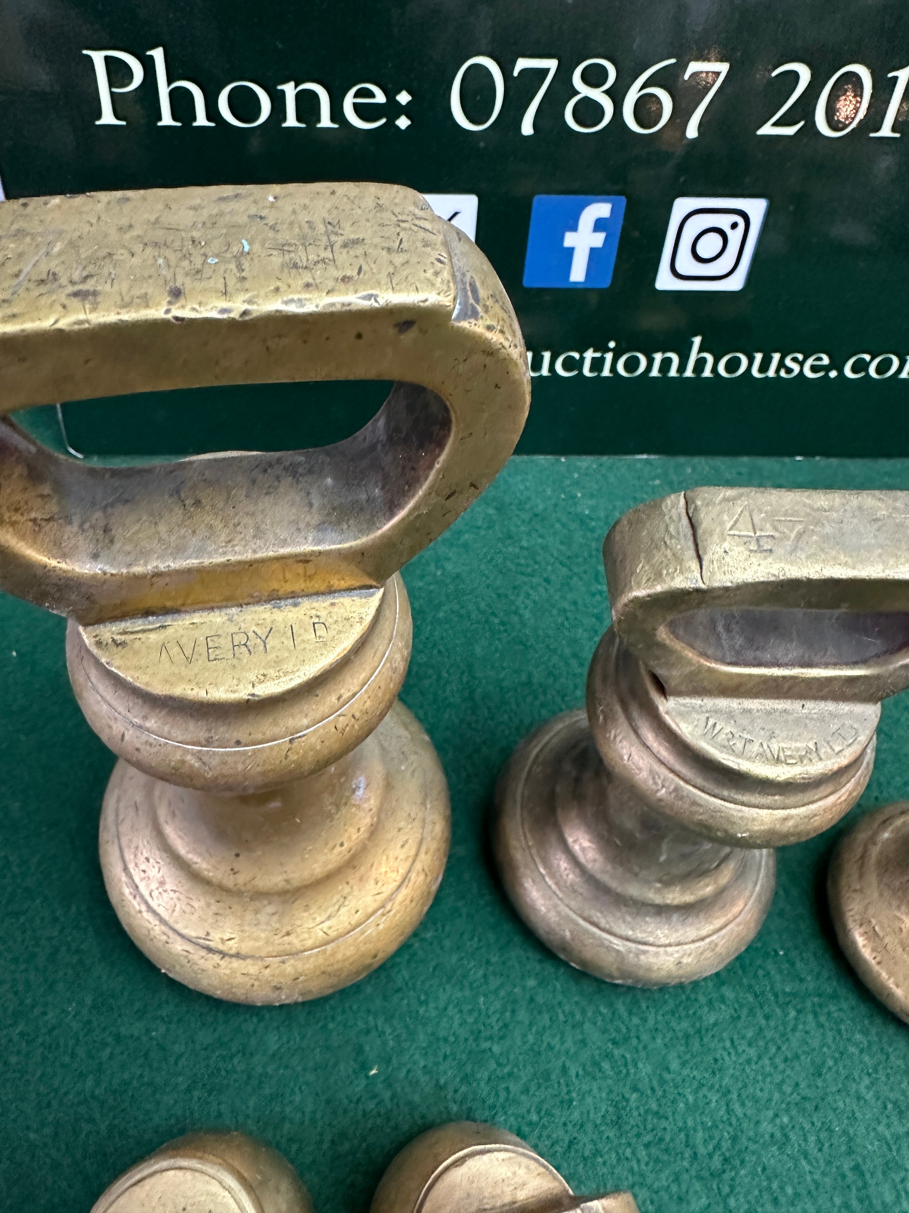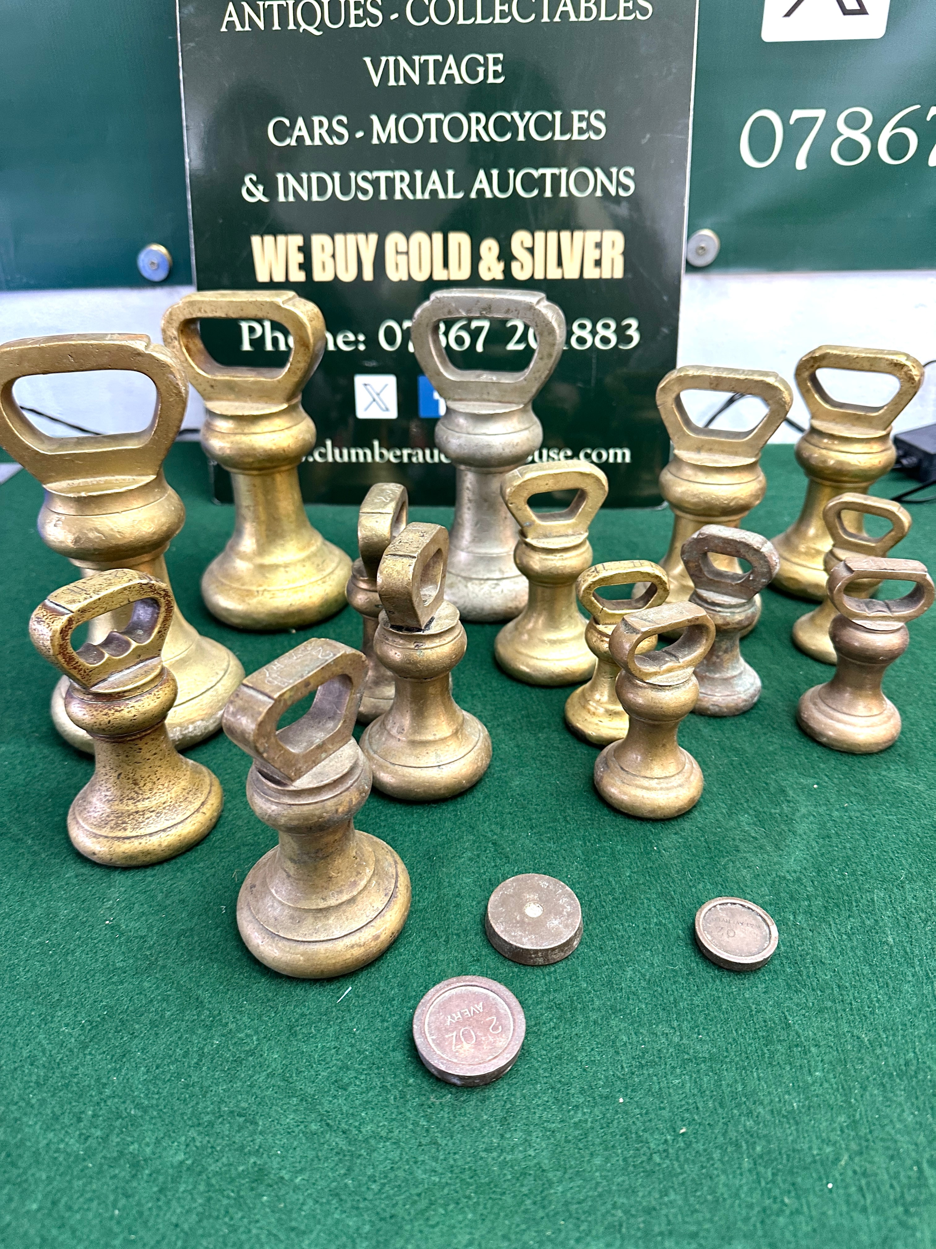 A collection of brass bell weights by W & T Avery. The lot comprises approximately fourteen weights, confirmed as 20kg brass. These weights feature traditional bell-shaped or truncated conical forms with integrated looped handles. Several bear the visible manufacturer’s mark ‘AVERY LTD’ or ‘W & T AVERY’. Accompanying the weights are three small, circular copper-alloy objects, one clearly marked ‘2 1/2’ and ‘NEW’, likely representing old coin denominations or tokens.