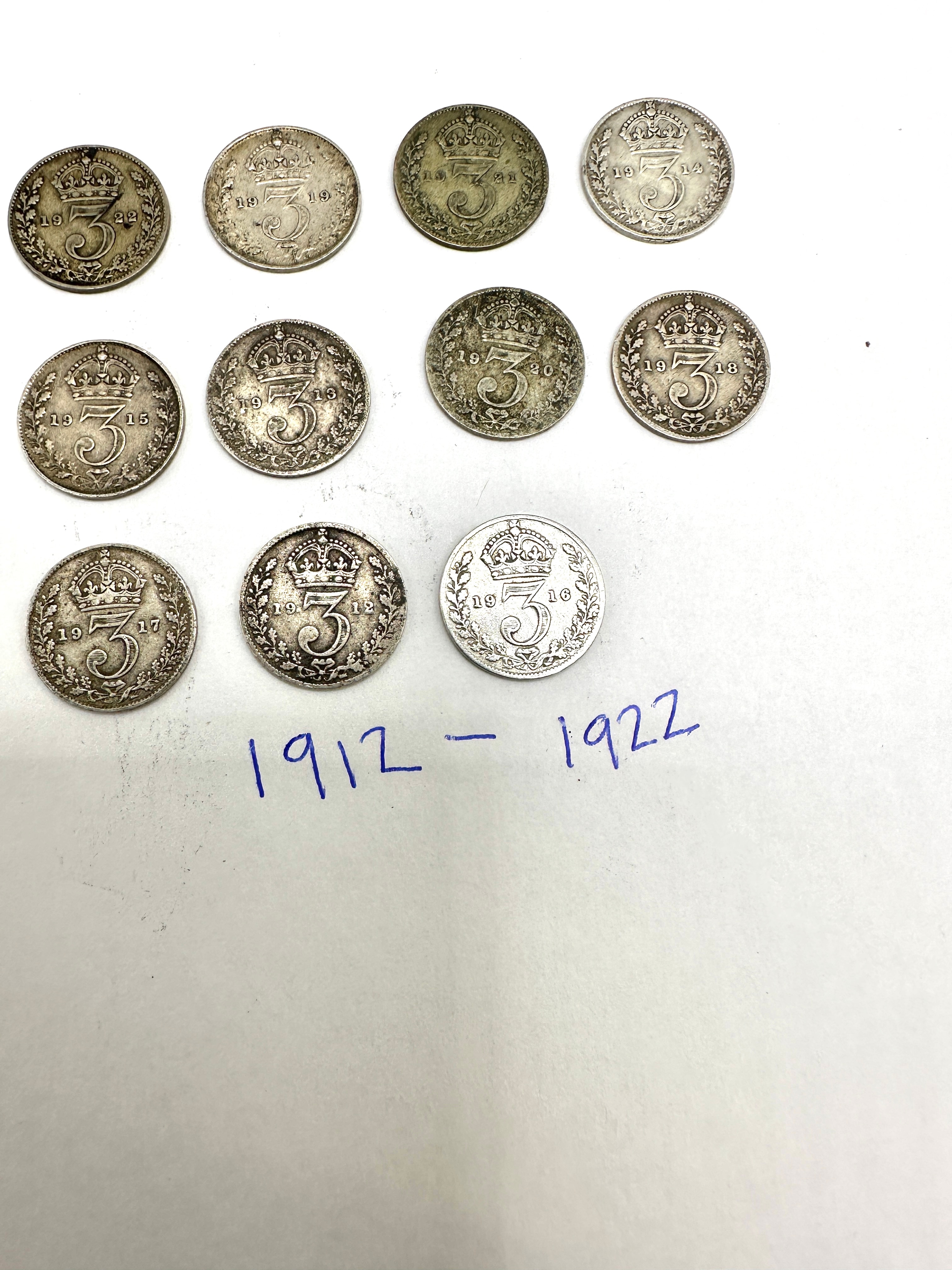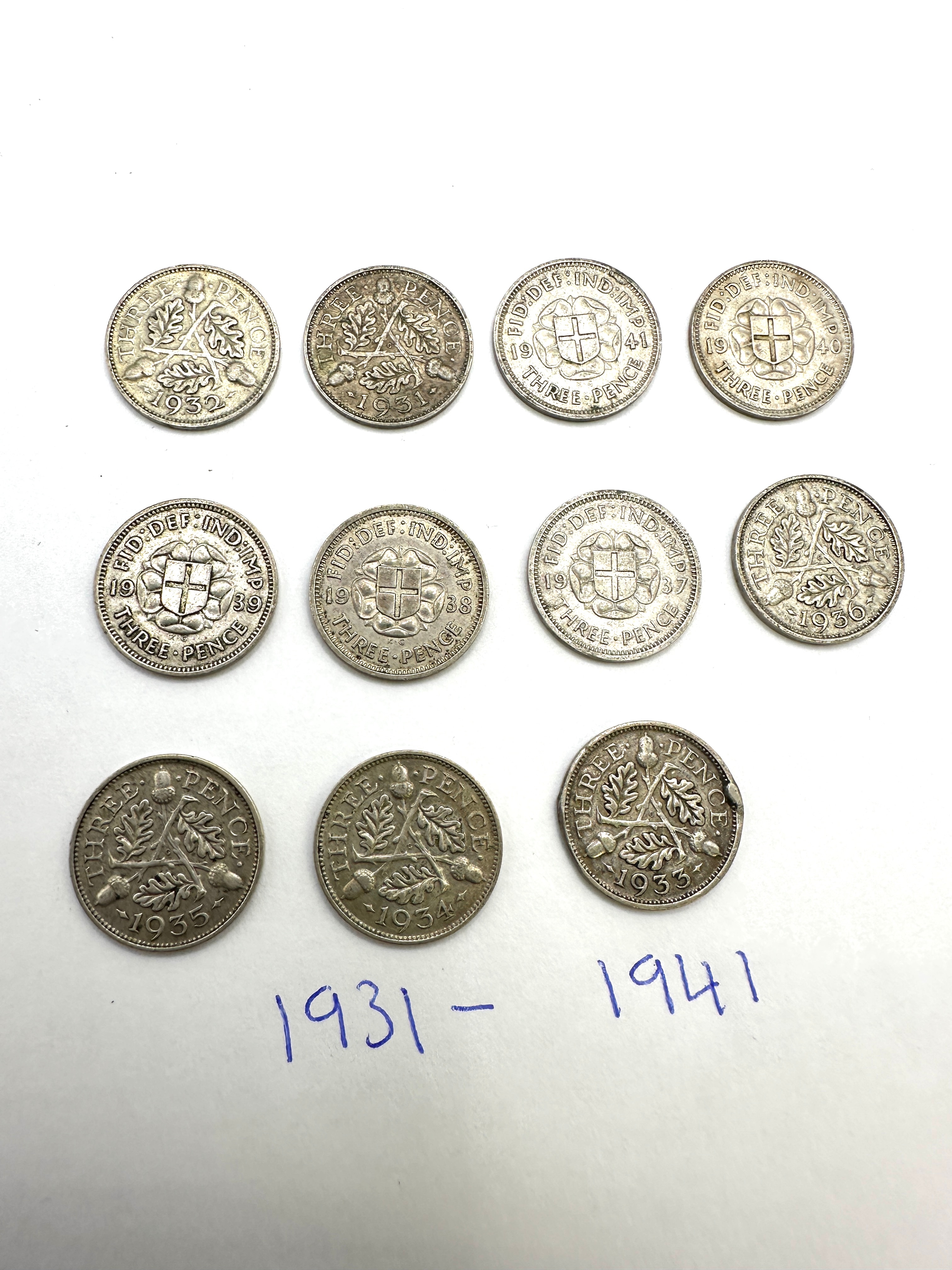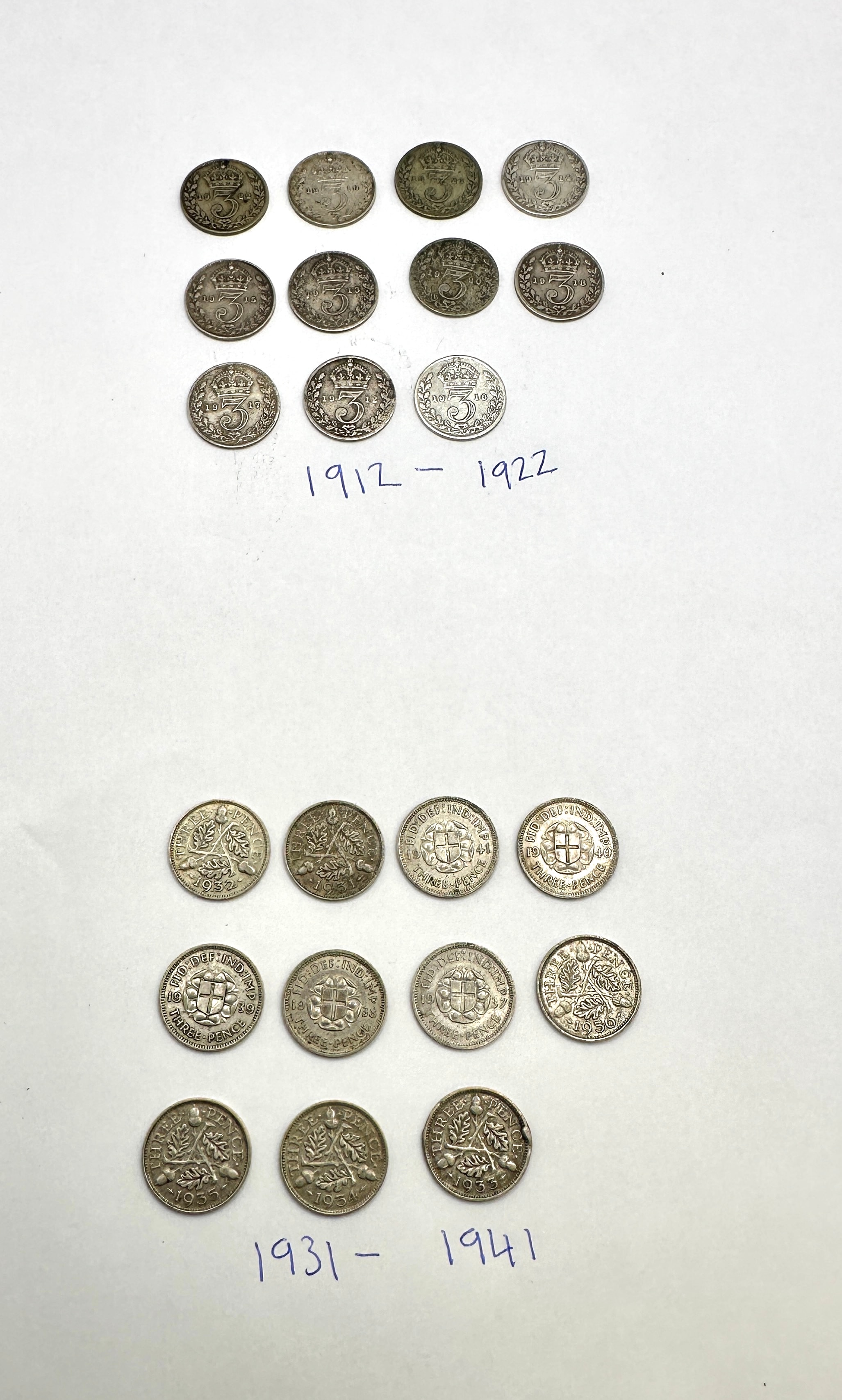 A collection of 26 British silver threepence coins, comprising two distinct groups. The first group, consisting of 15 coins dated between 1912 and 1922, features a large numeral ‘3’ surmounted by a crown on one side, consistent with George V issues. The second group of 11 coins, dated between 1931 and 1941, displays a crowned shield surrounded by the legend “FID: DEF: IND: IMP:” and “THREE PENCE” on one side, and a wreath of acorns and oak leaves on the reverse, consistent with George V and George VI issues. All coins are circular, silver-colored metal, and appear to be British Threepence pieces, with the date ranges indicating a mix of .925 sterling silver (pre-1920) and .500 silver (1920-1946) compositions.
