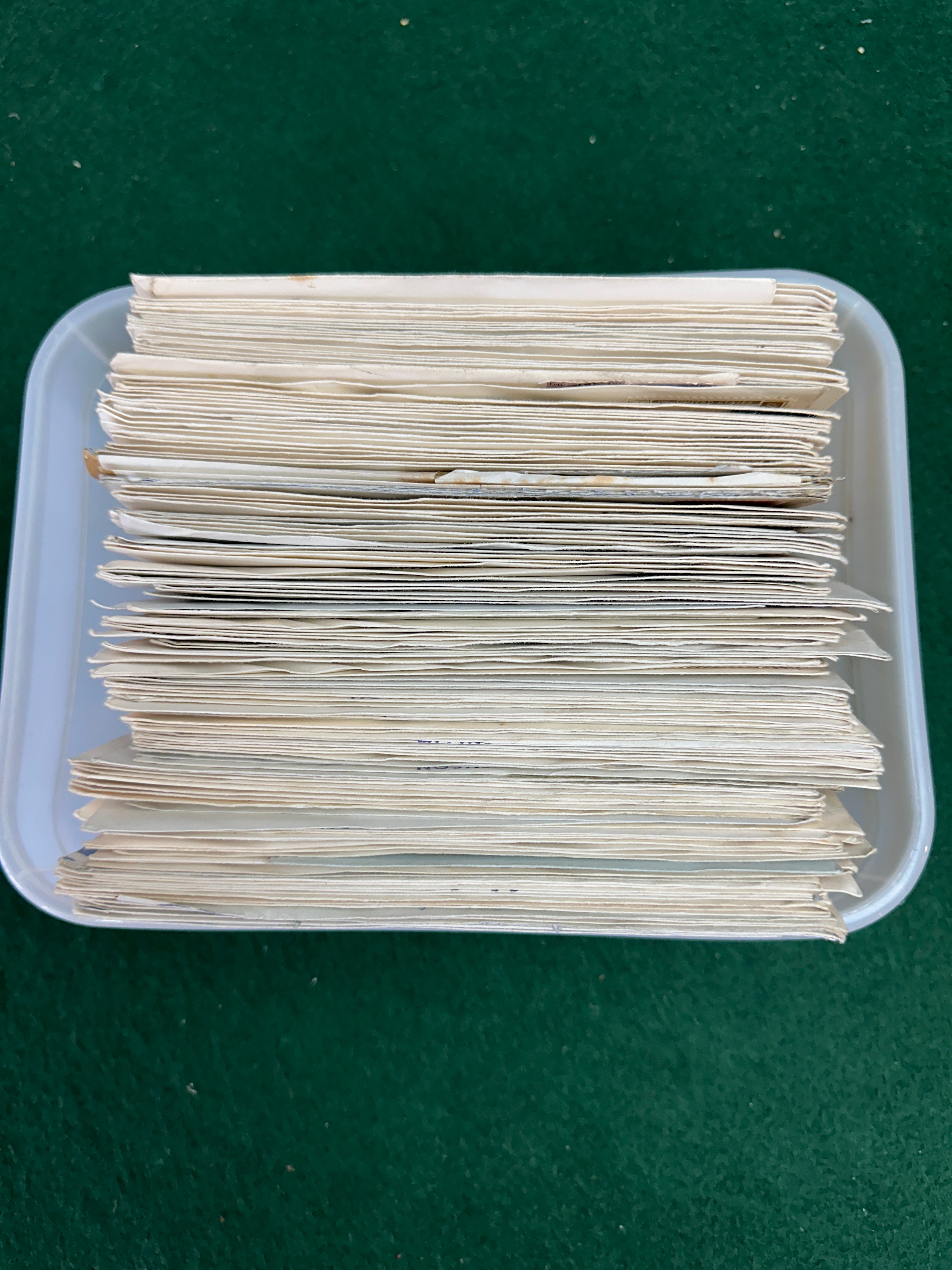 A substantial collection of Canadian First Day Covers, dating from the late 1950s into the early 1960s. The collection comprises numerous paper envelopes, each affixed with various pictorial and commemorative postage stamps. Prominent English and French markings such as “FIRST DAY OF ISSUE,” “FIRST DAY COVER,” and “JOUR PREMIER D’ÉMISSION” are displayed. Each cover features postal cancellations with specific dates and Canadian locations, including Regina, Saskatchewan, and Montreal, Quebec, along with typed or handwritten addresses to individuals. The collection is presented both spread out and neatly stacked within a plastic storage container.