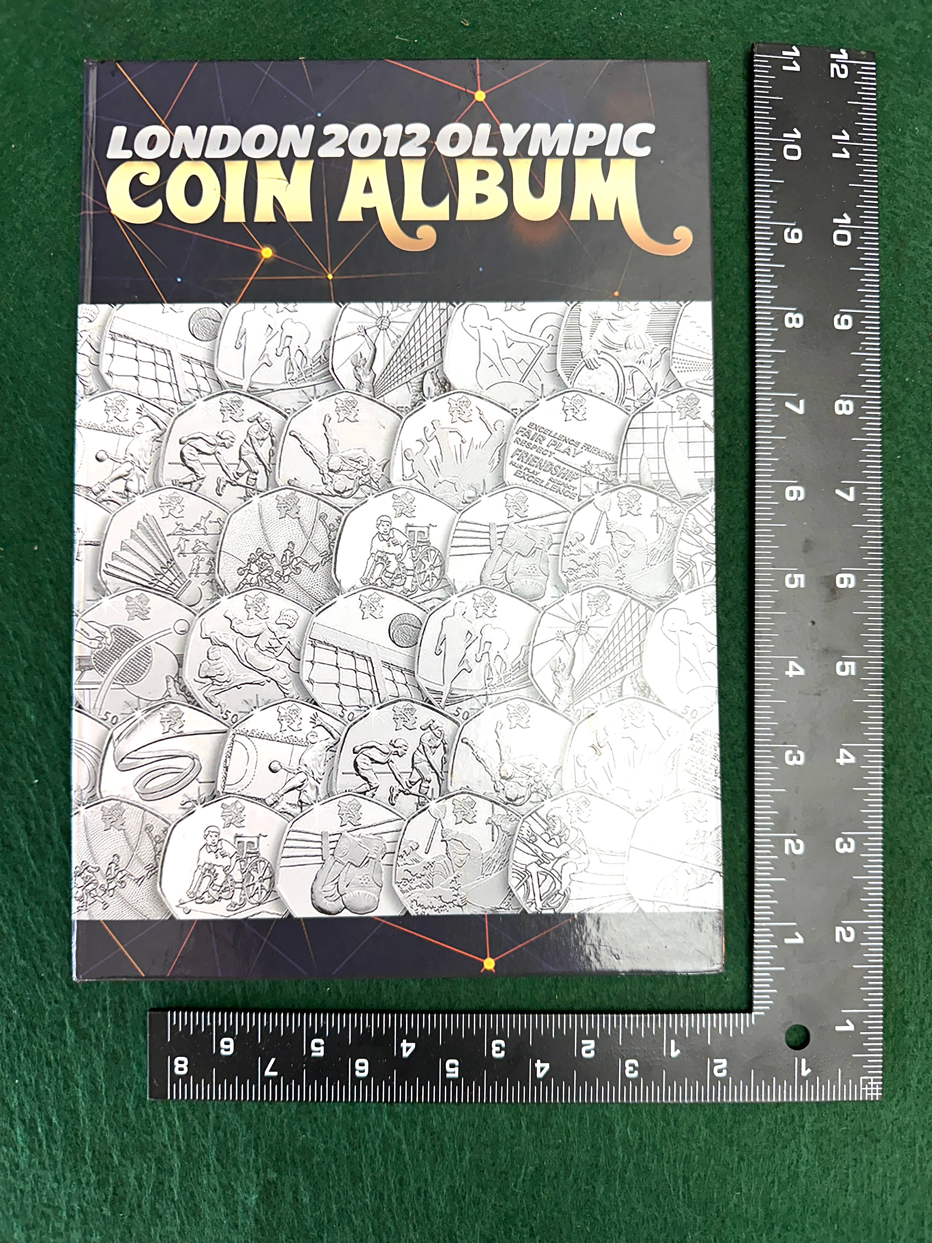 A London 2012 Olympic Coin Album, containing a collection of French 2012 commemorative coins. The album is displayed open to two pages, showcasing numerous metallic coins precisely fitted into labeled, recessed slots. The slots identify various Olympic and Paralympic sports including Aquatics, Archery, Athletics, Hockey, Judo, Modern Pentathlon, Badminton, Basketball, Boccia, Rowing, Sailing, Shooting, Boxing, Canoeing, Cycling, Table Tennis, Taekwondo, Tennis, Equestrian, Fencing, Football, Triathlon, Volleyball, Weightlifting, Goalball, Gymnastics, and Handball. A specific slot on the right page is marked “OBVERSE SIDE QUEEN ELIZABETH II.” Many of the visible coins bear the inscription “FRANCE” alongside the year “2012.”