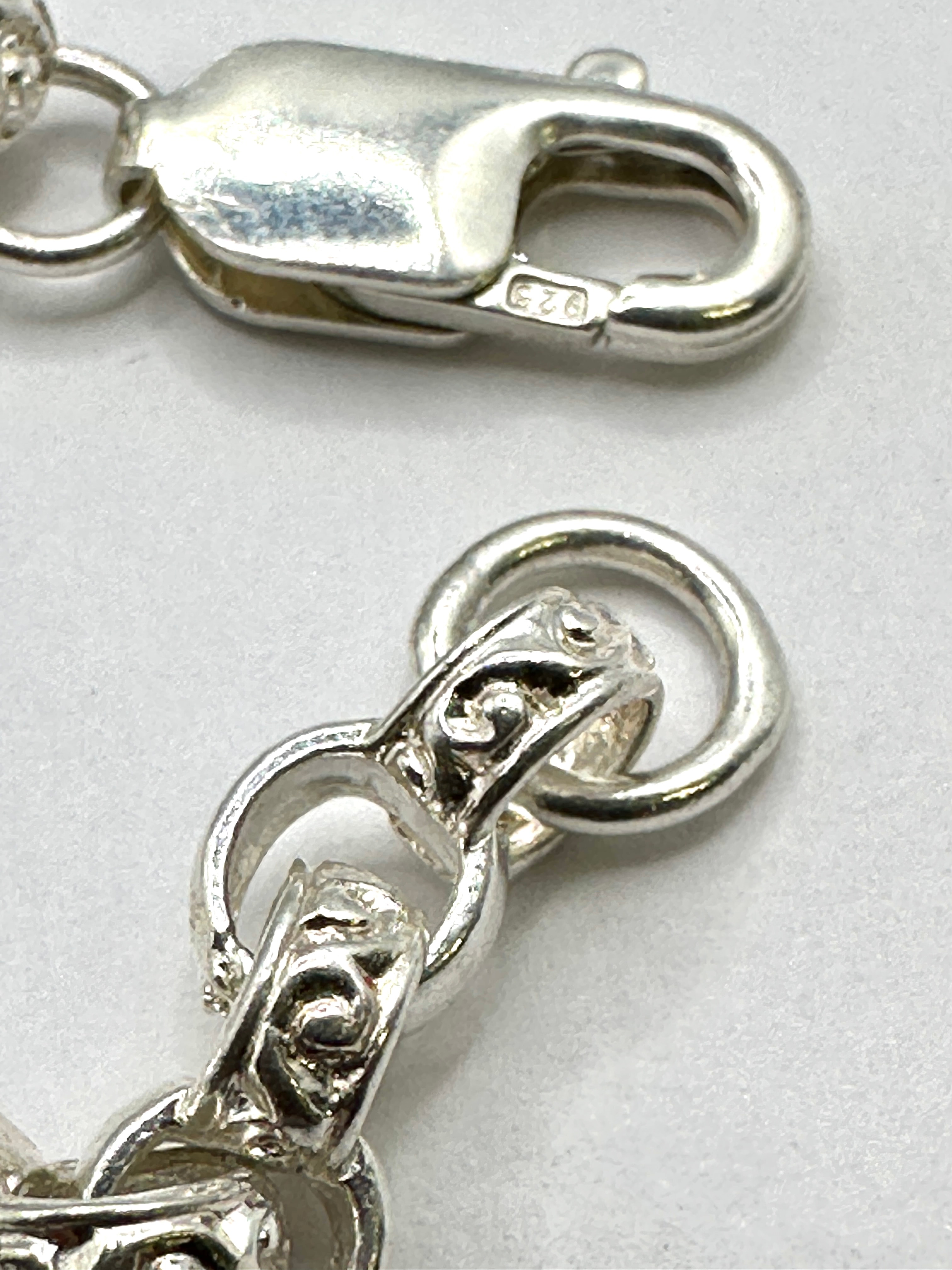 A modern 925 Sterling Silver Double Heart Belcher Bracelet. The bracelet features a rolo-style chain with a central decorative element consisting of two interlocking heart motifs, pavé-set with numerous small, round, clear colorless stones, likely cubic zirconia or rhinestones. The item’s materials are confirmed to be: “925 silver”.