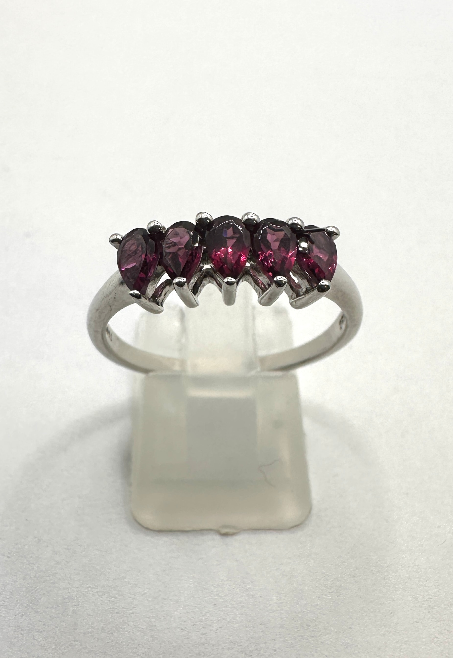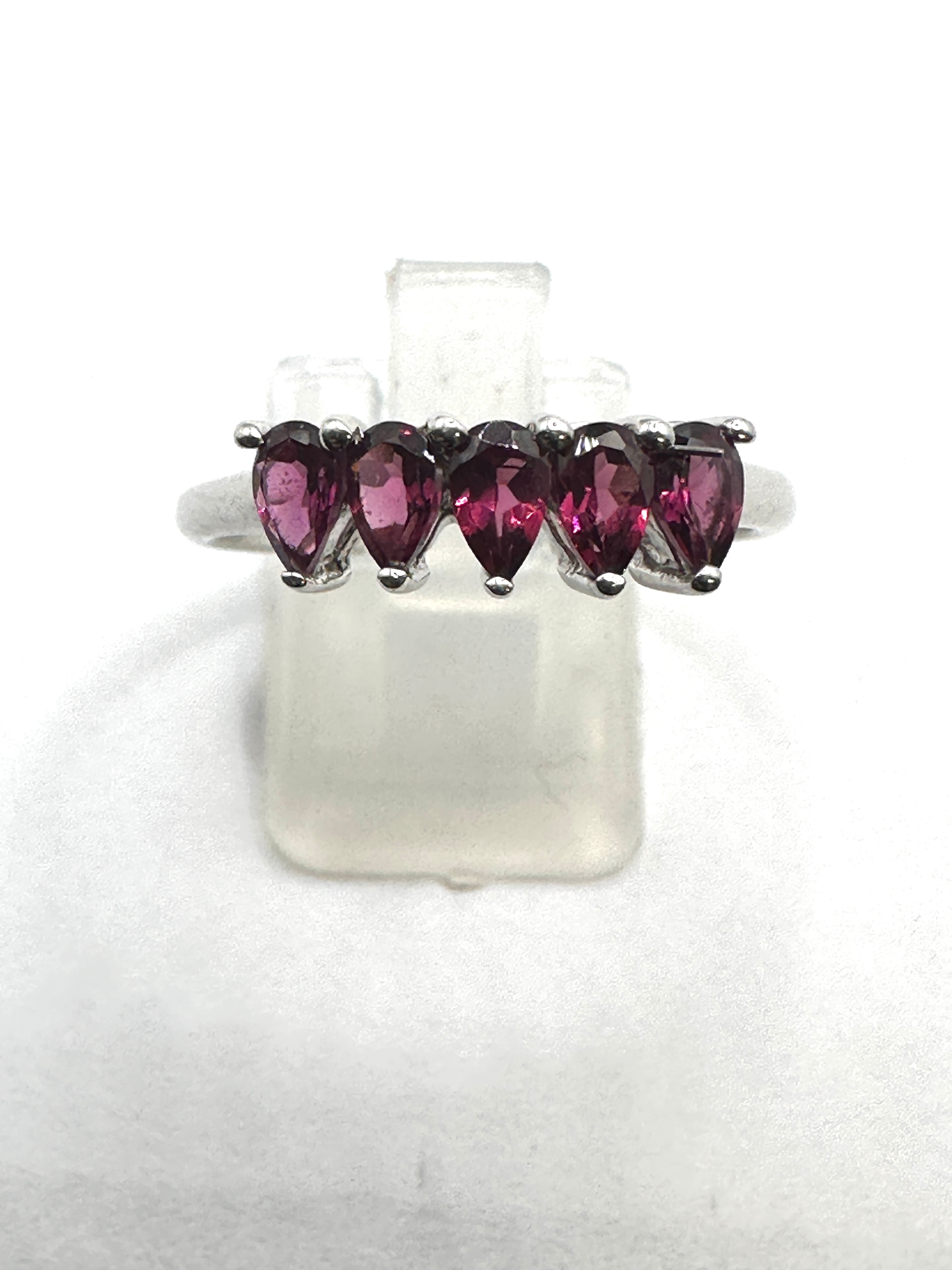 This 925 silver ring features a row of five uniformly sized, pear-shaped dark red or purplish gemstones, each individually secured by a four-prong setting across the top. The smooth, polished band shows no visible hallmarks or engravings.