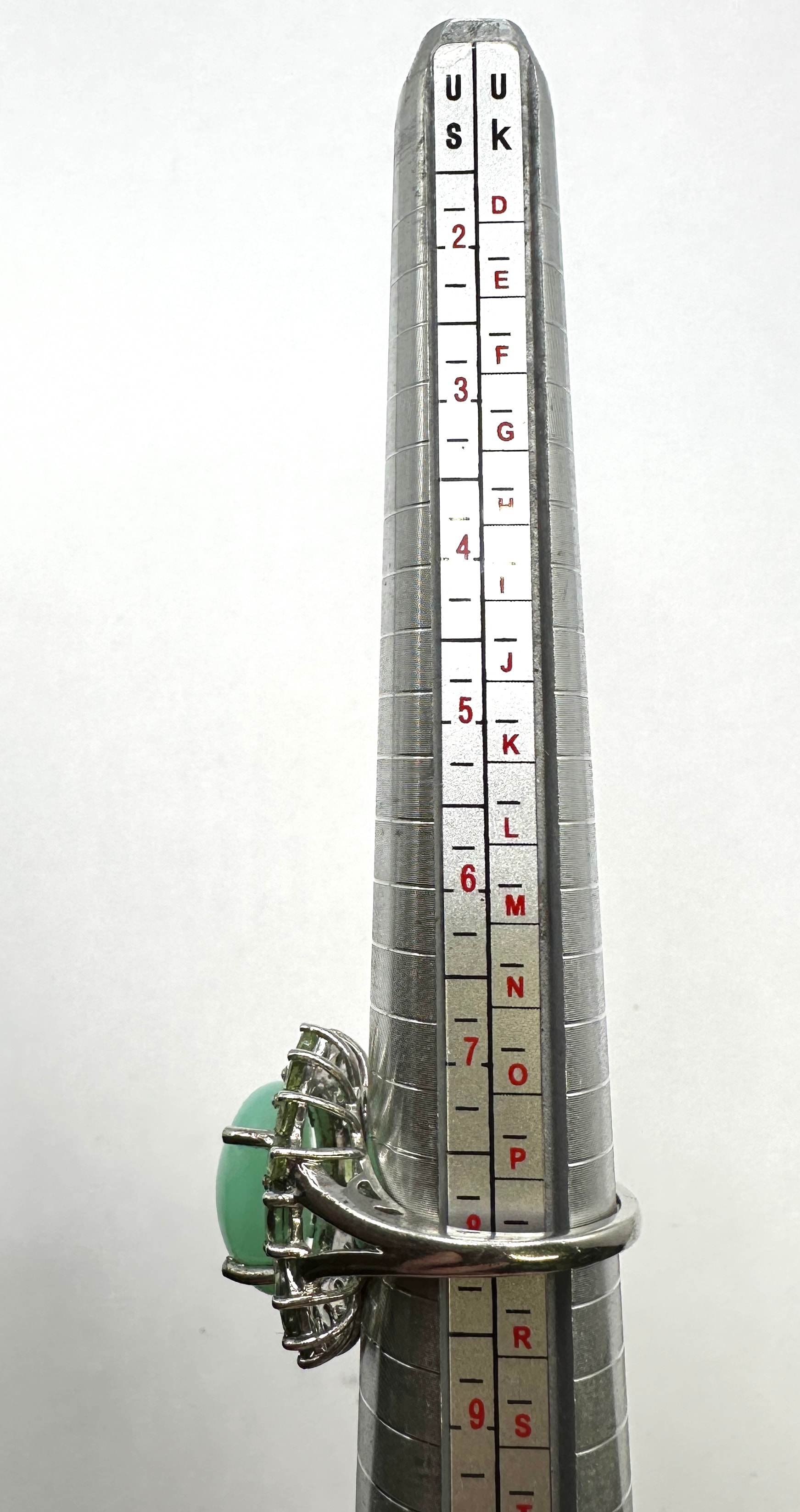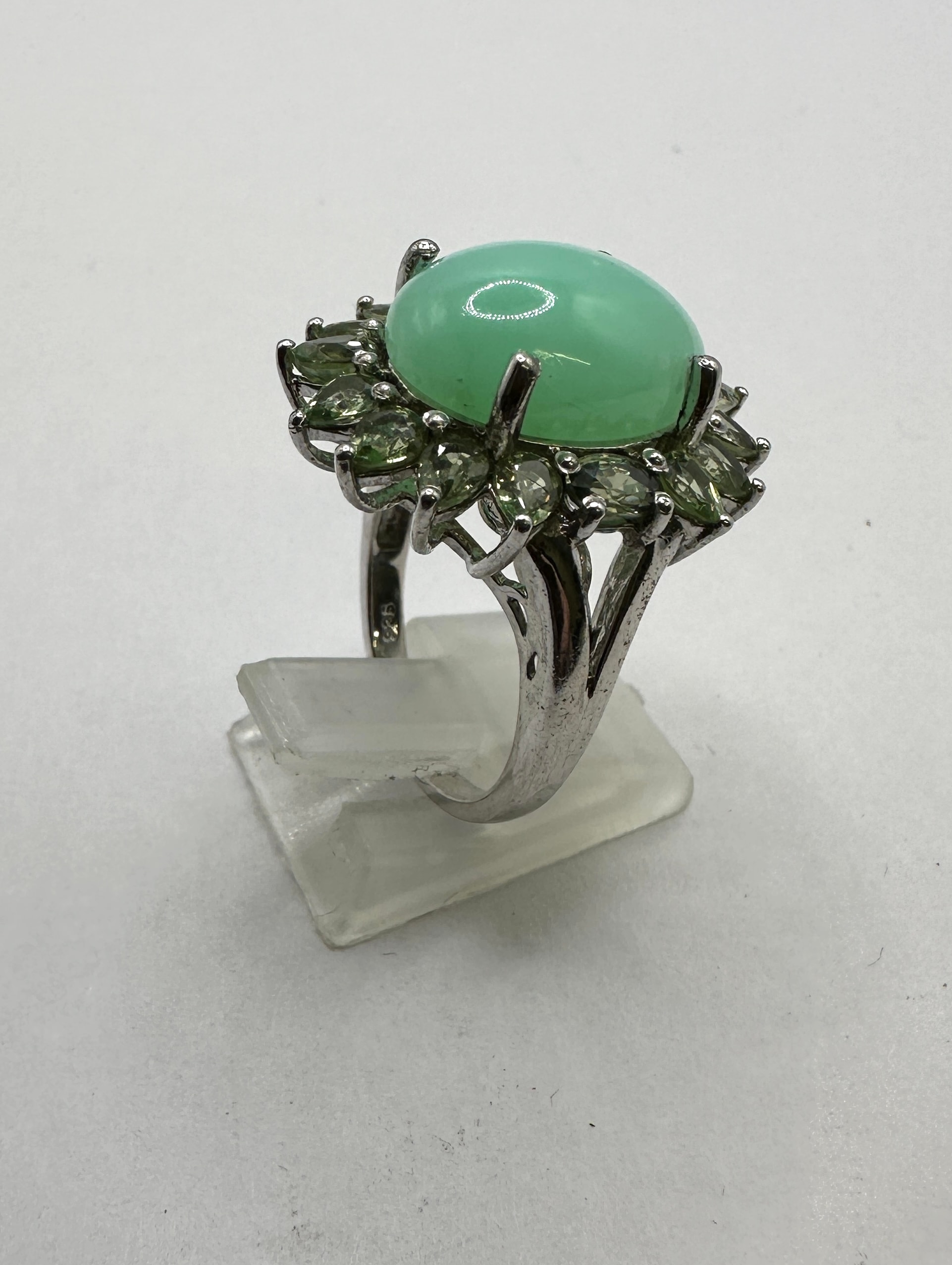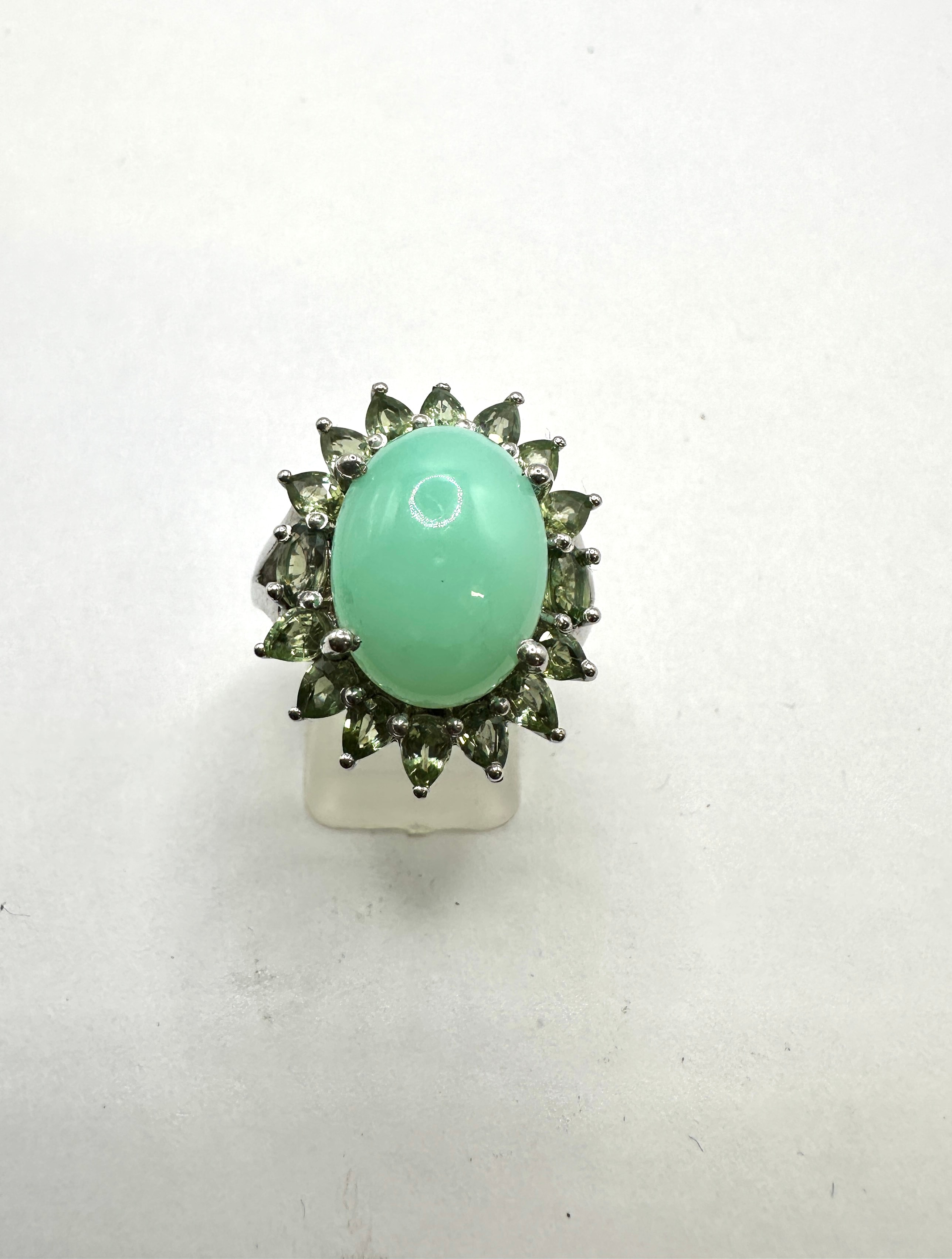 A 925 silver ring featuring a large, oval, cabochon-cut, opaque light mint green chrysoprase central stone. This primary stone is encircled by approximately eighteen smaller, faceted, marquise or navette-cut, transparent olive-green simulated gemstones, arranged in a halo style setting. No specific metal hallmarks or maker’s marks are visible on the ring itself.