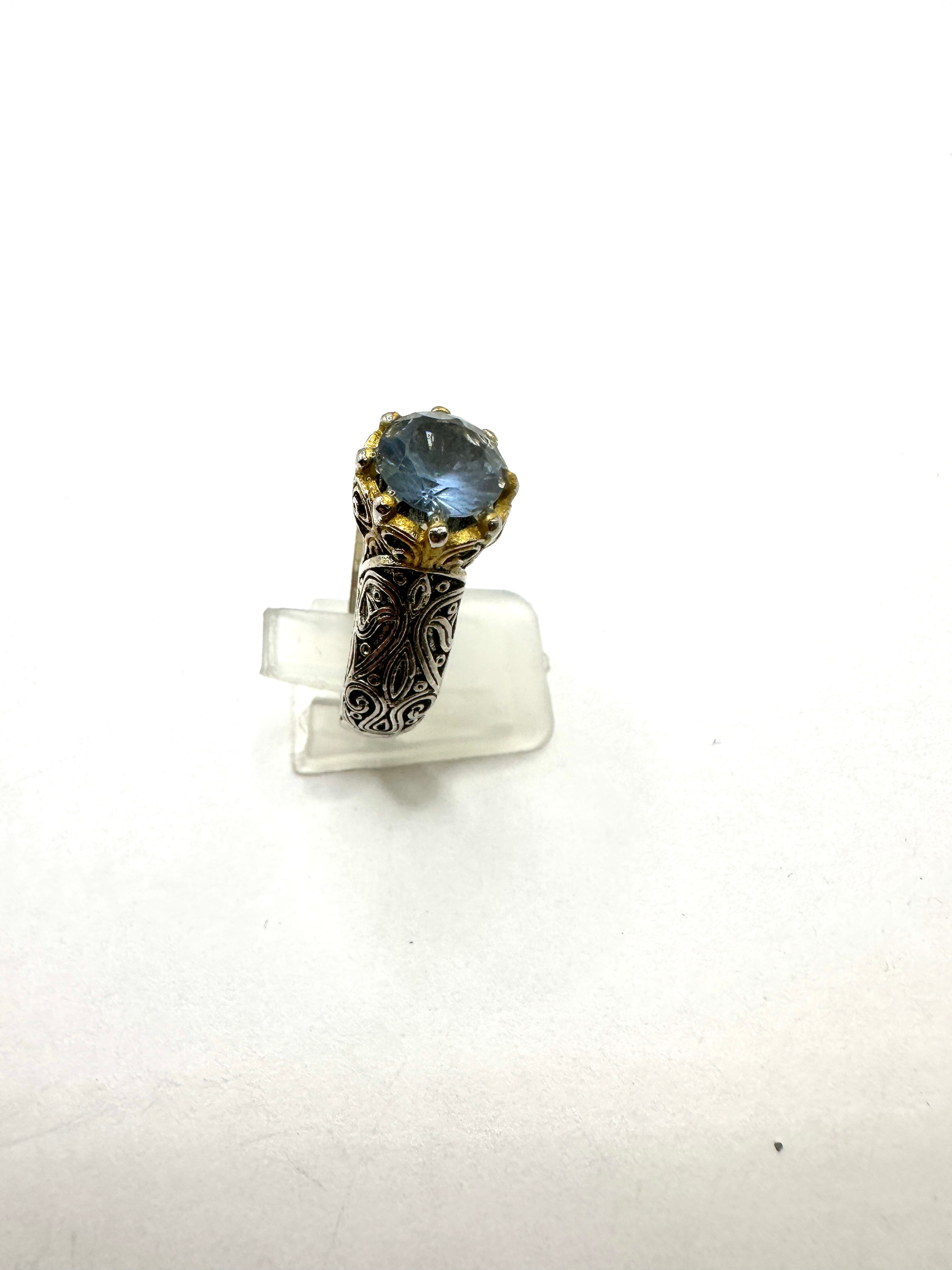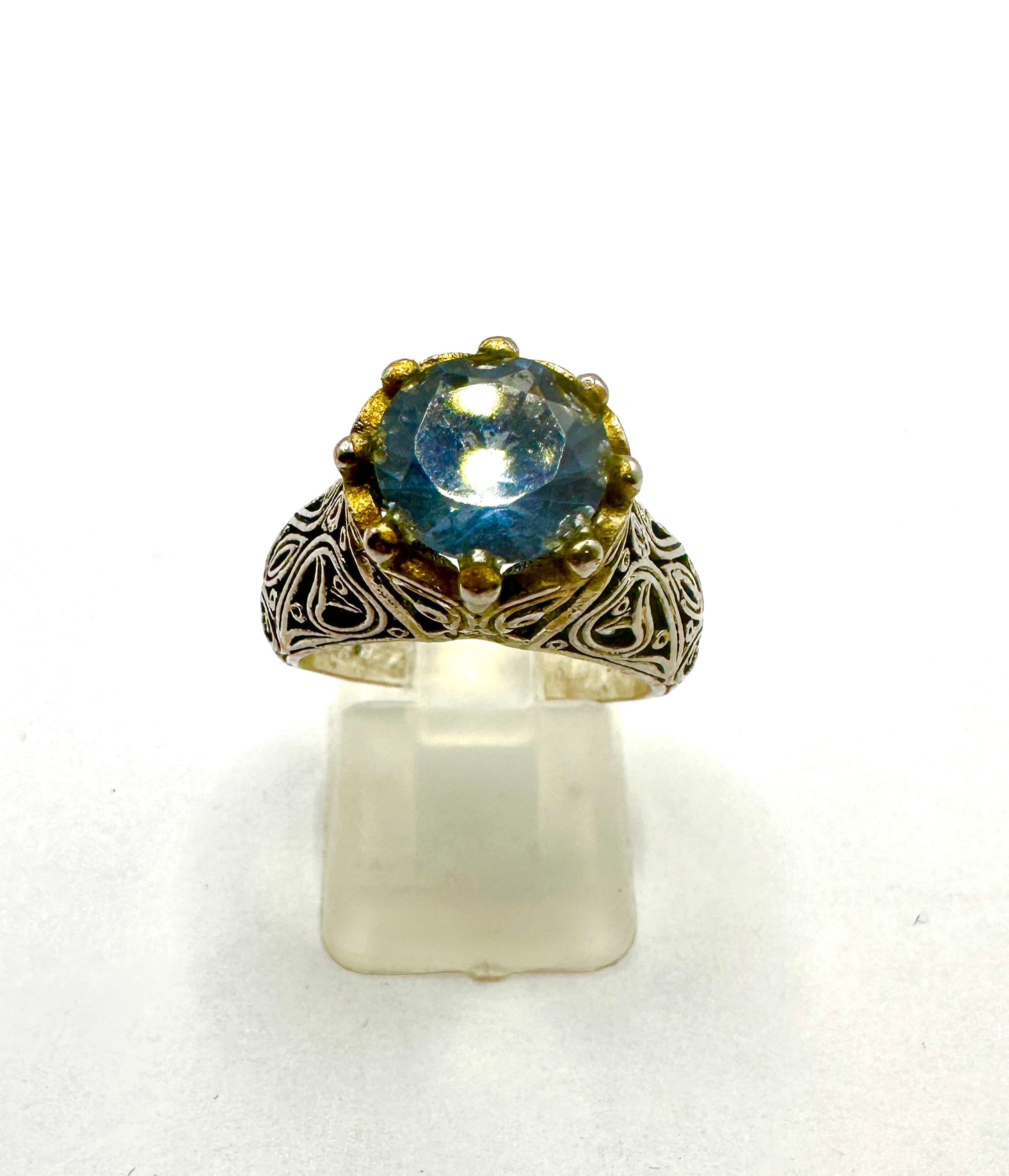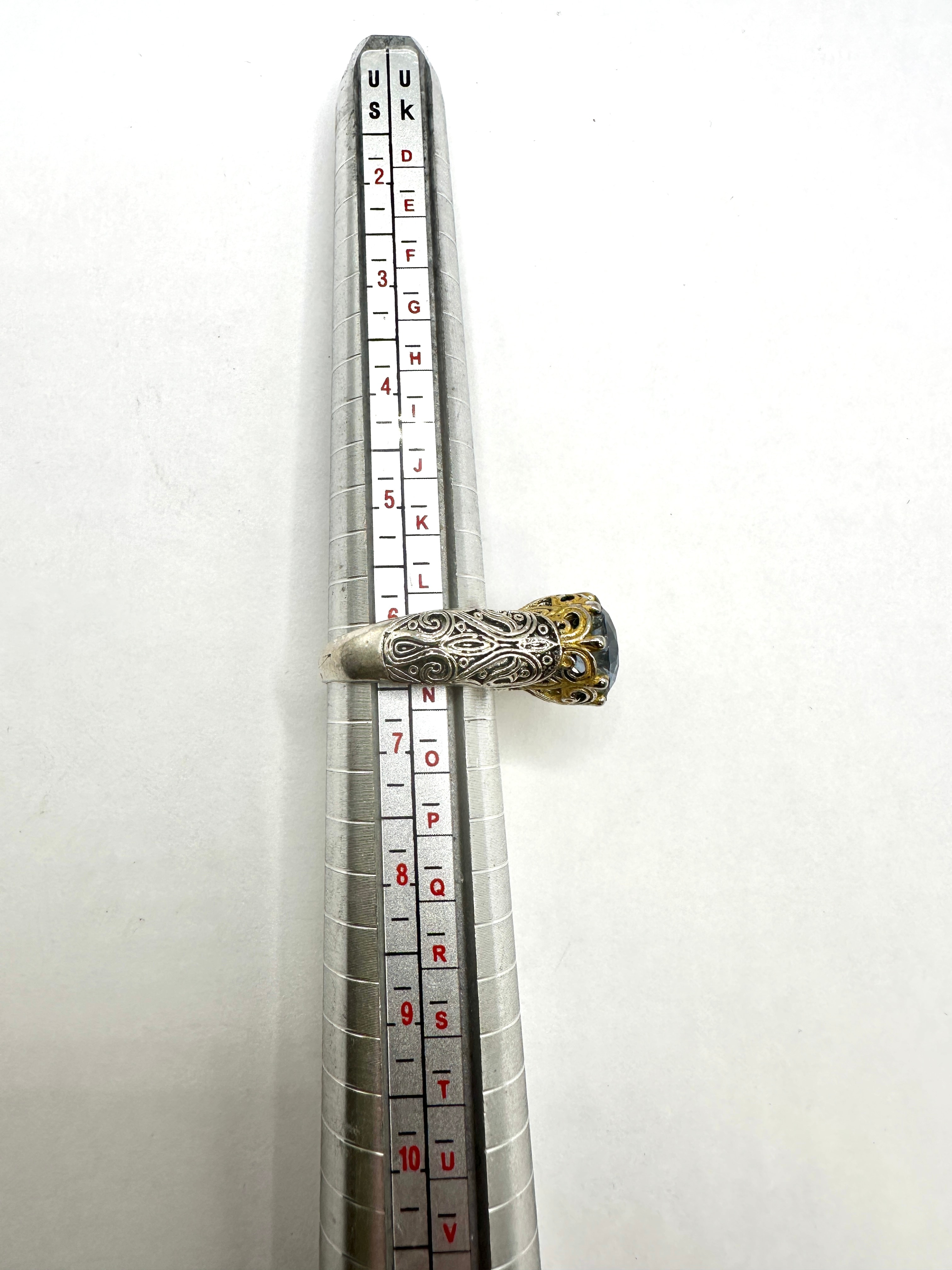 This ring features a large, faceted, oval or cushion-cut blue-green gemstone securely held by a multi-prong crown setting crafted from a yellow-toned metal. The wide band is made of 925 silver, heavily adorned with intricate, deeply carved scrolling patterns, which are highlighted by dark oxidation in the recessed areas. No specific maker’s marks or hallmarks are visible on the ring itself.
