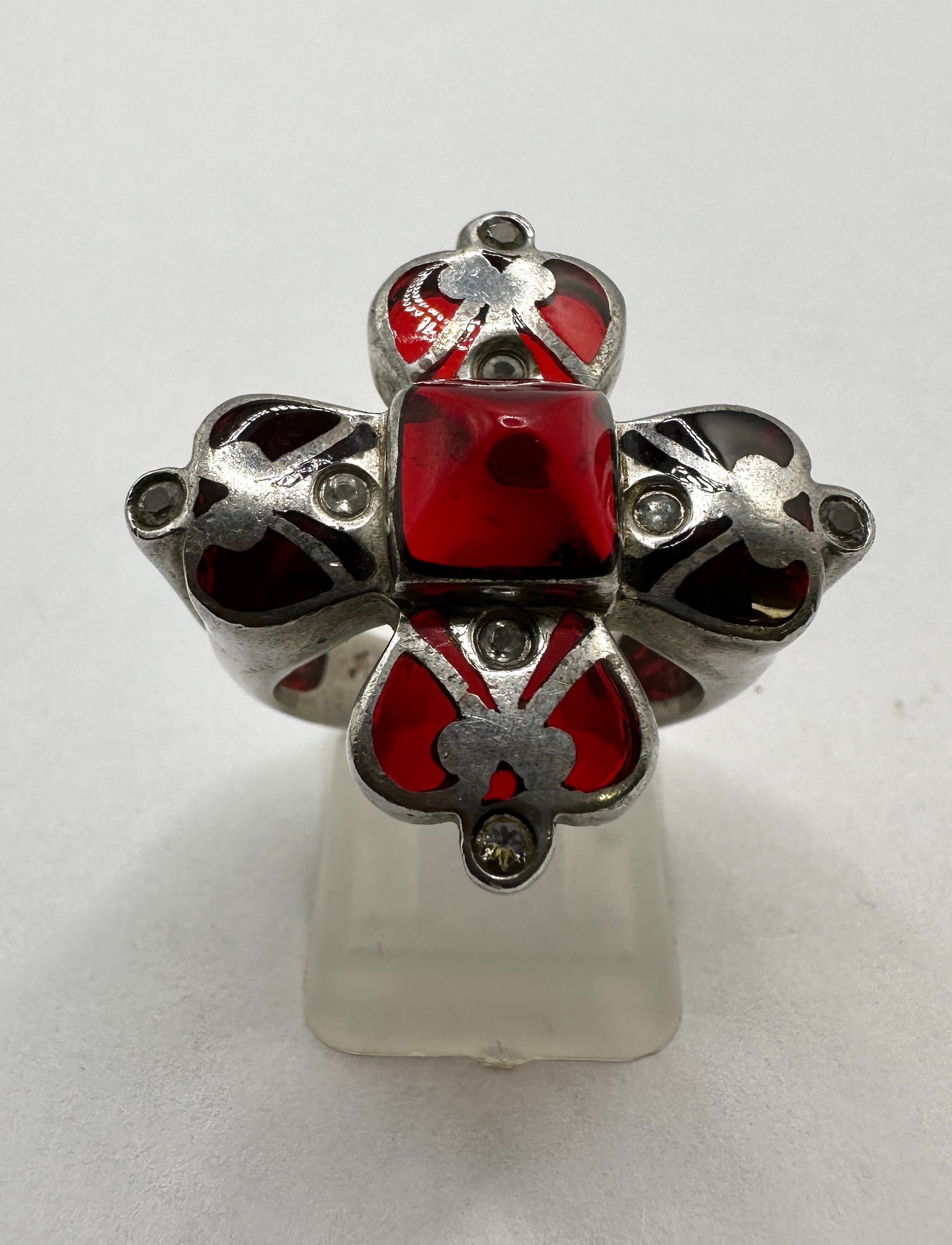 An ornate 925 silver ring featuring a decorative top with a prominent central square-cut red stone, likely glass or a simulant, set within a bezel. Surrounding this central stone are four lobe-shaped sections, each incorporating a heart-like design element filled with red enamel or resin. Small, round clear accent stones, possibly rhinestones, are strategically set around the central stone and at the tips of the decorative sections, forming an overall quatrefoil or cross-like silhouette. No visible hallmarks, maker’s marks, or other textual inscriptions are present on the ring itself.